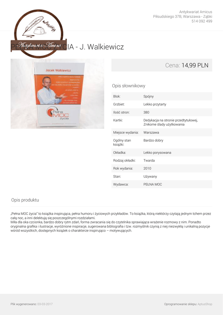 Antykwariat Amicus Piłsudskiego 37B, Warszawa - Ząbki 514 092 499 PEŁNA MOC ŻYCIA - J. Walkiewicz Cena: 14,99 PLN Opis słownikowy Blok: Spójny Grzbiet: Lekko przytarty Ilość stron: 380 Kartki: Dedykacja na stronie przedtytułowej, Znikome ślady użytkowania Miejsce wydania: Warszawa Ogólny stan książki: Bardzo dobry Okładka: Lekko porysowana Rodzaj okładki: Twarda Rok wydania: 2010 Stan: Używany Wydawca: PEŁNA MOC Opis produktu „Pełna MOC życia” to książka inspirująca, pełna humoru i życiowych przykładów. To książka, którą niektórzy czytają jednym tchem przez całą noc, a inni delektują się poszczególnymi rozdziałami. Miła dla oka czcionka, bardzo dobry rytm zdań, forma zwracania się do czytelnika sprawiająca wrażenie rozmowy z nim. Ponadto oryginalna grafika i ilustracje, wyróżnione inspiracje, sugerowana bibliografia i tzw. rozmyślnik czynią z niej niezwykłą i unikalną pozycje wśród wszystkich, dostępnych książek o charakterze inspirująco – motywujących. Plik wygenerowano: 03-03-2017 Oprogramowanie sklepu: AptusShop Antykwariat Amicus Piłsudskiego 37B, Warszawa - Ząbki 514 092 499 Galeria Plik wygenerowano: 03-03-2017 Powered by TCPDF (www.tcpdf.org) Oprogramowanie sklepu: AptusShop