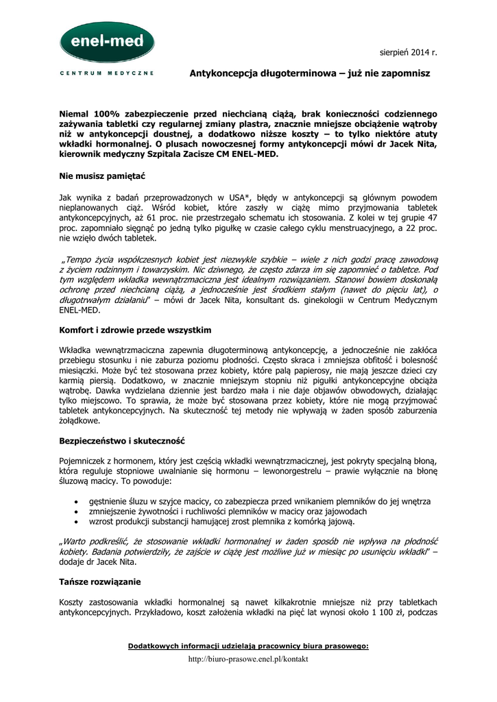 sierpień 2014 r. Antykoncepcja długoterminowa – już nie zapomnisz Niemal 100% zabezpieczenie przed niechcianą ciążą, brak konieczności codziennego zażywania tabletki czy regularnej zmiany plastra, znacznie mniejsze obciążenie wątroby niż w antykoncepcji doustnej, a dodatkowo niższe koszty – to tylko niektóre atuty wkładki hormonalnej. O plusach nowoczesnej formy antykoncepcji mówi dr Jacek Nita, kierownik medyczny Szpitala Zacisze CM ENEL-MED. Nie musisz pamiętać Jak wynika z badań przeprowadzonych w USA*, błędy w antykoncepcji są głównym powodem nieplanowanych ciąż. Wśród kobiet, które zaszły w ciążę mimo przyjmowania tabletek antykoncepcyjnych, aż 61 proc. nie przestrzegało schematu ich stosowania. Z kolei w tej grupie 47 proc. zapomniało sięgnąć po jedną tylko pigułkę w czasie całego cyklu menstruacyjnego, a 22 proc. nie wzięło dwóch tabletek. „Tempo życia współczesnych kobiet jest niezwykle szybkie – wiele z nich godzi pracę zawodową z życiem rodzinnym i towarzyskim. Nic dziwnego, że często zdarza im się zapomnieć o tabletce. Pod tym względem wkładka wewnątrzmaciczna jest idealnym rozwiązaniem. Stanowi bowiem doskonałą ochronę przed niechcianą ciążą, a jednocześnie jest środkiem stałym (nawet do pięciu lat), o długotrwałym działaniu” – mówi dr Jacek Nita, konsultant ds. ginekologii w Centrum Medycznym ENEL-MED. Komfort i zdrowie przede wszystkim Wkładka wewnątrzmaciczna zapewnia długoterminową antykoncepcję, a jednocześnie nie zakłóca przebiegu stosunku i nie zaburza poziomu płodności. Często skraca i zmniejsza obfitość i bolesność miesiączki. Może być też stosowana przez kobiety, które palą papierosy, nie mają jeszcze dzieci czy karmią piersią. Dodatkowo, w znacznie mniejszym stopniu niż pigułki antykoncepcyjne obciąża wątrobę. Dawka wydzielana dziennie jest bardzo mała i nie daje objawów obwodowych, działając tylko miejscowo. To sprawia, że może być stosowana przez kobiety, które nie mogą przyjmować tabletek antykoncepcyjnych. Na skuteczność tej metody nie wpływają w żaden sposób zaburzenia żołądkowe. Bezpieczeństwo i skuteczność Pojemniczek z hormonem, który jest częścią wkładki wewnątrzmacicznej, jest pokryty specjalną błoną, która reguluje stopniowe uwalnianie się hormonu – lewonorgestrelu – prawie wyłącznie na błonę śluzową macicy. To powoduje: gęstnienie śluzu w szyjce macicy, co zabezpiecza przed wnikaniem plemników do jej wnętrza zmniejszenie żywotności i ruchliwości plemników w macicy oraz jajowodach wzrost produkcji substancji hamującej zrost plemnika z komórką jajową. „Warto podkreślić, że stosowanie wkładki hormonalnej w żaden sposób nie wpływa na płodność kobiety. Badania potwierdziły, że zajście w ciążę jest możliwe już w miesiąc po usunięciu wkładki” – dodaje dr Jacek Nita. Tańsze rozwiązanie Koszty zastosowania wkładki hormonalnej są nawet kilkakrotnie mniejsze niż przy tabletkach antykoncepcyjnych. Przykładowo, koszt założenia wkładki na pięć lat wynosi około 1 100 zł, podczas Dodatkowych informacji udzielają pracownicy biura prasowego: http://biuro-prasowe.enel.pl/kontakt gdy stosowanie pigułek w tym samym okresie równałoby się z wydatkiem rzędu 2 700 zł (przy cenie 45 zł za opakowanie tabletek/miesiąc). Przeciwwskazania W przypadku wkładki hormonalnej, jak wszystkich innych leków, istnieją przeciwwskazania do jej stosowania w wyjątkowych przypadkach. Należą do nich między innymi: ciąża lub podejrzenie ciąży, istniejące lub nawracające stany zapalne narządów miednicy mniejszej, infekcje dróg rodnych, zapalenie szyjki macicy, dysplazja nabłonka szyjki macicy, nowotwór lub podejrzenie nowotworu szyjki lub trzonu macicy, niezdiagnozowane krwawienia z dróg rodnych, wrodzone lub nabyte nieprawidłowości w szyjce lub jamie macicy. Dlatego przed decyzją o wyborze metody antykoncepcji należy porozmawiać z lekarzem ginekologiem oraz wykonać niezbędne badania. Stosując wkładki wewnątrzmaciczne należy pamiętać, że mogą one wywoływać działania niepożądane. Dotyczy to każdej formy antykoncepcji. „ Do najczęstszych objawów należą nieznaczne i nieregularne krwawienia pojawiające się w przeciągu sześciu miesięcy od założenia wkładki. Mogą wystąpić także bóle głowy oraz mała bolesność piersi. Rzadko spotykamy się z przypadkami torbieli na jajnikach. Są to jednak zmiany niegroźne, które z czasem samoistnie zanikają ” – podkreśla konsultant ds. ginekologii CM ENEL-MED. Wkładka hormonalna to obecnie najskuteczniejsza forma antykoncepcji dostępna na rynku. Trzeba jednak pamiętać, że nie spełnia ona funkcji bariery przeciw HIV czy innym chorobom przenoszonym drogą płciową. *źródło: www.rynekzdrowia.pl Konsultacja eksperta: dr Jacek Nita, konsultant ds. ginekologii z Centrum Medycznego ENEL-MED, koordynator programu „Novum i ENEL-MED”. Należy do Polskiego Towarzystwa Ginekologicznego, Polskiego Towarzystwa Ultrasonografii oraz Polskiego Towarzystwa Ginekologii Onkologicznej. Swoja wiedzę stale poszerza biorąc udział w licznych szkoleniach oraz zjazdach. Informacje o firmie: Centrum Medyczne ENEL-MED S.A. (www.enel.pl) istnieje od 1993 roku. Od 2011 r. jest spółką notowaną na Giełdzie Papierów Wartościowych. ENEL-MED oferuje pełną obsługę medyczną, prowadzi pacjenta od konsultacji, przez diagnostykę, hospitalizację, operację, aż po rehabilitację - czyli przez cały zamknięty cykl leczenia. Na ogólnopolską sieć medyczną ENEL-MED składają się wieloprofilowe oddziały własne, zlokalizowane w Warszawie (Atrium, Arkadia, Blue City, Domaniewska, Puławska, Zacisze), Gdańsku (Grunwaldzka), Łodzi (Manufaktura), Krakowie (Galeria Krakowska), Poznaniu (Kupiec Poznański) i Wrocławiu (Arkady Wrocławskie), pięć specjalistycznych przychodni przyzakładowych (Son