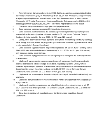 1. Administratorem danych osobowych jest MCL Spółka z ograniczoną odpowiedzialnością z siedzibą w Warszawie, przy ul. Krasińskiego 8 lok. 26, 01-601 Warszawa, zarejestrowana w rejestrze przedsiębiorców, prowadzonym przez Sąd Rejonowy dla m. st. Warszawy w Warszawie, XII Wydział Gospodarczy Krajowego Rejestru Sądowego, pod nr 0000344699, posiadająca nr NIP 5252470280, REGON 142178819, Kapitał zakładowy 10 000 zł. 2. Dostęp do danych osobowych mają tylko osoby upoważnione. 3. Dane osobowe są podawane przez Użytkowników dobrowolnie. 4. Dane osobowe przetwarzane są dla potrzeb zapewnienia prawidłowego wykonywania umowy Officer Protector (zgodnie z Ustawą z dnia 29.08.1997 roku o Ochronie Danych Osobowych; tekst jednolity: Dz. U. z 2002r. Nr 101, poz. 926 ze zm.). 5. Osoby, które dobrowolnie wyrażą zgodę na przesyłanie im informacji handlowej uzyskają także dostęp do forum portalu. W przypadku tych osób dane osobowe są przetwarzane także w celu wysłania im informacji handlowej. 6. Dane osobowe są przetwarzane na podstawie przepisu art. 23 ust. 1 pkt 1 Ustawy z dnia 29.08.1997 roku o Ochronie Danych Osobowych (Dz. U. z 2002r. Nr 101, poz. 926 ze zm.) czyli za zgodą osoby, której dotyczą. 7. Dane osobowe będą przetwarzane nie dłużej niż jest to niezbędne dla realizacji celu ich przetwarzania. 8. Użytkownik wyraża zgodę na przetwarzanie danych osobowych i politykę prywatności poprzez zaznaczenie odpowiedniego check boxa. Poprzez podpisanie Umowy Officer Protector wyrażana jest zgoda na przetwarzanie danych osobowych w zakresie niezbędnym do realizacji tej umowy (zgodnie z Ustawą z dnia 29.08.1997 roku o Ochronie Danych Osobowych; tekst jednolity: Dz. U. z 2002r. Nr 101, poz. 926 ze zm.). 9. Użytkownik ma prawo wglądu do swoich danych osobowych, żądania ich aktualizacji oraz usunięcia. 10. Dostęp do danych osobowych ma Administrator Portalu oraz podmioty nim zarządzające w jego imieniu. 11. Użytkownik powinien powstrzymać się od publikacji danych, o których mowa w art. 27 ust. 1 ustawy z dnia 29 sierpnia 1997 r. o Ochronie Danych Osobowych) Dz. U. z 2002r. Nr 101, poz. 926 ze zm.). 12. Zbiór danych osobowych został zgłoszony do Generalnego Inspektora Danych Osobowych.