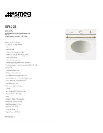 SF800B coloniale Piekarnik elektryczny, wysokość 60 cm 6 funkcji Emalia łatwoczyszcząca Ever Clean EAN13: 8017709182663 ESTETYKA / STEROWANIE Biały Złote pokrętła Programator analogowy, zegar FUNKCJE / OPCJE / TEMPERATURY 6 funkcji pieczenia Automatyczne wyłączenie Sygnał dźwiękowy zakończenia pieczenia Elektroniczne sterowanie temperaturą (50° – 250°C) WNĘTRZE 5 poziomów pieczenia Metalowe drabinki boczne Emalia łatwoczyszcząca Ever Clean Oświetlenie wnętrza: 1 lampa halogenowa Łatwy demontaż drzwi piekarnika BEZPIECZEŃSTWO Obwodowy system chłodzący 3 szyby WYPOSAŻENIE STANDARDOWE Głęboka blacha (40 mm): 1 Ruszt: 1 SPECYFIKACJA TECHNICZNA Moc przyłączeniowa: 3,0 kW Moc dużego grilla: 2,7 kW Napięcie: 220-240 V Zabezpieczenie: 13 A Częstotliwość: 50/60 Hz Functions Wersje SF800A - antracyt, złote pokrętła SF800P - kremowy, złote pokrętła SF800AVO - jasny brązowy, pokrętła z mosiądzu SF800PO - kremowy, pokrętła z mosiądzu SF800AO - antracyt, pokrętła z mosiądzu SMEG S.p.A. Via Leonardo da Vinci, 4 42016 Guastalla (RE) Tel. 0522 821 1 SF800B coloniale z obiegiem powietrza 60 cm biały klasa energochłonności A elektryczne Klasa A: Klasa A piekarnika zapewnia niskie zużycie energii. POTRÓJNIE OSZKLONE DRZWI: Zewnętrzna powierzchnia nawet podczas długiego pieczenia pozostaje zimna, co zapewnia maksymalne bezpieczeństwo użytkowania. Natomiast dwie wewnętrzne szyby odbijają ciepło, co ma znaczenie dla efektywności używanej energii. POZIOMY PIEKARNIKA: Piekarniki firmy SMEG z maksymalna pojemnością 72 litrów posiadają 5 poziomów, co zapewnia maksymalną elastyczność w użytkowaniu. Pozwala to na oszczędność czasu potrzebnego do przyrządzenia kilku potraw w tym samym czasie albo konieczności przygotowania dużych ilości. DEMONTOWALNE SZKŁO WEWNĘTRZNE: W większości piekarników firmy SMEG szkło wewnątrz drzwi jest łatwe w demontażu, co również znacznie ułatwia utrzymanie w czystości urządzenia. JEDNOLITE SZKŁO WEWNĘTRZNE: W większości piekarników firmy SMEG zainstalowane w drzwiach szkło wewnętrzne posiada wyjątkowo gładką powierzchnię, bez żadnych wkrętów, co znacznie ułatwia utrzymanie w czystości urządzenia. STATYCZNY SYSTEM CHŁODZENIA: Innowacyjny STATYCZNY system chłodzenia pomaga chronić meble od nadmiernej temperatury podczas pracy urządzenia. MAKSYMALNA POJEMNOŚĆ: Niektóre modele piekarników firmy SMEG posiadają pojemność netto 72 litrów (79 l brutto) – tj. o 35% większej od standardowej pojemności. Zwiększenie pojemności powoduje zwiększenie liczby poziomów pieczenia do pięciu. EMALIA ŁATWOCZYSZCZĄCA EVER CLEAN: Emalia, którą jest pokryte wnętrze piekarników. Jest niezwykle łatwa w czyszczeniu, ze względu na znikomą interakcję z tłuszczami i odporność na różne kwasy. WENTYLATOR, GRZAŁKA GÓRNA I DOLNA: Grzałki w połączeniu z wentylatorem zapewniają równomierną temperaturę w całej komorze. Jest to metoda dająca podobne efekty do pieczenia tradycyjnego. Mniej wydajna od użycia wentylatora i 3 grzalek. Najlepsza do wypieku ciast. WENTYLATOR, GRZAŁKA DOLNA: Dodanie dolnej grzałki do wymuszonego obiegu podnosi temperaturę w dolnej części potrawy, zapewniając jej skuteczniejsze pieczenie środka bez przypiekania powierzchni. GRZAŁKA GÓRNA I DOLNA: Włączenie tych 2 grzałek stosuje się w pieczeniu tradycyjnym, odpowiednim do przygotowanie potraw wymagających delikatnego podgrzewania, jak np. pieczenie ciasta. Piekarnik powinien zostać wstępnie nagrzany do wymaganej temperatury, a naczynie ustawione po środku. Jest to metoda , która najlepiej sprawdza się w przypadku większych, pojedynczych wypieków. ECO: Ustawienie ECO pozwala na szybkie wstępne podgrzanie piekarnika. Włączenie dolnej grzałki, grzałki grilla i wentylatora zapewnienia optymalną wydajność. Funkcja jest użyteczna w połączeniu z wybranym zasadniczym programem pieczenia. WENTYLATOR I GRZAŁKA GRILLA: Pieczenie przy uzyciu tej funkcji musi przebiegać przy zamkniętych drzwiczkach. Wentylator łagodzi silne grzanie grilla, jednocześnie zapewniając doskonałe grillowanie bez potrzeby odwracania pieczonej potrawy. Otrzymujemy potrawę doskonale przypieczoną, a zarazem soczystą. Najlepsze efekty zapewnia pieczenie na dwóch górnych półkach. Dolna część piekarnika może być w tym czasie wykorzystana do podgrzania innych potraw. GRZAŁKA GRILLA: Funkcja uzywana do szybkiego podgrzewania. Aby uzyskać najlepsze rezultaty należy małe potrawy umieścić na górnej półce, a potrawy większe - na dolnej (np. mięso, lub kiełbasę). Najlepsze efekty uzyskuje się przy zamkniętych drzwiczkach, chyba że przepis podpowiada co innego. SMEG S.p.A. Via Leonardo da Vinci, 4 42016 Guastalla (RE) Tel. 0522 821 1 SF800B coloniale z obiegiem powietrza 60 cm biały klasa energochłonności A elektryczne SMEG S.p.A. Via Leonardo da Vinci, 4 42016 Guastalla (RE) Tel. 0522 821 1