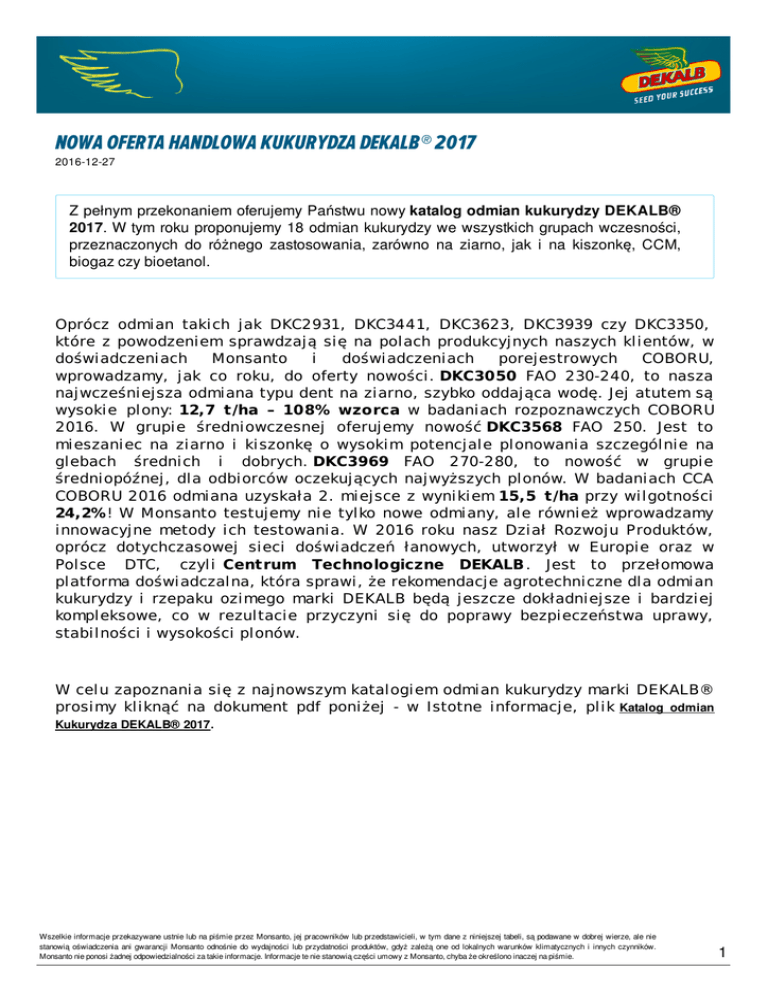NOWA OFERTA HANDLOWA KUKURYDZA DEKALB® 2017 2016-12-27 Z pełnym przekonaniem oferujemy Państwu nowy katalog odmian kukurydzy DEKALB® 2017. W tym roku proponujemy 18 odmian kukurydzy we wszystkich grupach wczesności, przeznaczonych do różnego zastosowania, zarówno na ziarno, jak i na kiszonkę, CCM, biogaz czy bioetanol. Oprócz odmian takich jak DKC2931, DKC3441, DKC3623, DKC3939 czy DKC3350, które z powodzeniem sprawdzają się na polach produkcyjnych naszych klientów, w doświadczeniach Monsanto i doświadczeniach porejestrowych COBORU, wprowadzamy, jak co roku, do oferty nowości. DKC3050 FAO 230-240, to nasza najwcześniejsza odmiana typu dent na ziarno, szybko oddająca wodę. Jej atutem są wysokie plony: 12,7 t/ha – 108% wzorca w badaniach rozpoznawczych COBORU 2016. W grupie średniowczesnej oferujemy nowość DKC3568 FAO 250. Jest to mieszaniec na ziarno i kiszonkę o wysokim potencjale plonowania szczególnie na glebach średnich i dobrych. DKC3969 FAO 270-280, to nowość w grupie średniopóźnej, dla odbiorców oczekujących najwyższych plonów. W badaniach CCA COBORU 2016 odmiana uzyskała 2. miejsce z wynikiem 15,5 t/ha przy wilgotności 24,2%! W Monsanto testujemy nie tylko nowe odmiany, ale również wprowadzamy innowacyjne metody ich testowania. W 2016 roku nasz Dział Rozwoju Produktów, oprócz dotychczasowej sieci doświadczeń łanowych, utworzył w Europie oraz w Polsce DTC, czyli Centrum Technologiczne DEKALB . Jest to przełomowa platforma doświadczalna, która sprawi, że rekomendacje agrotechniczne dla odmian kukurydzy i rzepaku ozimego marki DEKALB będą jeszcze dokładniejsze i bardziej kompleksowe, co w rezultacie przyczyni się do poprawy bezpieczeństwa uprawy, stabilności i wysokości plonów. W celu zapoznania się z najnowszym katalogiem odmian kukurydzy marki DEKALB® prosimy kliknąć na dokument pdf poniżej - w Istotne informacje, plik Katalog odmian Kukurydza DEKALB® 2017. Wszelkie informacje przekazywane ustnie lub na piśmie przez Monsanto, jej pracowników lub przedstawicieli, w tym dane z niniejszej tabeli, są podawane w dobrej wierze, ale nie stanowią oświadczenia ani gwarancji Monsanto odnośnie do wydajności lub przydatności produktów, gdyż zależą one od lokalnych warunków klimatycznych i innych czynników. Monsanto nie ponosi żadnej odpowiedzialności za takie informacje. Informacje te nie stanowią części umowy z Monsanto, chyba że określono inaczej na piśmie. 1 Wszelkie informacje przekazywane ustnie lub na piśmie przez Monsanto, jej pracowników lub przedstawicieli, w tym dane z niniejszej tabeli, są podawane w dobrej wierze, ale nie stanowią oświadczenia ani gwarancji Monsanto odnośnie do wydajności lub przydatności produktów, gdyż zależą one od lokalnych warunków klimatycznych i innych czynników. Monsanto nie ponosi żadnej odpowiedzialności za takie informacje. Informacje te nie stanowią części umowy z Monsanto, chyba że określono inaczej na piśmie. 2