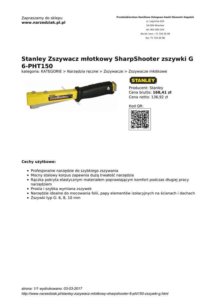 Zapraszamy do sklepu www.narzedziak.pl.pl Przedsiębiorstwo Handlowo Usługowe Gaabi Sławomir Gagatek ul. Legnicka 52A 54-204 Wrocław tel. 801 003 154 dla tel. kom.: 71 724 25 00 fax: 71 724 20 96 Stanley Zszywacz młotkowy SharpShooter zszywki G 6-PHT150 kategoria: KATEGORIE > Narzędzia ręczne > Zszywacze > Zszywacze młotkowe Producent: Stanley Cena brutto: 168,41 zł Cena netto: 136,92 zł Kod QR: Cechy użytkowe: Profesjonalne narzędzie do szybkiego zszywania Mocny stalowy korpus zapewnia dużą trwałość narzędzia Rączka pokryta elastycznym materiałem poprawiającym komfort podczas długiej pracy narzędziem Prosta i szybka wymiana zszywek Narzędzie idealne do mocowania folii, papy elementów izolacyjnych na ścianach i dachach Zszywki typ G: 6, 8, 10 mm strona: 1/1 wydrukowano: 03-03-2017 http://www.narzedziak.pl/stanley-zszywacz-mlotkowy-sharpshooter-6-pht150-zszywki-g.html