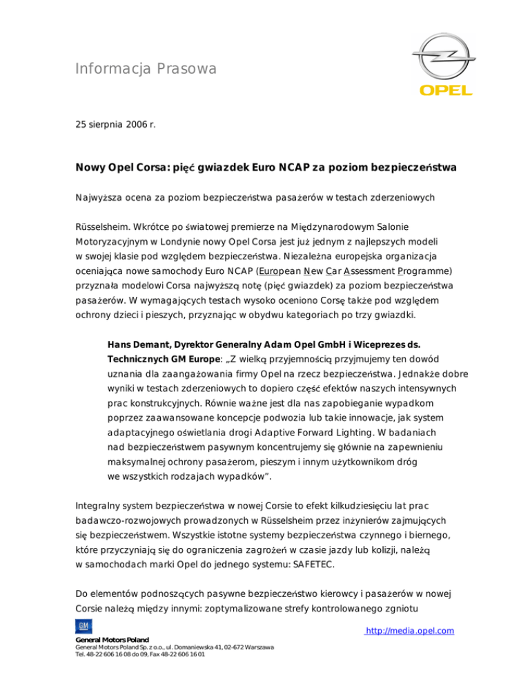 Informacja Prasowa 25 sierpnia 2006 r. Nowy Opel Corsa: pi gwiazdek Euro NCAP za poziom bezpiecze stwa Najwy sza ocena za poziom bezpiecze stwa pasa erów w testach zderzeniowych Rüsselsheim. Wkrótce po wiatowej premierze na Mi dzynarodowym Salonie Motoryzacyjnym w Londynie nowy Opel Corsa jest ju jednym z najlepszych modeli w swojej klasie pod wzgl dem bezpiecze stwa. Niezale na europejska organizacja oceniaj ca nowe samochody Euro NCAP (European New Car Assessment Programme) przyzna a modelowi Corsa najwy sz not (pi gwiazdek) za poziom bezpiecze stwa pasa erów. W wymagaj cych testach wysoko oceniono Cors tak e pod wzgl dem ochrony dzieci i pieszych, przyznaj c w obydwu kategoriach po trzy gwiazdki. Hans Demant, Dyrektor Generalny Adam Opel GmbH i Wiceprezes ds. Technicznych GM Europe: „Z wielk przyjemno ci przyjmujemy ten dowód uznania dla zaanga owania firmy Opel na rzecz bezpiecze stwa. Jednak e dobre wyniki w testach zderzeniowych to dopiero cz efektów naszych intensywnych prac konstrukcyjnych. Równie wa ne jest dla nas zapobieganie wypadkom poprzez zaawansowane koncepcje podwozia lub takie innowacje, jak system adaptacyjnego o wietlania drogi Adaptive Forward Lighting. W badaniach nad bezpiecze stwem pasywnym koncentrujemy si g ównie na zapewnieniu maksymalnej ochrony pasa erom, pieszym i innym u ytkownikom dróg we wszystkich rodzajach wypadków”. Integralny system bezpiecze stwa w nowej Corsie to efekt kilkudziesi ciu lat prac badawczo-rozwojowych prowadzonych w Rüsselsheim przez in ynierów zajmuj cych si bezpiecze stwem. Wszystkie istotne systemy bezpiecze stwa czynnego i biernego, które przyczyniaj si do ograniczenia zagro w czasie jazdy lub kolizji, nale w samochodach marki Opel do jednego systemu: SAFETEC. Do elementów podnosz cych pasywne bezpiecze stwo kierowcy i pasa erów w nowej Corsie nale mi dzy innymi: zoptymalizowane strefy kontrolowanego zgniotu http://media.opel.com General Motors Poland General Motors Poland Sp. z o.o., ul. Domaniewska 41, 02-672 Warszawa Tel. 48-22 606 16 08 do 09, Fax 48-22 606 16 01 -2- i wzmocnienia specjalnie dostosowane do tych stref, dwufazowe czo owe poduszki powietrzne, których stopie nape nienia zale y od si y uderzenia w czasie kolizji, boczne poduszki powietrzne dla kierowcy i pasa era z przodu, pirotechniczne napinacze pasów bezpiecze stwa i regulacja wysoko ci mocowania przednich pasów bezpiecze stwa, a tak e opatentowany system od czania peda ów PRS (Pedal Release System), który w razie silnego uderzenia w przód pojazdu zmniejsza ryzyko urazów stóp kierowcy. System ISOFIX gwarantuje optymalne zamocowanie noside ek i fotelików dzieci cych, a o obowi zku zapi cia pasa bezpiecze stwa przypomina kierowcy optyczny i akustyczny sygna ostrzegawczy. Bezpiecze stwo aktywne zapewniaj mi dzy innymi: zaawansowane podwozie i najnowocze niejsze systemy ABS i ESP, a tak e innowacyjne rozwi zania w uk adzie o wietlenia pojazdu, takie jak reflektory poprawiaj ce widoczno w zakr tach. W razie uaktywnienia si uk adu ABS w czasie hamowania, adaptacyjne wiat a „stop” wiec wiat em pulsuj cym z cz stotliwo ci pi ciu b ysków na sekund , ostrzegaj c innych kierowców. Nape nienie si poduszek powietrznych powoduje automatyczne czenie wiate awaryjnych jako ostrze enia dla innych u ytkowników drogi. Takie rozwi zania, jak specjalna pianka o ma ej g sto ci przed belk wzmacniaj przedni zderzak oraz maska silnika specjalnie zaprojektowana pod k tem skutecznego poch aniania energii uderzenia pomagaj ograniczy urazy pieszego w razie kolizji z jego udzia em. Oceniaj c bezpiecze stwo pasa erów Euro NCAP przeprowadza trzy ró ne testy zderzeniowe: zderzenie czo owe przy pr dko ci 64 km/h ze sta przeszkod przesuni odkszta caln wzgl dem osi symetrii pojazdu o 40 procent, uderzenie bokiem pojazdu z pr dko ci 50 km/h w ruchomy odkszta calny obiekt (w obydwu przypadkach przeszkody symuluj inny pojazd) oraz uderzenie bokiem pojazdu w s up z pr dko ci 29 km/h. Partnerami programu Euro NCAP s mi dzy innymi: Komisja Europejska, niemieckie, brytyjskie i holenderskie ministerstwa transportu, a tak e automobilkluby, w tym niemiecki ADAC. Kontakt: Karl Mauer +49-6142-7-72220 Tekst i zdj cia mo na pobra z Internetu pod adresem http://media.opel.com.