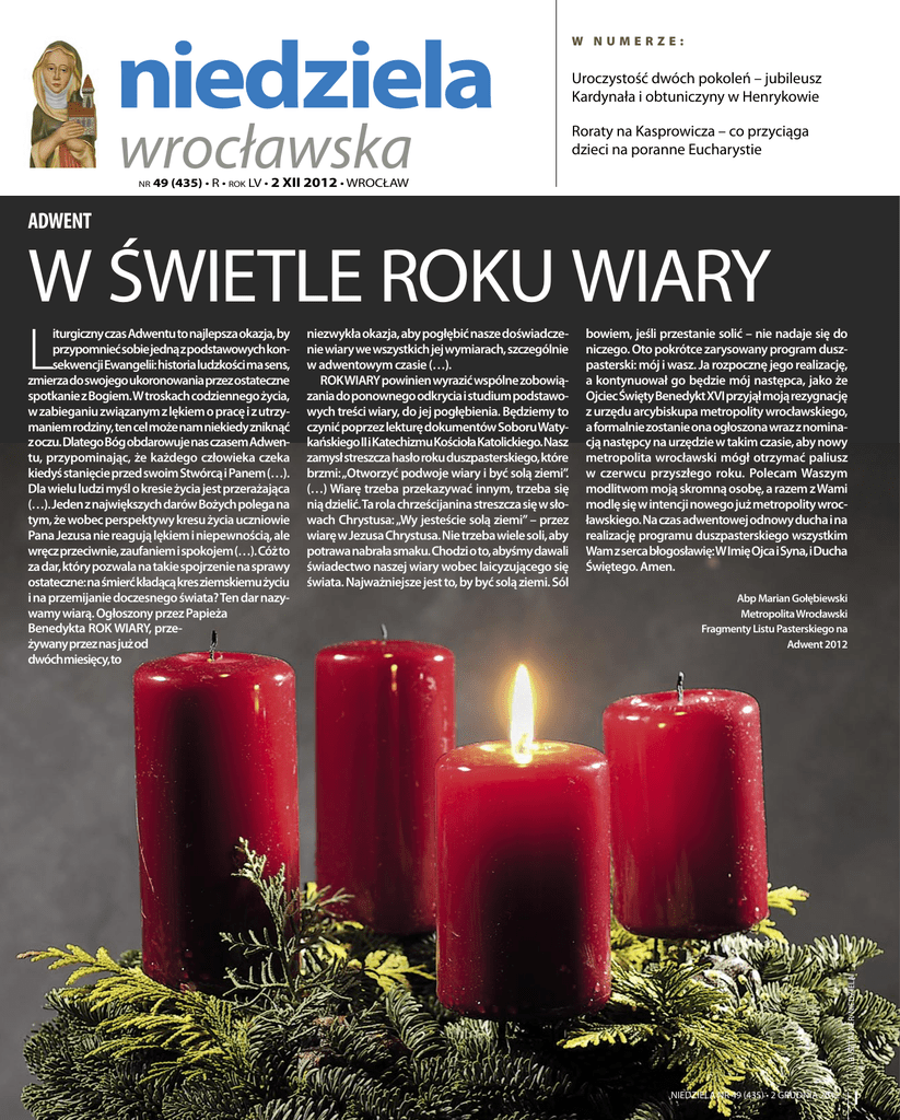 niedziela wrocławska nr w numerze: Uroczystość dwóch pokoleń – jubileusz Kardynała i obtuniczyny w Henrykowie Roraty na Kasprowicza – co przyciąga dzieci na poranne Eucharystie 49 (435) • R • rok LV • 2 XII 2012 • WROCŁAW adwent w świetle roku wiary niezwykła okazja, aby pogłębić nasze doświadczenie wiary we wszystkich jej wymiarach, szczególnie w adwentowym czasie (…). ROK WIARY powinien wyrazić wspólne zobowiązania do ponownego odkrycia i studium podstawowych treści wiary, do jej pogłębienia. Będziemy to czynić poprzez lekturę dokumentów Soboru Watykańskiego II i Katechizmu Kościoła Katolickiego. Nasz zamysł streszcza hasło roku duszpasterskiego, które brzmi: „Otworzyć podwoje wiary i być solą ziemi”. (…) Wiarę trzeba przekazywać innym, trzeba się nią dzielić. Ta rola chrześcijanina streszcza się w słowach Chrystusa: „Wy jesteście solą ziemi” – przez wiarę w Jezusa Chrystusa. Nie trzeba wiele soli, aby potrawa nabrała smaku. Chodzi o to, abyśmy dawali świadectwo naszej wiary wobec laicyzującego się świata. Najważniejsze jest to, by być solą ziemi. Sól bowiem, jeśli przestanie solić – nie nadaje się do niczego. Oto pokrótce zarysowany program duszpasterski: mój i wasz. Ja rozpocznę jego realizację, a kontynuował go będzie mój następca, jako że Ojciec Święty Benedykt XVI przyjął moją rezygnację z urzędu arcybiskupa metropolity wrocławskiego, a formalnie zostanie ona ogłoszona wraz z nominacją następcy na urzędzie w takim czasie, aby nowy metropolita wrocławski mógł otrzymać paliusz w czerwcu przyszłego roku. Polecam Waszym modlitwom moją skromną osobę, a razem z Wami modlę się w intencji nowego już metropolity wrocławskiego. Na czas adwentowej odnowy ducha i na realizację programu duszpasterskiego wszystkim Wam z serca błogosławię:W Imię Ojca i Syna, i Ducha Świętego. Amen. Abp Marian Gołębiewski Metropolita Wrocławski Fragmenty Listu Pasterskiego na Adwent 2012 b. sztajner/niedziela L iturgiczny czas Adwentu to najlepsza okazja, by przypomnieć sobie jedną z podstawowych konsekwencji Ewangelii: historia ludzkości ma sens, zmierza do swojego ukoronowania przez ostateczne spotkanie z Bogiem. W troskach codziennego życia, w zabieganiu związanym z lękiem o pracę i z utrzymaniem rodziny, ten cel może nam niekiedy zniknąć z oczu. Dlatego Bóg obdarowuje nas czasem Adwentu, przypominając, że każdego człowieka czeka kiedyś stanięcie przed swoim Stwórcą i Panem (…). Dla wielu ludzi myśl o kresie życia jest przerażająca (…). Jeden z największych darów Bożych polega na tym, że wobec perspektywy kresu życia uczniowie Pana Jezusa nie reagują lękiem i niepewnością, ale wręcz przeciwnie, zaufaniem i spokojem (…). Cóż to za dar, który pozwala na takie spojrzenie na sprawy ostateczne: na śmierć kładącą kres ziemskiemu życiu i na przemijanie doczesnego świata? Ten dar nazywamy wiarą. Ogłoszony przez Papieża Benedykta ROK WIARY, przeżywany przez nas już od dwóchmiesięcy,to NIEDZIELA NR 49 (435) • 2 grudnia 2012 I niedziela wrocławska Zmiany w Kapitule Metropolitalnej Jednym Zdaniem KJC Wrocław Bp Andrzej Siemieniewski został nowym prepozytem Kapituły Metropolitalnej Uroczystej Eucharystii z okazji przypadającej 16 listopada rocznicy poświęcenia wrocławskiej katedry pw. św. Jana Chrzciciela przewodniczył abp Marian Gołębiewski. Owe święto, z racji iż katedra jest matką wszystkich świątyń w diecezji, obchodzone jest w całym kościele lokalnym. Metropolita dokonał również instalacji nowego prepozyta Kapituły Metropolitalnej, którym został bp Andrzej Siemieniewski, kanonika gremialnego – ks. prof. Mariusza Rosika oraz kanonika honorowego – ks. dr. Pawła Cembrowicza. Funkcje te, jak podkreśla ks. dr Stanisław Jóźwiak, kanclerz wrocławskiej Kurii Metropolitalnej, choć w historii miały większe znaczenie, dziś związane są przede wszystkim ze sprawowaniem liturgii i troską o katedrę. MW Debata o patriotyzmie Listopadowe święto niepodległości, marsze patriotyczne skłaniają do refleksji na temat naszej miłości do Ojczyzny. Duszpasterstwo Akademickie Dominik postanowiło zmierzyć się z tym trudnym tematem. 16 listopada zorganizowano debatę „Kto Ty jesteś – czyli listopadowe rozmowy o patriotyzmie”. W dyskusji wzięli udział: Józef Pinior – senator, Marek Mutor – dyrektor Ośrodka Pamięć i Przyszłość, o. Józef Puciłowski – historyk a także zgromadzona publiczność. Debata miała bardzo żywy charakter, co świadczy o wadze i potrzebie podejmowania tematów dotyczących współczesnego patriotyzmu. Świętowanie w bazylice Wrocław Gwiazdy Orderu Kapituły Kanoników przyznano w uznaniu zasług dla odbudowy świątyni Ratujmy dach Wrocław Trzebnica NIEDZIELA NR 49 (435) • 2 grudnia 2012 Ośrodek Pamięć i Przyszłość „Orędzie” w wersji komiksowej Od kilku lat różne instytucje starają się przedstawić młodym ludziom ważne dla Polski momenty historyczne za pomocą form najbardziej przystępnych. Robi to także wrocławski Ośrodek Pamięć i Przyszłość, czego dowodem jest wystawa prezentowana w listopadzie przy pomniku kard. Bolesława Kominka. W formie komiksu Juliusz Woźny i dr Wojciech Kucharski przedstawili w niej historię Orędzia biskupów polskich do biskupów niemieckich. Dokument uważany jest za przełomowy w stosunkach polsko-niemieckich. Kolejnym nowoczesnym sposobem przekazu historycznego będzie teledysk „Zomo na Legnickiej”. 21 listopada Ośrodek Pamięć i Przyszłość wraz ze znaną grupą Big Cyc kręcili go we wrocławskiej zajezdni przy ul. Grabiszyńskiej i przy ul. Legnickiej. MW II Projekt „Krokus” Zbigniew Kleszczyński Biskup polowy Wojska Polskiego bp Józef Guzek przewodniczył 17 listopada uroczystościom odpustowym ku czci św. Elżbiety Węgierskiej we wrocławskim kościele garnizonowym. Mijają wieki