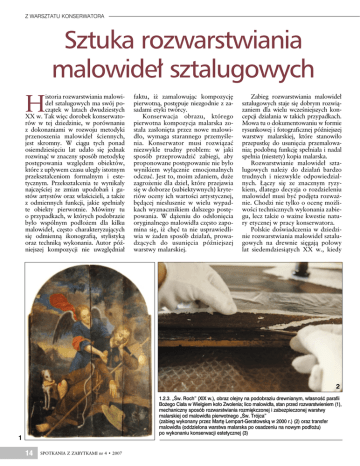 Z WARSZTATU KONSERWATORA Sztuka rozwarstwiania malowideł sztalugowych istoria rozwarstwiania malowideł sztalugowych ma swój początek w latach dwudziestych XX w. Tak więc dorobek konserwatorów w tej dziedzinie, w porównaniu z dokonaniami w rozwoju metodyki przenoszenia malowideł ściennych, jest skromny. W ciągu tych ponad osiemdziesięciu lat udało się jednak rozwinąć w znaczny sposób metodykę postępowania względem obiektów, które z upływem czasu uległy istotnym przekształceniom formalnym i estetycznym. Przekształcenia te wynikały najczęściej ze zmian upodobań i gustów artystów oraz właścicieli, a także z odmiennych funkcji, jakie spełniały te obiekty pierwotnie. Mówimy tu o przypadkach, w których podobrazie było wspólnym podłożem dla kilku malowideł, często charakteryzujących się odmienną ikonografią, stylistyką oraz techniką wykonania. Autor późniejszej kompozycji nie uwzględniał H faktu, iż zamalowując kompozycję pierwotną, postępuje niezgodnie z zasadami etyki twórcy. Konserwacja obrazu, którego pierwotna kompozycja malarska została zasłonięta przez nowe malowidło, wymaga starannego przemyślenia. Konserwator musi rozwiązać niezwykle trudny problem: w jaki sposób przeprowadzić zabiegi, aby proponowane postępowanie nie było wynikiem wyłącznie emocjonalnych odczuć. Jest to, moim zdaniem, duże zagrożenie dla dzieł, które przejawia się w doborze (subiektywnych) kryteriów oceny ich wartości artystycznej, będącej niesłusznie w wielu wypadkach wyznacznikiem dalszego postępowania. W dążeniu do odsłonięcia oryginalnego malowidła często zapomina się, iż chęć ta nie usprawiedliwia w żaden sposób działań, prowadzących do usunięcia późniejszej warstwy malarskiej. Zabieg rozwarstwiania malowideł sztalugowych staje się dobrym rozwiązaniem dla wielu wcześniejszych koncepcji działania w takich przypadkach. Mowa tu o dokumentowaniu w formie rysunkowej i fotograficznej późniejszej warstwy malarskiej, które stanowiło przepustkę do usunięcia przemalowania; podobną funkcję spełniała i nadal spełnia (niestety) kopia malarska. Rozwarstwianie malowideł sztalugowych należy do działań bardzo trudnych i niezwykle odpowiedzialnych. Łączy się ze znacznym ryzykiem, dlatego decyzja o rozdzieleniu malowideł musi być podjęta rozważnie. Chodzi nie tylko o ocenę możliwości technicznych wykonania zabiegu, lecz także o ważne kwestie natury etycznej w pracy konserwatora. Polskie doświadczenia w dziedzinie rozwarstwiania malowideł sztalugowych na drewnie sięgają połowy lat siedemdziesiątych XX w., kiedy 2 1.2.3. „Św. Roch” (XIX w.), obraz olejny na podobraziu drewnianym, własność parafii Bożego Ciała w Wielgiem koło Zwolenia; lico malowidła, stan przed rozwarstwieniem (1), mechaniczny sposób rozwarstwiania rozmiękczonej i zabezpieczonej warstwy malarskiej od malowidła pierwotnego „Św. Trójca” (zabieg wykonany przez Martę Lempart-Geratowską w 2000 r.) (2) oraz transfer malowidła (oddzielona warstwa malarska po osadzeniu na nowym podłożu) po wykonaniu konserwacji estetycznej (3) 1 14 SPOTKANIA Z ZABYTKAMI nr 4 • 2007 Z WARSZTATU KONSERWATORA 3 to nastąpił znaczący rozwój metod rozwarstwiania poza granicami naszego kraju. Ta dziedzina konserwacji znalazła się w centrum zainteresowania dwóch ośrodków kształcących konserwatorów-restauratorów dzieł sztuki – Wydziału Konserwacji i Restauracji Dzieł Sztuki ASP w Krakowie oraz Instytutu Zabytkoznawstwa i Konserwatorstwa UMK w Toruniu – które podjęły (niezależnie od siebie) badania w tym kierunku w ramach prowadzonych prac magisterskich. Dzięki temu możemy prezentować obecnie istotny dorobek w tej dziedzinie, przedstawiając polskie dokonania obok pionierskich realizacji rosyjskich, greckich i włoskich. Opracowane do tej pory metody rozwarstwiania malowideł sztalugo- wych na podobraziu drewnianym charakteryzują się różnym sposobem oddziaływania na przenoszoną warstwę malarską oraz na międzywarstwę oddzielającą obydwa malowidła. W układzie chronologicznym są to następujące metody: – metoda oparta na rozmiękczaniu przenoszonego malowidła z późniejszym założeniem licowania; – metoda polegająca na rozmiękczeniu międzywarstwy poprzez warstwę licowania; – metoda rozwarstwiania, w której przenoszone malowidło rozmiękczane jest przez warstwę licowania; – metoda rozwarstwiania malowideł przez rozmiękczenie międzywarstwy zaprawy oddzielającej obydwa malowidła; – metoda wykorzystująca siłę skurczu kleju licowania – metoda „sucha”, zwana również metodą „toruńską”. Rozważając zagadnienie związane z możliwościami i ograniczeniami, jakie niesie ze sobą zabieg rozwarstwiania, należy stwierdzić, iż nie da się jednoznacznie określić warunków koniecznych do podjęcia decyzji o jego przeprowadzeniu. Na podstawie dotychczasowych doświadczeń można jedynie sformułować te warunki, które sprzyjają rozdzieleniu malowideł, dając względną gwarancję bezpieczeństwa obu dziełom. Ostrożność ta wynika z nabywania wciąż nowych doświadczeń konserwatorskich. To, co kiedyś uważano za konieczne przy podejmowaniu ostatecznej decyzji (choćby konieczność zróżnicowania spoiw przenoszonych malowideł), obecnie zostało zweryfikowane dzięki postępowi techniki i doskonaleniu metod rozwarstwiania. W chwili obecnej mamy już spore doświadczenie w dziedzinie rozwarstwiania malowideł wykonanych na podłożu drewnianym, natomiast malowidła występujące na podobraziu płóciennym skutecznie opierają się naszym działaniom, chociaż możemy już mówić o pewnych sukcesach. Podjęcie decyzji o możliwości wykonania zabiegu rozwarstwienia malowideł sztalugowych wymaga w pierwszej kolejności starannego przygotowania teoretycznego, polegającego na zapoznaniu się z opracowanymi metodami rozdzielania malowideł. Za każdym razem n