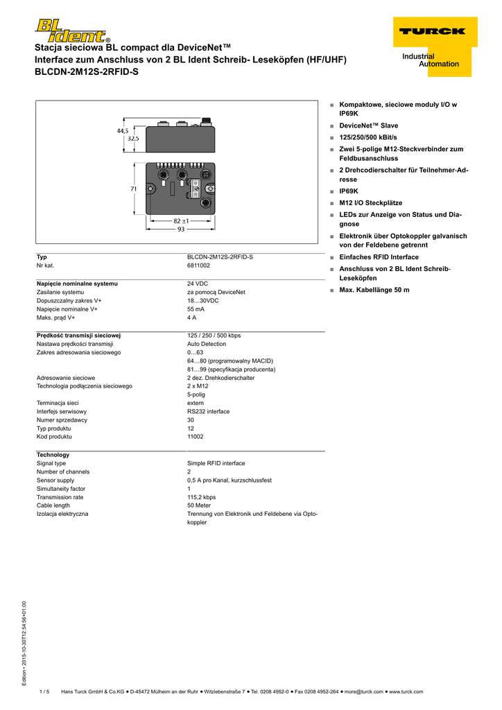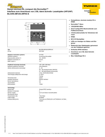 Stacja sieciowa BL compact dla DeviceNet™ Interface zum Anschluss von 2 BL Ident Schreib- Leseköpfen (HF/UHF) BLCDN-2M12S-2RFID-S ■ Kompaktowe, sieciowe moduły I/O w IP69K ■ DeviceNet™ Slave ■ 125/250/500 kBit/s ■ Zwei 5-polige M12-Steckverbinder zum Feldbusanschluss ■ 2 Drehcodierschalter für Teilnehmer-Adresse ■ IP69K ■ M12 I/O Steckplätze ■ LEDs zur Anzeige von Status und Diagnose ■ Elektronik über Optokoppler galvanisch von der Feldebene getrennt Typ Nr kat. BLCDN-2M12S-2RFID-S 6811002 Napięcie nominalne systemu Zasilanie systemu Dopuszczalny zakres V+ Napięcie nominalne V+ Maks. prąd V+ 24 VDC za pomocą DeviceNet 18…30VDC 55 mA 4A Prędkość transmisji sieciowej Nastawa prędkości transmisji Zakres adresowania sieciowego 125 / 250 / 500 kbps Auto Detection 0…63 64…80 (programowalny MACID) 81…99 (specyfikacja producenta) 2 dez. Drehkodierschalter 2 x M12 5-polig extern RS232 interface 30 12 11002 Adresowanie sieciowe Technologia podłączenia sieciowego Terminacja sieci Interfejs serwisowy Numer sprzedawcy Typ produktu Kod produktu ■ Anschluss von 2 BL Ident SchreibLeseköpfen ■ Max. Kabellänge 50 m Simple RFID interface 2 0,5 A pro Kanal, kurzschlussfest 1 115,2 kbps 50 Meter Trennung von Elektronik und Feldebene via Optokoppler Edition • 2015-10-30T12:54:56+01:00 Technology Signal type Number of channels Sensor supply Simultaneity factor Transmission rate Cable length Izolacja elektryczna ■ Einfaches RFID Interface 1/5 Hans Turck GmbH & Co.KG ñ D-45472 Mülheim an der Ruhr ñ Witzlebenstraße 7 ñ Tel. 0208 4952-0 ñ Fax 0208 4952-264 ñ [email protected] ñ www.turck.com Stacja sieciowa BL compact dla DeviceNet™ Interface zum Anschluss von 2 BL Ident Schreib- Leseköpfen (HF/UHF) BLCDN-2M12S-2RFID-S Wymiary Temperatura pracy Temperatura składowania Wilgotność względna Test wibracyjny Zwiększona odporność na wibracje - do 20 g (przy 10 do 150 Hz) Test przeciążeniowy/wstrząsowy Kompatybilność elektromagnetyczna Stopień ochrony Bei Festmontage auf Trägerplatte oder Maschinenkörper. zgodnie z IEC 61131-2 zgodnie z IEC 61131-2 IP67 IP69K Nylon glasfaserverstärkt, Stecker nickelbeschichtet czarny Lexan niklowany mosiądz Polyester with Polycarbonate overlay nickelbeschichtetes Messing 290 ± 20 g CE, cULus Edition • 2015-10-30T12:54:56+01:00 materiał obudowy Kolor obudowy Material Fenster Materiał śrub Materiał etykiety Ground tab material Waga Certyfikaty i dopuszczenia 93 x 71 x 32.5 mm -40…+70 ºC -40…+85 ºC 15 to 95% (nicht kondensierend) zgodnie z IEC 61131-2 2/5 Hans Turck GmbH & Co.KG ñ D-45472 Mülheim an der Ruhr ñ Witzlebenstraße 7 ñ Tel. 0208 4952-0 ñ Fax 0208 4952-264 ñ [email protected] ñ www.turck.com Stacja sieciowa BL compact dla DeviceNet™ Interface zum Anschluss von 2 BL Ident Schreib- Leseköpfen (HF/UHF) BLCDN-2M12S-2RFID-S DeviceNet™ Konfiguracja pinów Przewód sieciowy (przykład): RSC RKC 572-2M nr kat. U0323 lub RSC-RKC572-2M nr kat. 6603629 RFID channels Złącze …/S2503 Przewód łączący (przykład): RK 4.5T-2-RS 4.5T/S2501 nr kat. U3-01243 lub RK4.5T-2-RS4.5T/S2500 nr kat. 6699200 Edition • 2015-10-30T12:54:56+01:00 Złącza …/S2501 3/5 Hans Turck GmbH & Co.KG ñ D-45472 Mülheim an der Ruhr ñ Witzlebenstraße 7 ñ Tel. 0208 4952-0 ñ Fax 0208 4952-264 ñ [email protected] ñ www.turck.com Stacja sieciowa BL compact dla DeviceNet™ Interface zum Anschluss von 2 BL Ident Schreib- Leseköpfen (HF/UHF) BLCDN-2M12S-2RFID-S Status: Station LED LED Color Status Description wył. Zasilanie wyłączone CZERWONY zał. Niewystarczający poziom zasilania CZERWONY MIGANIE (1Hz) Niewłaściwa konfiguracja stacji CZERWONY MIGANIE (4 Hz) Brak modułu komunikacji sieciowej ZIELONY zał. Stacja OK ZIELONY MIGANIE Aktywny tryb wymuszenia OFF No connection GREEN ON Fieldbus communication active GREEN FLASHING (1Hz) Fieldbus communication disabled, device status OK RED ON Double MAC-ID RED FLASHING Fieldbus communication timeout GREEN ON I/O slots OK GREEN FLASHING (1Hz) At least one I/O slot in idle state RED ON At least one faulty I/O slot RED FLASHING At least one I/O slot in faulty state Color Status Description wył. Wyłączona diagnostyka CZERWONY zał. Błąd komunikacyjny stacji / sieci CZERWONY MIGANIE (0,5Hz) Skrócona diagnostyka OFF No tag, diagnostic disabled GREEN ON Tag available GREEN FLASHING (2 Hz) Data exchange with tag enabled RED ON Read/write head fault RED FLASHING (2 Hz) Short-circuit in the supply line of read/write head Wejścia/wyjścia MNS IO Status: I/O LED LED D* RW0 / RW1 Edition • 2015-10-30T12:54:56+01:00 * LED D wskazuje również diagnostykę gateway'a 4/5 Hans Turck GmbH & Co.KG ñ D-45472 Mülheim an der Ruhr ñ Witzlebenstraße 7 ñ Tel. 0208 4952-0 ñ Fax 0208 4952-264 ñ [email protected] ñ www.turck.com Stacja sieciowa BL compact dla DeviceNet™ Interface zum Anschluss von 2 BL Ident Schreib- Leseköpfen (HF/UHF) BLCDN-2M12S-2RFID-S I/O und Diagnosedaten Mapping Input BYTE Bit 7 Bit 6 Bit 5 Bit 4 Bit 2 Bit 1 Bit 0 RFID 10 0 Done Busy Error Trans. Conn. Trans. On TP TFR - 1 Error Cat. (Category Code) 2 Error Desc. (Description Code) 3 - - - - - - - 4…11 Read Data (8 Byte) 12 Done Error Trans. Conn Trans. On TP TFR - 13 Error Cat. (Category Code) 14 Error Desc. (Description Code) 15 - - - - - - 16…23 Read Data (8 Byte) 24 Module number reporting diagnostic data 25 Replace Sta- - Diagnostics - - - - - tion Active - - RFID 10 - - - RFID 10 RFID 11 Diagnostics Slot 1 (ref. Byte 26 - Busy - - - - Bit 3 24) Trans. PS Off 27 - - - - RFID 10 - Trans. PS Er- Trans. Har- ror 28 - - - - - dware Error RFID 11 - - - RFID 11 Trans. PS Off 29 - - - - RFID 11 - Trans. PS Er- Trans. Har- ror dware Error OUTPUT BYTE Bit 7 Bit 6 Bit 5 Bit 4 Bit 3 Bit 2 Bit 1 Bit 0 RFID 10 0 Transceiver Next Tag ID Read Write Tag Info. Trans. Info. Reset 1 - - - - - Byte Count 2 Byte Count 1 Byte Count 0 2 Address High Byte (MSB) 3 Address Low Byte (LSB) 4…11 Write 