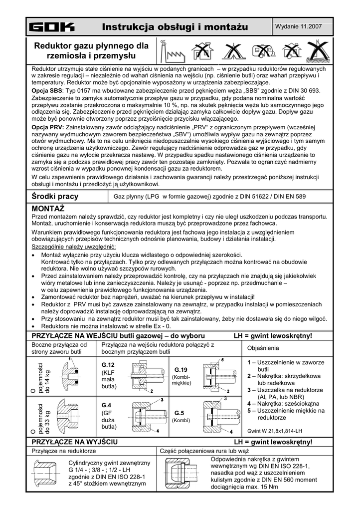 Instrukcja obsługi i montażu Wydanie 11.2007 Reduktor gazu płynnego dla rzemiosła i przemysłu Reduktor utrzymuje stałe ciśnienie na wyjściu w podanych granicach – w przypadku reduktorów regulowanych w zakresie regulacji – niezależnie od wahań ciśnienia na wejściu (np. ciśnienie butli) oraz wahań przepływu i temperatury. Reduktor może być opcjonalnie wyposażony w urządzenia zabezpieczające. Opcja SBS: Typ 0157 ma wbudowane zabezpieczenie przed pęknięciem węża „SBS” zgodnie z DIN 30 693. Zabezpieczenie to zamyka automatycznie przepływ gazu w przypadku, gdy podana nominalna wartość przepływu zostanie przekroczona o maksymalnie 10 %, np. na skutek pęknięcia węża lub samoczynnego jego odłączenia się. Zabezpieczenie przed pęknięciem działając zamyka całkowicie dopływ gazu. Dopływ gazu może być ponownie otworzony poprzez przyciśnięcie przycisku włączającego. Opcja PRV: Zainstalowany zawór odciążający nadciśnienie „PRV“ z ograniczonym przepływem (wcześniej nazywany wydmuchowym zaworem bezpieczeństwa „SBV“) umożliwia wypływ gazu na zewnątrz poprzez otwór wydmuchowy. Ma to na celu uniknięcia niedopuszczalnie wysokiego ciśnienia wyjściowego i tym samym ochronę urządzenia użytkowniczego. Zawór regulujący nadciśnienie odprowadza gaz w przypadku, gdy ciśnienie gazu na wylocie przekracza nastawę. W przypadku spadku nastawionego ciśnienia urządzenie to zamyka się a podczas prawidłowej pracy zawór ten pozostaje zamknięty. Pozwala to ograniczyć nadmierny wzrost ciśnienia w wypadku ponownej kondensacji gazu za reduktorem. W celu zapewnienia prawidłowego działania i zachowania gwarancji należy przestrzegać poniższej instrukcji obsługi i montażu i przedłożyć ją użytkownikowi. Środki pracy Gaz płynny (LPG w formie gazowej) zgodnie z DIN 51622 / DIN EN 589 MONTAŻ Przed montażem należy sprawdzić, czy reduktor jest kompletny i czy nie uległ uszkodzeniu podczas transportu. Montaż, uruchomienie i konserwacja reduktora muszą być przeprowadzone przez fachowca. Warunkiem prawidłowego funkcjonowania reduktora jest fachowa jego instalacja z uwzględnieniem obowiązujących przepisów technicznych odnośnie planowania, budowy i działania instalacji. Szczególnie należy uwzględnić: • Montaż wyłącznie przy użyciu klucza widlastego o odpowiedniej szerokości. Kontrować tylko na przyłączach. Tylko przy odlewanych przyłączach można kontrować na obudowie reduktora. Nie wolno używać szczypców rurowych. • Przed zainstalowaniem należy przeprowadzić kontrolę, czy na przyłączach nie znajdują się jakiekolwiek wióry metalowe lub inne zanieczyszczenia. Należy je usunąć - poprzez np. przedmuchanie – w celu zapewnienia prawidłowego funkcjonowania urządzenia. • Zamontować reduktor bez naprężeń, uważać na kierunek przepływu w instalacji! • Reduktor z PRV musi być zawsze zainstalowany na zewnątrz, w przypadku instalacji w pomieszczeniach należy doprowadzić instalację odprowadzającą na zewnątrz. • Przy stosowaniu na zewnątrz reduktor musi być tak zainstalowany, żeby nie dostawała się do niego wilgoć. • Reduktora nie można instalować w strefie Ex - 0. Boczne przyłącza od strony zaworu butli Przyłącza na wejściu reduktora połączyć z bocznym przyłączem butli O pojemności do 14 kg G.12 (KLF mała butla) O pojemności do 33 kg PRZYŁĄCZE NA WEJŚCIU butli gazowej – do wyboru G.4 (GF duża butla) PRZYŁĄCZE NA WYJŚCIU Przyłącze na reduktorze Cylindryczny gwint zewnętrzny G 1/4 - ; 3/8 - ; 1/2 - LH zgodnie z DIN EN ISO 228-1 z 45° stożkiem wewnętrznym G.19 (Kombimiękkie) G.5 (Kombi) LH = gwint lewoskrętny! Objaśnienia 1 – Uszczelnienie w zaworze butli 2 – Nakrętka: skrzydełkowa lub radełkowa 3 – Uszczelka na reduktorze (Al, PA, lub NBR) 4 – Nakrętka: sześciokątna 5 – Uszczelnienie miękkie na reduktorze Gwint W 21,8x1,814-LH LH = gwint lewoskrętny! Część połączeniowa rura lub wąż Odpowiednia nakrętka z gwintem wewnętrznym wg DIN EN ISO 228-1, nasadka pod wąż z uszczelnieniem kulistym zgodnie z DIN EN 560 moment dociągnięcia max. 15 Nm Instrukcja obsługi i montażu Przyłącze obustronne Wydanie 11.2007 (LH = gwint lewoskrętny!) Przyłącze na reduktorze Część połączeniowa rura lub wąż Śrubunek gwintowy z krawędzią uszczelniającą (np. GOK-Typ GELRB) zgodnie z DIN EN ISO 8434-1 Gwint wewnętrzny z gwintem zewn. G zgodnie z DIN EN ISO 228-1. G zgodnie z DIN Połączenie gwintowe montować przy użyciu środka EN ISO 228-1 uszczelniającego zgodnie z DIN EN 751-1 O-pierścień(ie) w zabezpieczyć przed przekręceniem! dostawie Montaż śrubunku z pierścieniem wcinającym zgodnie z instrukcją montażu GOK dla śrubunków z pierścieniem wcinającym! patrz: www.gok-online.de Po dociągnięciu nakrętki nie wolno ponownie przekręcać reduktora. Przekręcenie może doprowadzić do nieszczelności połączeń. Demontaż lub/i dociąganie śrubunków i ich części jest dopuszczalne tylko w stanie bezciśnieniowym! Kontrola szczelności Kontrola szczelności instalacji gazu płynnego musi być przeprowadzona przed uruchomieniem, podczas prac konserwacyjnych i kontrolnych, przed ponowną instalacją i po istotnych zmianach. W tym celu należy zamknąć oprzyrządowanie zamykające dopływ do urządzenia użytkowniczego i otworzyć zawór butli lub zbiornika. Następnie sprawdzić za pomocą sprayu szukającego nieszczelności lub innego odpowiedniego środka pieniącego się, czy wszystkie miejsca połączeniowe są szczelne. KONTROLA SZCZELNOŚCI jest zadawalająca tylko wtedy, gdy jako wynik wystąpi całkowita szczelność. Nie wolno używać otwartego ognia do sprawdzania szczelności. URUCHOMIENIE Po zamontowaniu i kontroli szczelności reduktor gotowy jest do pracy. Uruchomienie następuje poprzez powolne odkręcenie zaworu butli lub zbiornika przy zamkniętym oprzyrządowaniu urządzenia użytko