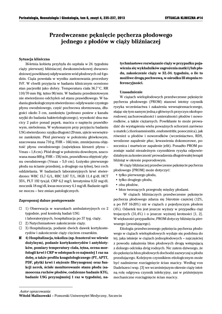Perinatologia, Neonatologia i Ginekologia, tom 6, zeszyt 4, 235-237, 2013 SYTUACJA KLINICZNA #14 Przedwczesne pęknięcie pęcherza płodowego jednego z płodów w ciąży bliźniaczej Sytuacja kliniczna 36-letnia kobieta przybyła do szpitala w 24. tygodniu ciąży pierwszej bliźniaczej dwukosmówkowej dwuowodniowej powikłanej odpływaniem wód płodowych od 4 godzin. Ciąża powstała w wyniku zastosowania procedury IVF. W chwili przyjęcia w badaniu klinicznym oceniono stan pacjentki jako dobry. Temperatura ciała 36,7EC, RR 110/70 mm Hg, tętno 90/min. W badaniu przedmiotowym nie stwierdzono odchyleń od stanu prawidłowego. W badaniu ginekologicznym stwierdzono: odpływanie czystego płynu owodniowego, część pochwowa sformowana, długości około 3 cm, zamknięta (pobrano posiew z kanału szyjki do badania bakteriologicznego), wysokość dna macicy 2 palce ponad pępek, macica o napięciu prawidłowym, niebolesna. W wykonanym przy przyjęciu badaniu USG stwierdzono: szyjka długości 29 mm, ujście wewnętrzne zamknięte. Płód pierwszy w położeniu główkowym, szacowana masa 710 g, FHR – 166/min, zmniejszona objętość płynu owodniowego (największa kieszeń płynu – Vmax – 1,8 cm). Płód drugi w położeniu dowolnym, szacowana masa 660 g, FHR – 156/min, prawidłowa objętość płynu owodniowego (Vmax – 5,0 cm). Łożysko pierwszego płodu na ścianie przedniej, a drugiego na tylnej, bez cech oddzielania. W badaniach laboratoryjnych krwi stwierdzono: WBC 15,7 G/L, RBC 3,87 T/L, HGB 11,4 g/dl, HCT 35%, PLT 192 tys/μl, CRP 6,2 mg/l, kreatynina 0,52 mg/dl, mocznik 18 mg/dl, kwas moczowy 4,1 mg/dl. Badanie ogólne moczu – bez zmian patologicznych. Zaproponuj dalsze postępowanie G 1) Obserwacja w warunkach ambulatoryjnych co 2 tygodnie, pod kontrolą badań USG i laboratoryjnych, hospitalizacja po 37 tyg. ciąży. G 2) Natychmiastowe zakończenie ciąży. G 3) Hospitalizacja, podanie dwóch dawek kortykosterydów i zakończenie ciąży cięciem cesarskim. G Y 4) Hospitalizacja, tokoliza (np. fenoterol we wlewie dożylnym), podanie kortykosterydów i antybiotyków, pomiary temperatury ciała, tętna, ocena morfologii krwi i CRP w odstępach co najmniej 1 raz na dobę, a także profilu koagulologicznego (PT, APTT, PDF, płytki krwi i stężenie fibrynogenu) oraz funkcji nerek, ścisłe monitorowanie stanu płodu (samoocena ruchów płodów, codzienne badanie KTG, badanie USG przynajmniej 1 raz w tygodniu), na- Autor opracowania: tychmiastowe rozwiązanie ciąży w przypadku pojawienia się wykładników zagrożenia matki i/lub płodu, zakończenie ciąży w 32.-34. tygodniu, o ile to możliwe drogą pochwową, w ośrodku III stopnia referencyjności. Uzasadnienie W ciążach wielopłodowych przedwczesne pęknięcie pęcherza płodowego (PROM) stanowi istotny czynnik ryzyka wcześniactwa i zakażenia wewnątrzmacicznego, stając się tym samym jedną z głównych przyczyn okołoporodowej zachorowalności i umieralności płodów i noworodków, a także ciężarnych. Powikłanie to może prowadzić do wystąpienia wielu poważnych schorzeń zarówno u matek (chorioamnionitis, endometritis, posocznica), jak również u płodów i noworodków (wcześniactwo, RDS, wrodzone zapalenie płuc, krwawienia dokomorowe, posocznica i martwicze zapalenie jelit). Ponadto PROM pozostaje nadal niezależnym czynnikiem ryzyka odpowiedzialnym za konieczność prowadzenia długotrwałej terapii bliźniąt w okresie poporodowym. W ciąży bliźniaczej przedwczesne pęknięcie pęcherza płodowego [PROM] może dotyczyć: • tylko pierwszego płodu, • tylko drugiego płodu, • obu płodów, • błon tworzących przegrodę między płodami. W ciążach bliźniaczych przedwczesne pęknięcie pęcherza płodowego zdarza się 3-krotnie częściej (12%, a po IVF 16-20%) niż w ciążach z pojedynczym płodem (4%). Odsetek ten jest jeszcze wyższy w przypadku ciąż trojaczych (31,4%) i o jeszcze wyższej krotności [1, 2]. W większości przypadków, PROM dotyczy bliźnięcia pierwszego (przodującego). Etiologia przedwczesnego pęknięcia pęcherza płodowego w ciążach wielopłodowych wydaje się podobna do tej, jaka istnieje w ciążach jednopłodowych – najczęściej z powodu zakażenia błon płodowych drogą wstępującą z dolnego odcinka dróg rodnych. Nic zatem dziwnego, że do pęknięcia błon płodowych dochodzi zazwyczaj u płodu przodującego. Kolejnym czynnikiem etiologicznym może być nadmierne rozciągnięcie ścian macicy. Według von Dadelszen i wsp. [3] we wcześniejszym okresie ciąży istotną rolę odgrywa czynnik infekcyjny, zaś w późniejszym mechaniczne rozciągnięcie ścian macicy. Witold Malinowski – Pomorski Uniwersytet Medyczny, Szczecin 236 Przedwczesne pęknięcie pęcherza płodowego jednego z płodów w ciąży bliźniaczej Postępowanie w przypadku ciąży wielopłodowej powikłanej przedwczesnym pęknięciem pęcherza płodowego zależy od kilku czynników: wieku ciążowego, dojrzałości płuc płodów, liczby płodów i ewentualnej obecności powikłań matczynych lub płodowych. Algorytm postępowania, podobnie jak w ciążach jednopłodowych, włącza zastosowanie antybiotyków i steroidów, jak również natychmiastowego porodu w przypadku obecności infekcji u matki i/lub zagrożenia płodów. Bez względu na wiek ciążowy, należy unikać badania palpacyjnego przez pochwę z powodu wzrostu ryzyka zakażenia wstępującego. Wystarczające jest uwidocznienie szyjki macicy w sterylnych wziernikach z jednoczesnym pobraniem wydzieliny z pochwy i kanału szyjki do badania bakteriologicznego. Należy jednocześnie przeprowadzić diagnostykę w kierunku oceny stanu ciężarnej i płodów, stopnia zaawansowania porodu oraz obecności ewentualnych wykładników zakażenia wewnątrzmacicznego, wypadnięcia pępowiny i przedwczesnego odklejenia łożyska. Brak jest powszechnie akceptowanych standardów postępowania w przypadku odpłynięcia pły