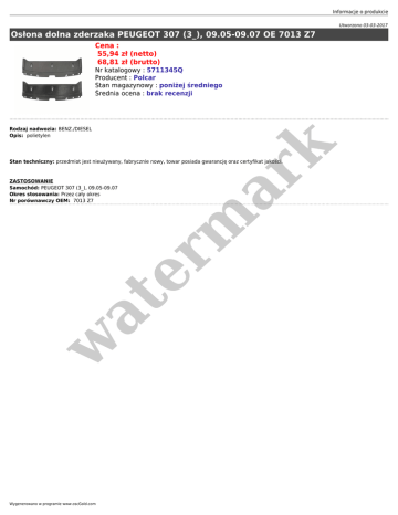Informacje o produkcie Utworzono 03-03-2017 Osłona dolna zderzaka PEUGEOT 307 (3_), 09.05-09.07 OE 7013 Z7 Cena : 55,94 zł (netto) 68,81 zł (brutto) Nr katalogowy : 5711345Q Producent : Polcar Stan magazynowy : poniżej średniego Średnia ocena : brak recenzji er m ar k Rodzaj nadwozia: BENZ./DIESEL Opis: polietylen Stan techniczny: przedmiot jest nieużywany, fabrycznie nowy, towar posiada gwarancję oraz certyfikat jakości. w at ZASTOSOWANIE Samochód: PEUGEOT 307 (3_), 09.05-09.07 Okres stosowania: Przez cały okres Nr porównawczy OEM: 7013 Z7 Wygenerowano w programie www.oscGold.com