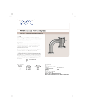 . ky Minimalizacja ryzyka implozji Alfa Laval Obudowa przeciwpróżniowa SB Koncepcja Obudowa przeciwpróżniowa służy do minimalizowania ryzyka implozji zbiorników narażonych na działanie próżni np. podczas opróżniania, płukania na zimno po czyszczeniu na gorąco albo czyszczenia w atmosferze CO2. Obudowę przeciwpróżniową można łączyć z zaworami bezpieczeństwa lub regulatorami ciśnienia montowanymi u góry. Zasada działania Obudowa przeciwpróżniowa działa standardowo dla ciśnienia 50 mm H2O/5 mbar dla wszystkich rozmiarów zaworów. Zawory bezpieczeństwa chronią zbiornik i umożliwiają ujście, gdy ciśnienie w zbiorniku przekroczy zaprogramowaną wartość otwarcia. Zawory regulacyjne chronią zbiornik i zapewniają obniżenie ciśnienia w zbiorniku, jeśli przekroczy ono zaprogramowaną wartość otwarcia. Wykonanie standardowe Obudowę przeciwpróżniową można wyczyścić podczas cyklu CIP zbiornika albo poprzez podłączenie dyszy CIP do głównego zasilania CIP. Przepływ CIP wynosi w przybliżeniu 500–800 l/min. Podczas czyszczenia zbiornika mała objętość cieczy czyszczącej przepłynie przez korpus zaworu i wyczyści gniazdo. W celu zapewnienia dokładnego przepłukania gniazda zaworu konieczne jest wymuszone otwarcie zaworu — można to zrobić wyłącznie po dekompresji zbiornika. Zaleca się użycie kolektora spustowego, aby zapobiec wlewaniu się cieczy CIP do zbiornika. . Deklaracja zgodności z dyrektywą PED 97/23/WE Wspólnoty Europejskiej. Grupa Ciecze bezpieczne cieczy II DANE TECHNICZNE Rozmiar nominalny 2˝ 3˝ 4˝ 6˝ Ciśnienie otwarcia (∆P) 50 mmH2O 50 mmH2O 50 mmH2O 50 mmH2O Ciśnienie dopuszczalne PS 4.5 bar 4.5 bar 4.5 bar 4.5 bar DANE FIZYCZNE Materiały Części stalowe mające kontakt z produktem: Uszczelki mające kontakt z produktem: EN 1.4404 (AISI 316L) EPDM Połączenia Nakrętka i tuleja wg DIN 11851 Okucie zacisku ISO 2852 Nakrętka i tuleja wg SMS Swedish Standard Union Króciec spawany wg DIN 11850 lub ISO 2037 zależnie od rozmiaru zaworu Opcje Obudowa przeciwpróżniowa stanowi zabezpieczenie przed próżnią i może być łączona z innymi zaworami w celu udostępnienia następujących funkcji: • • Zawory bezpieczeństwa w celu ochrony zbiornika przed nadciśnieniem Zawory regulacyjne w celu ochrony procesu Dostępne kombinacje Obudowa przeciwpróżniowa Rozmiar nominalny 2˝ 3˝ 4˝ 6˝ Zawór regulujący Przewód CO2 Ujście ciśnienia X X X X X X X X Zawór bezpieczeństwa Zawór bezpieczeństwa X X X Obudowa przeciwpróżniowa z przewodem CO2 Obudowa przeciwpróżniowa z ujściem ciśnienia Obudowa przeciwpróżniowa z zaworem bezpieczeństwa Przekrój obudowy przeciwpróżniowej z urządzeniem do wymuszonego otwierania, czujnikiem zbliżeniowym i kolektorem spustowym Wydajność przepływu wolumetrycznego Czynnik: Powietrze ϮϬϬϬ ^ŝnjĞϲΗ ϭϴϬϬ ϭϲϬϬ ϭϰϬϬ ^ŝnjĞϰΗ Q(Nm3/h) ϭϮϬϬ ϭϬϬϬ ϴϬϬ ^ŝnjĞϯΗ ϲϬϬ ^ŝnjĞϮΗ ϰϬϬ ϮϬϬ Ϭ Ϭ ϱϬ ϭϬϬ ϭϱϬ ϮϬϬ ϮϱϬ ϯϬϬ ϯϱϬ ϰϬϬ ϰϱϬ ϱϬϬ ǻP Pressure below surroundings (mmH2O) ϱϱϬ ϲϬϬ ϲϱϬ ϳϬϬ . ESE02917PL 1507 Alfa Laval Polska Sp. z o.o. ul. Marynarska 15, 02-674 Warszawa Tel.: 22 336 64 64, fax: 22 336 64 60 www.alfalaval.com Alfa Laval zastrzega sobie prawo do wprowadzenia zmian bez wcześniejszego powiadamiania. ALFA LAVAL to zastrzeżony znak handlowy należący do Alfa Laval Corporate AB. © Alfa Laval