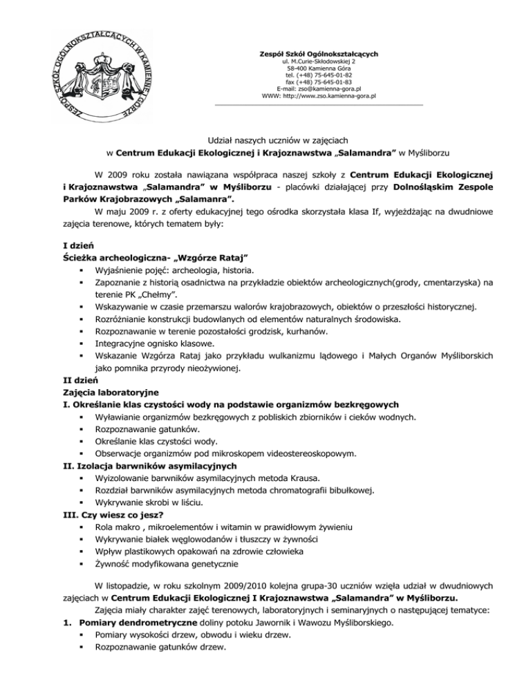 Zespół Szkół Ogólnokształcących ul. M.Curie-Skłodowskiej 2 58-400 Kamienna Góra tel. (+48) 75-645-01-82 fax (+48) 75-645-01-83 E-mail: [email protected] WWW: http://www.zso.kamienna-gora.pl _____________________________________________________________ Udział naszych uczniów w zajęciach w Centrum Edukacji Ekologicznej i Krajoznawstwa „Salamandra” w Myśliborzu W 2009 roku została nawiązana współpraca naszej szkoły z Centrum Edukacji Ekologicznej i Krajoznawstwa „Salamandra” w Myśliborzu - placówki działającej przy Dolnośląskim Zespole Parków Krajobrazowych „Salamanra”. W maju 2009 r. z oferty edukacyjnej tego ośrodka skorzystała klasa If, wyjeżdżając na dwudniowe zajęcia terenowe, których tematem były: I dzień Ścieżka archeologiczna- „Wzgórze Rataj” Wyjaśnienie pojęć: archeologia, historia. Zapoznanie z historią osadnictwa na przykładzie obiektów archeologicznych(grody, cmentarzyska) na terenie PK „Chełmy”. Wskazywanie w czasie przemarszu walorów krajobrazowych, obiektów o przeszłości historycznej. Rozróżnianie konstrukcji budowlanych od elementów naturalnych środowiska. Rozpoznawanie w terenie pozostałości grodzisk, kurhanów. Integracyjne ognisko klasowe. Wskazanie Wzgórza Rataj jako przykładu wulkanizmu lądowego i Małych Organów Myśliborskich jako pomnika przyrody nieożywionej. II dzień Zajęcia laboratoryjne I. Określanie klas czystości wody na podstawie organizmów bezkręgowych Wyławianie organizmów bezkręgowych z pobliskich zbiorników i cieków wodnych. Rozpoznawanie gatunków. Określanie klas czystości wody. Obserwacje organizmów pod mikroskopem videostereoskopowym. II. Izolacja barwników asymilacyjnych Wyizolowanie barwników asymilacyjnych metoda Krausa. Rozdział barwników asymilacyjnych metoda chromatografii bibułkowej. Wykrywanie skrobi w liściu. III. Czy wiesz co jesz? Rola makro , mikroelementów i witamin w prawidłowym żywieniu Wykrywanie białek węglowodanów i tłuszczy w żywności Wpływ plastikowych opakowań na zdrowie człowieka Żywność modyfikowana genetycznie W listopadzie, w roku szkolnym 2009/2010 kolejna grupa-30 uczniów wzięła udział w dwudniowych zajęciach w Centrum Edukacji Ekologicznej I Krajoznawstwa „Salamandra” w Myśliborzu. Zajęcia miały charakter zajęć terenowych, laboratoryjnych i seminaryjnych o następującej tematyce: 1. Pomiary dendrometryczne doliny potoku Jawornik i Wawozu Myśliborskiego. Pomiary wysokości drzew, obwodu i wieku drzew. Rozpoznawanie gatunków drzew. Osobliwości florystyczne Wąwozu Myśliborskiego. Bioinekatory w lesie. 2. Papier czerpany - zapoznanie z historią i techniką wykonywania papieru, samodzielne wykonywanie kartki papieru czerpanego; wykonywanie na nim projektu plakatu SOS dla zwierząt. 3. Badania mikroskopowe gleby. Obserwacje struktury gleby. Rozpoznawanie rodzaju próchnicy. Mikroskopowe obserwacje składu mineralnego gleby. 4. Badanie klas czystości wody na podstawie bezkręgowców. Wyławianie organizmów bezkręgowych z pobliskich zbiorników i cieków wodnych. Rozpoznawanie gatunków określanie klas czystości wody. Obserwacje organizmów pod mikroskopem videostereoskopowym 5. Izolacja barwników asymilacyjnych. Wyizolowanie barwników asymilacyjnych metoda Krausa. Rozdział barwników asymilacyjnych metoda chromatografii bibułkowej. Uzupełnieniem zajęć dydaktycznych była popołudniowa integracja grupy przy ognisku, wspólnych śpiewach, grach i zabawach zespołowych. W dniach 7-8 maja 2010 zorganizowany został wyjazd dla klasy IE i IIF na dwudniowe zajęcia w Centrum Edukacji Ekologicznej i Krajoznawstwa „Salamandra” w Myśliborzu. Zajęcia miały charakter zajęć terenowych, laboratoryjnych i seminaryjnych o następującej tematyce: 1. Pomiary dendrometryczne doliny potoku Jawornik i Wąwozu Myśliborskiego Pomiary wysokości drzew, obwodu i wieku drzew. Rozpoznawanie gatunków drzew. Osobliwości florystyczne Wąwozu Myśliborskiego. Bioindykatory w lesie. 2. Centrum rehabilitacji dzikich zwierząt przy CEEiK w Myśliborzu - zapoznanie z celami i zasadami funkcjonowania 3. Obserwacja tkanek roślinnych. Obserwacje mikroskopowe budowy aparatów szparkowych. Zapoznanie się z funkcją aparatów szparkowych. Wpływ stosowania soli na strukturę cytoplazmy komórki roślinnej. Obserwacja tkanek roślinnych pod mikroskopem. 4. Bioindykatory w wodzie, badanie klas czystości wody na podstawie bezkręgowców. Wyławianie organizmów bezkręgowych z pobliskich zbiorników i cieków wodnych. Rozpoznawanie gatunków określanie klas czystości wody. Obserwacje organizmów pod mikroskopem videostereoskopowym. 5. Gleba dobrem niezastąpionym Oznaczanie odczynu pH gleby. Badanie obecności siarki, żelaza, wapnia w glebie. Wykrywanie zawartości azotanów, azotynów i fosforanów w glebie. 6. Izolacja barwników asymilacyjnych Wyizolowanie barwników asymilacyjnych metoda Krausa. Rozdział barwników asymilacyjnych metoda chromatografii bibułkowej. Uzupełnieniem zajęć dydaktycznych była popołudniowa integracja grupy przy ognisku, wspólnych śpiewach, grach i zabawach zespołowych. [tekst: Dorota Dzielędziak]