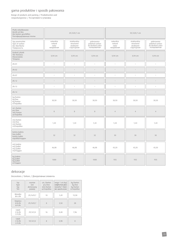 gama produktów i sposób pakowania Range of products and packing / Produktsorten und verpackungweise / Aссортимент и упаковка Płytki rektyfikowane Rectifi ed tiles Die Kanten geschliffen 29,7x59,7 cm 59,7x59,7 cm Ρектифицированньιе плитки naturalna natural natur Typ powierzchni Type of surface Die Oberfläche Поверхность Grubość płytek Tile thickness Fliesenstärke натуральная strukturalna structured strukturiet структурная die Oberfläche poliert натуральная strukturalna structured strukturiet структурная die Oberfläche poliert полированная 0,94 cm 0,94 cm 0,94 cm 0,94 cm 0,94 cm 0,94 cm 30,50 30,50 30,50 30,50 30,50 30,50 8 8 8 4 4 4 1,44 1,44 1,44 1,44 1,44 1,44 32 32 32 30 30 30 46,08 46,08 46,08 43,20 43,20 43,20 1000 1000 1000 935 935 935 polerowana polished surface naturalna natural natur polerowana polished surface полированная Toлщина ZN 01 ZN 02 ZN 07 ZN 12 ZN 13 ZN 14 kg/karton kg/box kg/karton кг/корoбка szt./karton pcs/box stck/karton шт/корoбка m2/karton m2/box m2/karton m2/корoбка karton/paleta box/pallet karton/pallet корoбка/поддон m2/paleta m2/pallet m2/pallet m2/поддон kg/paleta kg/pallet kg/pallet кг/поддон dekoracje Decorations / Dekore / Декоративные элементы Typ Type Typ wymiar size abmessung размер szt./karton pcs/box stck/karton шт/корoбка waga 1 szt.(kg) weight of one piece Gewicht/1 Stück вес одной штуки кг/корoбка Mozaika M-c-ZN 29,7x29,7 10 1,49 15,58 Stopnica K-N-ZN K-P-ZN 29,7x59,7 8 3,50 28 Cokół C-N-ZN C-P-ZN 29,7x7,8 16 0,48 7,96 Cokół C-N-ZN C-P-ZN 59,7x7,8 8 0,98 8 Тип kg/karton kg/box kg/karton 15