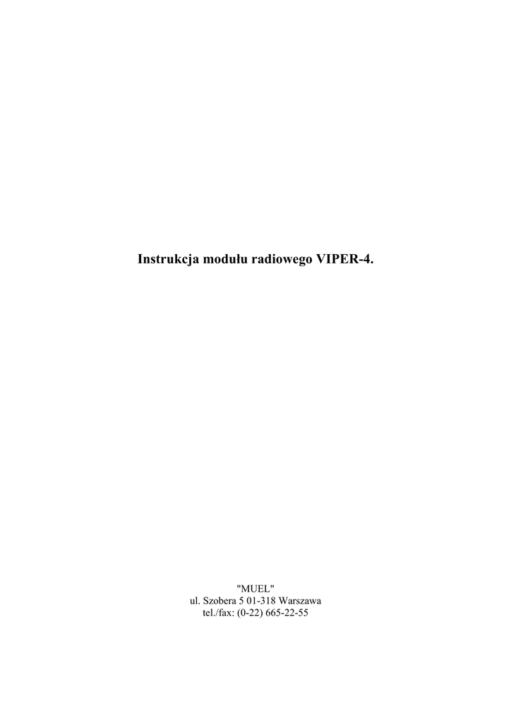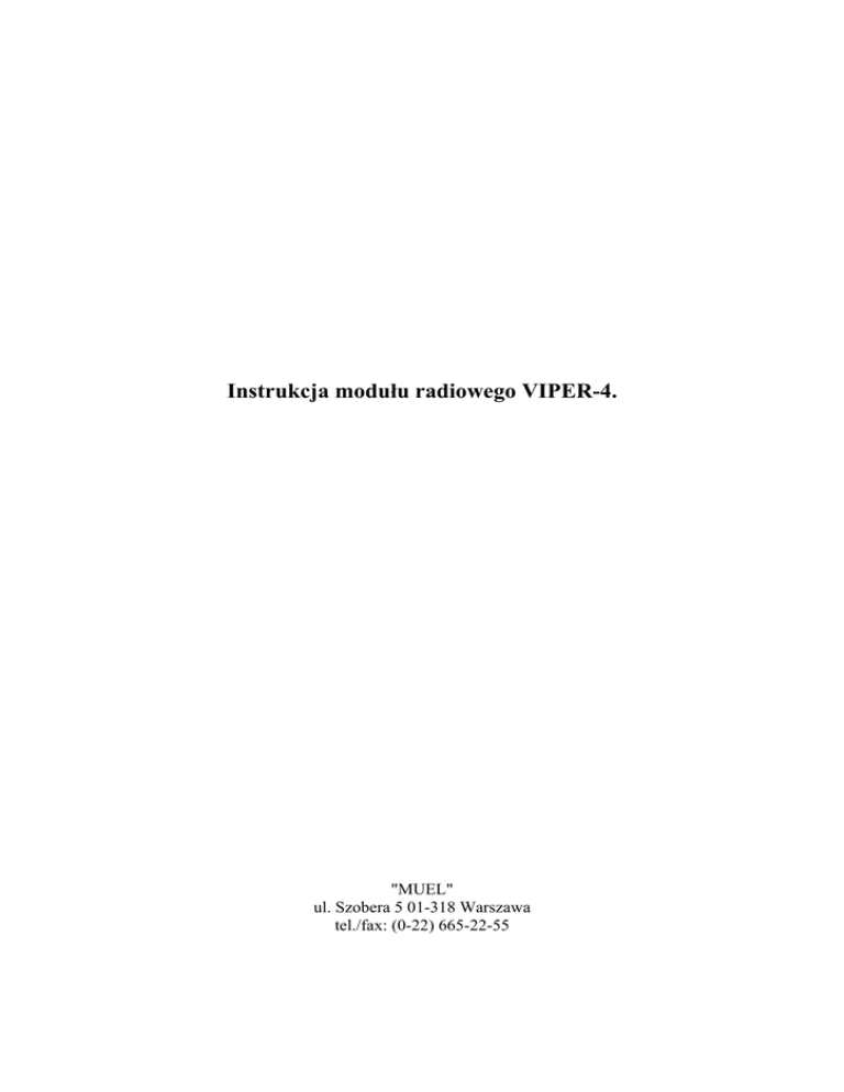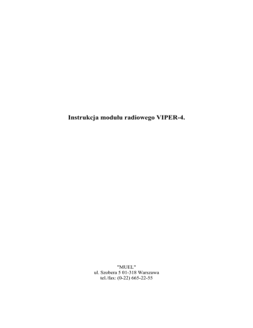 Instrukcja modułu radiowego VIPER-4. "MUEL" ul. Szobera 5 01-318 Warszawa tel./fax: (0-22) 665-22-55 Strona 2 MUEL 1999 1.0. Strona 3 Przeznaczenie: Moduł radiowy VIPER-4 jest elementem radiowej sieci transmisji danych, służącej do monitorowania i sterowania obiektów technologicznych. Posiada 4 wejścia parametryzowane, i 4 wyjścia cyfrowe (OC). Moduł pracuje pod kontrolą procesora Motorola 68HC11. Stan wejść i wyjść cyfrowych przekazywany jest drogą radiową w zadanych interwałach czasowych lub na każde żądanie operatora stacji monitorującej. Stan 4 wyjść sterownika zmieniany jest według wpisanego przez instalatora algorytmu lub drogą radiową na każde żądanie operatora stacji monitorującej. Ponadto moduł posiada: 1. Wejście TAMPER używane do informowania stacji monitorującej o wtargnięciu niepowołanej osoby do obiektu. 2. Możliwość podłączenia akumulatora w celu podtrzymania pracy modułu w przypadku zaniku napięcia zasilającego. W czasie normalnej pracy akumulator jest doładowywany informacja o jego obecności i stanie naładowania jest dostępna w stacji bazowej. 3. Jeśli akumulator jest zainstalowany, w stacji bazowej jest informacja o stanie napięcia zasilającego (~220V) 1.1. Dane techniczne: Wejścia cyfrowe: • • Liczba wejść cyfrowych Standard 4 Parametryzowane Wyjścia sterujące: • • • Liczba wyjść sterujących Typ wyjść Obciążenie wyjść 4 OC 45V 0.3A (max 150 mW) Wyjście radiowe: • • • Protokół transmisji Szybkość transmisji Rodzaj modulacji • • • czułość wejścia Poziom wyjściowy sygnału modulującego Linie do współpracy z radiostacją Opracowany w firmie “MUEL” 1200 BPS AFSK częstotliwość MARK = 1200 Hz częstotliwość SPACE = 2200 Hz 50 mV RMS regulowany od 0 do 1000mV RMS RX Audio TX Audio PTT (kluczowanie nadajnika) Wejście "Tamper" • stan obudowy rozwarte zwarte - otwarta - zamknięta Strona 4 1.2. Pozostałe dane techniczne: • • • • Zasilanie Temperatura pracy Zasilanie awaryjne Ładownie akumulatora • • • Pobór prądu wymiary Masa 2.0. Transformator TST50/007 -5 ÷ +60ºC Akumulator 12V 6,5 Ah Automatyczne z regulowanym napięciem odcięcia ok. 150 mA 211x114x50 mm ok. 350 g Warunki pracy: Moduł radiowy VIPER-4 jest przystosowany do pracy w warunkach stacjonarnych w pomieszczeniach zamkniętych. Urządzenie spełnia wymagania klimatyczne i mechaniczne przewidziane dla przyrządów tej grupy. 2.1. Warunki odniesienia: a. temperatura otoczenia b. wilgotność względna c. ciśnienie atmosferyczne d. zasilanie 2.2. 23°C (296°K) 45 ÷ 55% 860÷1060 mbar jak w p. 1. Znamionowe warunki pracy: a. temperatura otoczenia b. wilgotność względna c. ciśnienie atmosferyczne d. warunki zasilania 3.0. 1. 2. 3. 4. -5 ÷ + 60°C 20 ÷ 90% 800 ÷ 1060 mbar jak p. 1.2. Wyposażenie: Moduł radiowy VIPER-4 Kabel sygnałowy Transformator TST 50/007 Instrukcja obsługi szt. 1 szt. 1 szt. 1 szt. 1 MUEL 1999 Strona 5 4.0. Instalacja modułu radiowego 4.1. Zasilacz Moduł radiowy wyposażone jest we własny zasilacz stabilizowany. Do poprawnej pracy urządzenia wystarczy podłączyć transformator sieciowy TST50/007. Wkręty mocujące doprowadzenia oznaczone są napisem „AC AC 16.5VAC”. Układ zasilacza zabezpieczony jest bezpiecznikiem topikowym F2 – 2,5A. UWAGA: Podczas instalacji transformator nie może być podłączony do sieci. AC AC 16.5VAC Rysunek 1 315mA ~220V Akumulator o pojemności 6.5Ah (lub większej) powinien być przykręcony do wyprowadzeń oznaczonych ACCU+ i ACCU-. Prąd ładowania ustawiony jest na 0.3A i maleje ze wzrostem napięcia na akumulatorze. Maksymalne napięcie ładowania ustawiane jest potencjometrem R108 przy odłączonym akumulatorze (patrz rysunek płytki drukowanej). Punktem pomiarowym są wyprowadzenia akumulatora. Fabrycznie ustawione jest napięcie około 13.8V. Akumulator zabezpieczony jest bezpiecznikiem topikowym F1 - 2A. Odwrotne podłączenie akumulatora spowoduje jego przepalenie. UWAGA : Minus akumulatora nie znajduje się na potencjale masy urządzenia ! + ACCU 12V/6.5Ah Rysunek 2 Strona 6 4.2. Podłączenie radionadajnika. Radionadajnik podłączamy do 8-stykowego gniazda RADIO-CN2. Zasilanie nadajnika pobierane jest z tego gniazda (lub z zacisków „AUX PWR”). Poziom napięcia modulującego nadajnik regulowany jest potencjometrem R91. Opis wyprowadzeń gniazda radiowego zawiera tabelka 1. Tabela 1 Wyprowadzenie 1 3 4 6 7 8 Oznaczenie VDD PTT SQL RXA TXA GND Funkcja Napięcie zasilające 12-15V Włączanie nadajnika Sygnał fali nośnej Wejście z demodulatora Wyjście modulujące Masa sygnałowa PTT - Wyjście typu OC włączające stanem niskim nadajnik (zwarcie do GND). Posiada zabezpieczenie typu Watch-Dog. TXA - Wyjście modulujące audio. Podłączamy do wejścia modulującego nadajnik. RXA - Wejście sygnału audio. Podłączamy do wyjścia demodulatora odbiornika. SQL - Wejście informacyjne o obecności fali nośnej. Nadawanie i odbiór sygnalizowane jest lampkami kontrolnymi znajdującymi się na płycie modułu: Nadawanie czerwoną diodą LED podpisaną „TX”. Odbiór zieloną diodą LED podpisaną „RX”. UWAGA: Wyciszanie szumów (squelch) radionadajnika regulujemy tak, aby przy braku odbieranego sygnału nie świeciła się zielona dioda „RX” na płycie modułu. 4.3 Wejście telefoniczne. Wejście telefoniczne służy do podłączenia modułu radiowego Viper-4 do centralki alarmowej wyposażonej w dialer telefoniczny. Do tego celu wykorzystujemy wyprowadzenia oznaczone napisem „DIALER” i „DRET”. Jeśli centralka alarmowa ma przesyłać informacje do bazy drogą telefoniczną (w przypadku uszkodzenia modułu Viper-4), należy wyprowadzenia oznaczone napisem „LINE” podłączyć do centrali telefonicznej, a lokalną sieć telefoniczną do wyprowadzeń oznaczonych napisem „PHONE”. 4.4 Wejścia informacyjne. Wejścia informacyjne są to wejścia parametryzowane, 24-godzinne o działaniu 