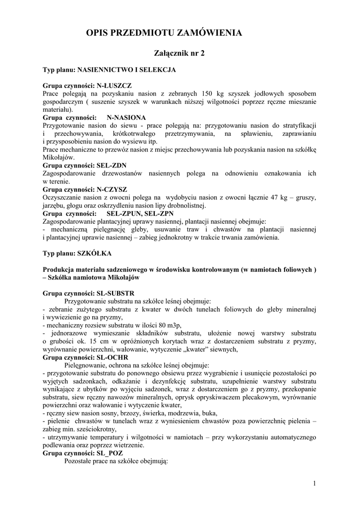 OPIS PRZEDMIOTU ZAMÓWIENIA Załącznik nr 2 Typ planu: NASIENNICTWO I SELEKCJA Grupa czynności: N-ŁUSZCZ Prace polegają na pozyskaniu nasion z zebranych 150 kg szyszek jodłowych sposobem gospodarczym ( suszenie szyszek w warunkach niŜszej wilgotności poprzez ręczne mieszanie materiału). Grupa czynności: N-NASIONA Przygotowanie nasion do siewu - prace polegają na: przygotowaniu nasion do stratyfikacji i przechowywania, krótkotrwałego przetrzymywania, na spławieniu, zaprawianiu i przysposobieniu nasion do wysiewu itp. Prace mechaniczne to przewóz nasion z miejsc przechowywania lub pozyskania nasion na szkółkę Mikołajów. Grupa czynności: SEL-ZDN Zagospodarowanie drzewostanów nasiennych polega na odnowieniu oznakowania ich w terenie. Grupa czynności: N-CZYSZ Oczyszczanie nasion z owocni polega na wydobyciu nasion z owocni łącznie 47 kg – gruszy, jarzębu, głogu oraz oskrzydleniu nasion lipy drobnolistnej. Grupa czynności: SEL-ZPUN, SEL-ZPN Zagospodarowanie plantacyjnej uprawy nasiennej, plantacji nasiennej obejmuje: - mechaniczną pielęgnację gleby, usuwanie traw i chwastów na plantacji nasiennej i plantacyjnej uprawie nasiennej – zabieg jednokrotny w trakcie trwania zamówienia. Typ planu: SZKÓŁKA Produkcja materiału sadzeniowego w środowisku kontrolowanym (w namiotach foliowych ) – Szkółka namiotowa Mikołajów Grupa czynności: SL-SUBSTR Przygotowanie substratu na szkółce leśnej obejmuje: - zebranie zuŜytego substratu z kwater w dwóch tunelach foliowych do gleby mineralnej i wywiezienie go na pryzmy, - mechaniczny rozsiew substratu w ilości 80 m3p, - jednorazowe wymieszanie składników substratu, ułoŜenie nowej warstwy substratu o grubości ok. 15 cm w opróŜnionych korytach wraz z dostarczeniem substratu z pryzmy, wyrównanie powierzchni, wałowanie, wytyczenie „kwater” siewnych, Grupa czynności: SL-OCHR Pielęgnowanie, ochrona na szkółce leśnej obejmuje: - przygotowanie substratu do ponownego obsiewu przez wygrabienie i usunięcie pozostałości po wyjętych sadzonkach, odkaŜanie i dezynfekcję substratu, uzupełnienie warstwy substratu wynikające z ubytków po wyjęciu sadzonek, wraz z dostarczeniem go z pryzmy, przekopanie substratu, siew ręczny nawozów mineralnych, oprysk opryskiwaczem plecakowym, wyrównanie powierzchni oraz wałowanie i wytyczenie kwater, - ręczny siew nasion sosny, brzozy, świerka, modrzewia, buka, - pielenie chwastów w tunelach wraz z wyniesieniem chwastów poza powierzchnię pielenia – zabieg min. sześciokrotny, - utrzymywanie temperatury i wilgotności w namiotach – przy wykorzystaniu automatycznego podlewania oraz poprzez wietrzenie. Grupa czynności: SL_POZ Pozostałe prace na szkółce obejmują: 1 - prace związane z utrzymaniem obiektów szkółkarskich i szkółki według potrzeb, Grupa czynności: SL-WYJM Wyjmowanie materiału sadzonek na szkółce leśnej obejmuje: - wykopanie sadzonek, wybranie sadzonek z gleby, rozkruszenie bryłki ziemi, włoŜenie sadzonek do pojemników lub tymczasowe zabezpieczenie sadzonek do transportu, - sortowanie, liczenie i tymczasowe zabezpieczenie przed wysychaniem lub układanie do pojemników wraz z doniesieniem do miejsca tymczasowego przechowywania, - doniesienie sadzonek do środka transportowego lub miejsca tymczasowego przechowywania, ułoŜenie sadzonek na pojeździe lub w miejscu przechowywania oraz zabezpieczenie przed przesychaniem, - zadołowanie sadzonek, doniesienie sadzonek do dołu oraz przykrycie dołu uprzednio przygotowanymi gałęziami lub matami, Rozliczenie Wykonawcy z Zamawiającym będzie następowało na podstawie ilości wyjętego pełnowartościowego materiału sadzeniowego (bez sadzonek odsortowanych). Grupa czynności: SL-KONSTR Prace przy konstrukcjach szkółki leśnej obejmują: - montaŜ i demontaŜ folii i siatek cieniujących na konstrukcjach namiotów foliowych, montaŜ deszczowni w namiotach, - prace ręczne godzinowe wg. potrzeb Produkcja materiału sadzeniowego na powierzchniach otwartych - szkółka zespolona Mikołajów, szkółka podokapowa Rokiciny. Grupa czynności: SL-WYSSC Mechaniczne przygotowanie gleby przed siewem: orka pełna pługiem oraz spulchnienie powierzchni i jednokrotne wałowanie – doczepienie lub zawieszenie sprzętu do ciągnika, regulacja, drobne naprawy oraz oczyszczenie sprzętu po wykonaniu pracy wraz z odstawieniem na miejsce postoju. Siew nasion na szkółce ręcznie obejmuje: poprawienie rowków siewnych, doniesienie nasion, siew i ich przykrycie; Siew mechaniczny na szkółce obejmuje: (siewnik zawieszony na ciągniku) obejmuje: doniesienie nasion, ustalenie normy siewu i regulację siewnika, siew i poprawienie przykrycia, oczyszczenie siewnika; godziny ręczne obsługi siewnika, dosiewy. Grupa czynności: SL-PIELS Pielęgnowanie obejmuje: ręczne pielenie- całkowite wypielenie w rzędach lub taśmach wraz z wyniesieniem chwastów poza pow. pielenia; ręczne spulchnienie gleby- wzruszenie gleby na międzyrzędziach motyką oraz wyniesienie chwastów poza pow. pielenia; mechaniczne spulchnienie gleby na międzyrzędziach, oczyszczenie sprzętu po wykonaniu pracy wraz z odstawieniem na miejsce postoju. Chemiczne zwalczanie chwastów opryskiwaczem ciągnikowym, obejmuje przygotowanie opryskiwacza, przygotowanie cieczy roboczej i uzupełnienie jej w czasie pracy, zebranie i zdanie pustych opakowań po środkach chemicznych, odstawienie sprzętu do miejsca postoju. Grupa czynności: SL-WYJM Wyoranie i podcinanie obejmuje: mechaniczne podcięcie sadzonek wyorywaczem ciągnikowymklamrowym lub sekcyjnym wraz z obsługą jednoosobową. Wyjęcie sadzonek obejmuje: wykopanie sadzonek, wybranie sadzonek z gleby, rozkruszenie bryłki ziemi, włoŜenie sadzonek do pojemników i tymczasowe zabezpieczenie korzeni do transportu. Sortowanie i liczenie sadzonek obejmuje: sortowanie, liczenie, wiązanie w pęczki i tymczasowe zabezpieczenie przed wysychaniem lub układanie do pojemników wraz z donies