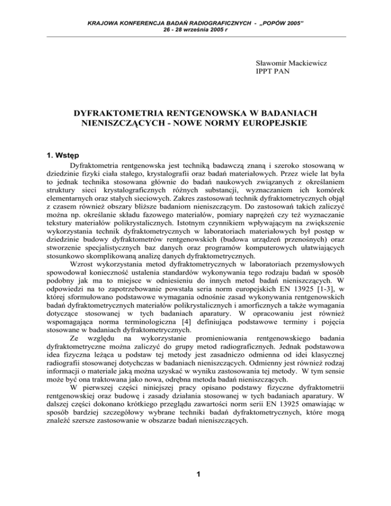 KRAJOWA KONFERENCJA BADAŃ RADIOGRAFICZNYCH - „POPÓW 2005” 26 - 28 września 2005 r Sławomir Mackiewicz IPPT PAN DYFRAKTOMETRIA RENTGENOWSKA W BADANIACH NIENISZCZĄCYCH - NOWE NORMY EUROPEJSKIE 1. Wstęp Dyfraktometria rentgenowska jest techniką badawczą znaną i szeroko stosowaną w dziedzinie fizyki ciała stałego, krystalografii oraz badań materiałowych. Przez wiele lat była to jednak technika stosowana głównie do badań naukowych związanych z określaniem struktury sieci krystalograficznych różnych substancji, wyznaczaniem ich komórek elementarnych oraz stałych sieciowych. Zakres zastosowań technik dyfraktometrycznych objął z czasem również obszary bliższe badaniom nieniszczącym. Do zastosowań takich zaliczyć można np. określanie składu fazowego materiałów, pomiary naprężeń czy też wyznaczanie tekstury materiałów polikrystalicznych. Istotnym czynnikiem wpływającym na zwiększenie wykorzystania technik dyfraktometrycznych w laboratoriach materiałowych był postęp w dziedzinie budowy dyfraktometrów rentgenowskich (budowa urządzeń przenośnych) oraz stworzenie specjalistycznych baz danych oraz programów komputerowych ułatwiających stosunkowo skomplikowaną analizę danych dyfraktometrycznych. Wzrost wykorzystania metod dyfraktometrycznych w laboratoriach przemysłowych spowodował konieczność ustalenia standardów wykonywania tego rodzaju badań w sposób podobny jak ma to miejsce w odniesieniu do innych metod badań nieniszczących. W odpowiedzi na to zapotrzebowanie powstała seria norm europejskich EN 13925 [1-3], w której sformułowano podstawowe wymagania odnośnie zasad wykonywania rentgenowskich badań dyfraktometrycznych materiałów polikrystalicznych i amorficznych a także wymagania dotyczące stosowanej w tych badaniach aparatury. W opracowaniu jest również wspomagająca norma terminologiczna [4] definiująca podstawowe terminy i pojęcia stosowane w badaniach dyfraktometrycznych. Ze względu na wykorzystanie promieniowania rentgenowskiego badania dyfraktometryczne można zaliczyć do grupy metod radiograficznych. Jednak podstawowa idea fizyczna leżąca u podstaw tej metody jest zasadniczo odmienna od idei klasycznej radiografii stosowanej dotychczas w badaniach nieniszczących. Odmienny jest również rodzaj informacji o materiale jaką można uzyskać w wyniku zastosowania tej metody. W tym sensie może być ona traktowana jako nowa, odrębna metoda badań nieniszczących. W pierwszej części niniejszej pracy opisano podstawy fizyczne dyfraktometrii rentgenowskiej oraz budowę i zasady działania stosowanej w tych badaniach aparatury. W dalszej części dokonano krótkiego przeglądu zawartości norm serii EN 13925 omawiając w sposób bardziej szczegółowy wybrane techniki badań dyfraktometrycznych, które mogą znaleźć szersze zastosowanie w obszarze badań nieniszczących. 1 KRAJOWA KONFERENCJA BADAŃ RADIOGRAFICZNYCH - „POPÓW 2005” 26 - 28 września 2005 r 2. Podstawy fizyczne dyfraktometrii rentgenowskiej U podstaw metod dyfraktometrycznych leży fakt, że większość spotykanych w przyrodzie substancji ma strukturę krystaliczną czyli składa się z atomów ułożonych w regularny i ściśle uporządkowany sposób określony przez strukturę sieci krystalograficznej. Wielkość pojedynczych kryształów czyli obszarów materiału, w których zachowane jest określone uporządkowanie atomów może być przy tym bardzo różna; mogą to być zarówno pojedyncze monokryształy o rozmiarach rzędu centymetrów jak też ziarna materiałów polikrystalicznych o rozmiarach rzędu mikrometrów. Typowe materiały techniczne (metale, ceramika) są polikryształami składającymi się wielkiej liczby krystalitów ułożonych w sposób przypadkowy w objętości materiału. Techniki stosowane w dyfraktometrii rentgenowskiej są w pewnym stopniu zależne od tego czy badany obiekt ma formę pojedynczego monokryształu czy też próbki polikrystalicznej jednak podstawowa idea dyfrakcji jest taka sama. Na rys. 1 przedstawiono schemat ułożenia atomów w prostej sieci krystalograficznej. Rys.1. Przykładowy schemat ułożenia atomów w sieci krystalicznej z oznaczeniem różnych grup (rodzin) wzajemnie równoległych płaszczyzn krystalograficznych. Przez atomy sieci poprowadzić można wiele różnych, wzajemnie równoległych grup płaszczyzn krystalograficznych. Niektóre grupy płaszczyzn są gęsto upakowane atomami jak np. grupa (010) inne zaś, jak np. (310) zawierają znacznie mniej atomów. Można sobie wyobrazić, że każda płaszczyzna atomów stanowi dla padających promieni rentgenowskich rodzaj półprzepuszczalnego zwierciadła, które częściowo odbija te promienie zgodnie z prawami optyki geometrycznej (kąt odbicia = kątowi padania). Schemat takiego odbicia pokazano na rys. 2. Rys.2. Schemat odbicia promieni rentgenowskich od dwóch równoległych płaszczyzn atomowych. Odbicie promieni rentgenowskich (czyli fal elekromagnetycznych o długościach fali porównywalnych z odległościami międzyatomowymi) od pojedynczej płaszczyzny atomów jest o wiele za słabe aby mogło zostać zaobserwowane doświadczalnie. Jednak w przypadku gdy odbicia od 2, 3 i kilkuset następnych równoległych płaszczyzn krystalograficznych nałożą 2 KRAJOWA KONFERENCJA BADAŃ RADIOGRAFICZNYCH - „POPÓW 2005” 26 - 28 września 2005 r się na siebie „w zgodnej fazie” sumaryczna fala odbita będzie na tyle silna, że spowoduje wyraźnie mierzalny efekt nazywany często odbiciem interferencyjnym lub odbiciem Bragga. Warunki jakie muszą być spełnione aby efekt ten wystąpił zostały po raz pierwszy podane przez Bragga w 1913r i noszą nazwę prawa Bragga: 2d sin( ) n (1) gdzie: d – odległość między sąsiednimi płaszczyznami atomowymi θ- kąt dyfrakcji (patrz rys.2) - długość fali promieniowania rentgenowskiego n – liczba naturalna Równanie (1) wyraża w prosty sposób warunek odbicia interferencyj