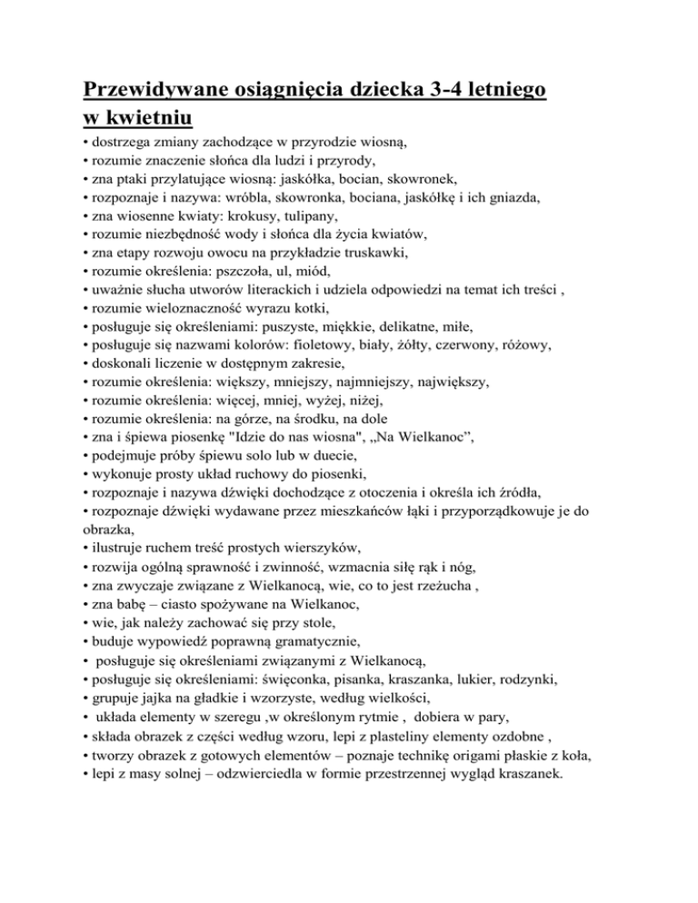 Przewidywane osiągnięcia dziecka 3-4 letniego w kwietniu •dostrzega zmiany zachodzące w przyrodzie wiosną, • rozumie znaczenie słońca dla ludzi i przyrody, • zna ptaki przylatujące wiosną: jaskółka, bocian, skowronek, • rozpoznaje i nazywa: wróbla, skowronka, bociana, jaskółkę i ich gniazda, • zna wiosenne kwiaty: krokusy, tulipany, • rozumie niezbędność wody i słońca dla życia kwiatów, • zna etapy rozwoju owocu na przykładzie truskawki, • rozumie określenia: pszczoła, ul, miód, • uważnie słucha utworów literackich i udziela odpowiedzi na temat ich treści , • rozumie wieloznaczność wyrazu kotki, • posługuje się określeniami: puszyste, miękkie, delikatne, miłe, • posługuje się nazwami kolorów: fioletowy, biały, żółty, czerwony, różowy, • doskonali liczenie w dostępnym zakresie, • rozumie określenia: większy, mniejszy, najmniejszy, największy, • rozumie określenia: więcej, mniej, wyżej, niżej, • rozumie określenia: na górze, na środku, na dole • zna i śpiewa piosenkę "Idzie do nas wiosna", „Na Wielkanoc”, • podejmuje próby śpiewu solo lub w duecie, • wykonuje prosty układ ruchowy do piosenki, • rozpoznaje i nazywa dźwięki dochodzące z otoczenia i określa ich źródła, • rozpoznaje dźwięki wydawane przez mieszkańców łąki i przyporządkowuje je do obrazka, • ilustruje ruchem treść prostych wierszyków, •rozwija ogólną sprawność i zwinność, wzmacnia siłę rąk i nóg, • zna zwyczaje związane z Wielkanocą, wie, co to jest rzeżucha , • zna babę – ciasto spożywane na Wielkanoc, • wie, jak należy zachować się przy stole, • buduje wypowiedź poprawną gramatycznie, •posługuje się określeniami związanymi z Wielkanocą, • posługuje się określeniami: święconka, pisanka, kraszanka, lukier, rodzynki, • grupuje jajka na gładkie i wzorzyste, według wielkości, •układa elementy w szeregu ,w określonym rytmie , dobiera w pary, • składa obrazek z części według wzoru lepi z plasteliny elementy ozdobne , • tworzy obrazek z gotowych elementów – poznaje technikę origami płaskie z koła, • lepi z masy solnej – odzwierciedla w formie przestrzennej wygląd kraszanek. ŚMIECIU PRECZ - Piosenka Kiedy rano słońce świeci. Wybiegają na dwór dzieci. Lecz zabawa się nie kleci, Bo dokoła sterty śmieci Ref. Śmieciu precz , brudzie precz, Ład porządek dobra rzecz, Śmieciu precz, brudzie precz, v Ład porządek dobra rzecz. IDZIE DO NAS WIOSNA - Piosenka 1. Kiedy wiosna przyjdzie do nas, Roześmiana i zielona, Razem z wiosną wszystkie dzieci Zaśpiewają tak. Zielona trawa, zielony mech, Zielona żaba… rechu, rechu, rech. Zielona trawa, zielony mech, Zielona żaba… rechu, rechu, rech. 2. Rośnie trawa, rosną listki, Rosną szybko dzieci wszystkie. Przyfrunęły też bociany I klekocą tak. 3. W lesie kwitnie już zawilec, Obudziły się motyle, A wieczorem nad łąkami Słychać żabi śpiew. KWIECIEŃ - Wiersz (W. Domeradzki) W pelerynie z trawy, W błękitnym berecie, Polem, łąką, drogą Chodzi młody kwiecień. A że jest kapryśny, Wybaczyć mu trzeba, Kiedy zimnym deszczem Sieje prosto z nieba. Chociaż sieje gradem Las i młode żyta, Ale po nim prędko, Ciepły maj zakwita. WIOSNA - Wiersz (Magdalena Frączczak) Przyszła do nas wiosna, ciepła i radosna. Ptaszek pięknie śpiewa, zielenią się drzewa. Słonko w górze świeci, weselą się dzieci. Każdy dobry nastrój ma, niechaj wiosna długo trwa. PISANKI - Wiersz (Elżbieta Maria Minczakiewicz) Pisanki, pisanki, jajka malowane nie ma Wielkanocy bez barwnych pisanek. Pisanki, pisanki jajka kolorowe, na nich malowane bajki pisankowe. Na jednej kogucik, a na drugiej słońce, śmieją się na trzeciej laleczki tańczące. Na czwartej kwiatuszki, a na piątej gwiazdki. na każdej pisance piękne opowiastki. Tematyka zajęć w kwietniu: Już wiosna Święta Wielkanocne Jesteśmy małymi ekologami Sadzenie drzewek w ogrodzie przedszkolnym – 30.04.2014 rok (środa).