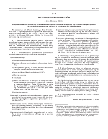 Dziennik Ustaw Nr 53 — 4778 — Poz. 312 312 ROZPORZĄDZENIE RADY MINISTRÓW z dnia 29 marca 2010 r. w sprawie zakresu informacji przedstawianych przez podmiot ubiegający się o pomoc inną niż pomoc de minimis lub pomoc de minimis w rolnictwie lub rybołówstwie Na podstawie art. 37 ust. 6 ustawy z dnia 30 kwietnia 2004 r. o postępowaniu w sprawach dotyczących pomocy publicznej (Dz. U. z 2007 r. Nr 59, poz. 404, z 2008 r. Nr 93, poz. 585 oraz z 2010 r. Nr 18, poz. 99) zarządza się, co następuje: § 1. Rozporządzenie określa zakres informacji przedstawianych przez podmiot ubiegający się o pomoc inną niż pomoc de minimis lub pomoc de minimis w rolnictwie lub rybołówstwie, zwany dalej „wnioskodawcą”, niezbędnych do udzielenia tej pomocy oraz wzór formularza informacji. § 2. 1. Wnioskodawca przedstawia podmiotowi udzielającemu pomocy informacje dotyczące: 1) wnioskodawcy: a) imię i nazwisko albo nazwę, b) adres miejsca zamieszkania albo adres siedziby, c) identyfikator gminy, w której wnioskodawca ma miejsce zamieszkania albo siedzibę, d) numer identyfikacji podatkowej (NIP), e) formę prawną, f) wielkość, g) klasę działalności, w związku z którą wnioskodawca ubiega się o pomoc publiczną, zgodnie z rozporządzeniem Rady Ministrów z dnia 24 grudnia 2007 r. w sprawie Polskiej Klasyfikacji Działalności (PKD) (Dz. U. Nr 251, poz. 1885 oraz z 2009 r. Nr 59, poz. 489), 5) pomocy otrzymanej w odniesieniu do tych samych kosztów kwalifikujących się do objęcia pomocą, na pokrycie których wnioskodawca ubiega się o pomoc publiczną; 6) pomocy otrzymanej na ratowanie lub restrukturyzację w okresie 10 lat poprzedzających dzień złożenia wniosku o udzielenie pomocy publicznej, w przypadku ubiegania się o pomoc tego rodzaju zgodnie z kryteriami określonymi przez Komisję Europejską w Wytycznych wspólnotowych dotyczących pomocy państwa w celu ratowania i restrukturyzacji zagrożonych przedsiębiorstw (Dz. Urz. UE C 244 z 01.10.2004, str. 2, z późn. zm.). 2. Informacje, o których mowa w ust. 1, przekazuje się na formularzu informacji przedstawianych przy ubieganiu się o pomoc inną niż pomoc de minimis lub pomoc de minimis w rolnictwie lub rybołówstwie, którego wzór określa załącznik do rozporządzenia, oraz przez przekazanie sprawozdań finansowych. § 3. Wnioskodawca, który nie otrzymał pomocy przeznaczonej na te same koszty kwalifikujące się do objęcia pomocą, na pokrycie których ubiega się o pomoc publiczną, przekazuje podmiotowi udzielającemu pomocy publicznej oświadczenie o nieotrzymaniu takiej pomocy. § 4. Wnioskodawca ubiegający się o pomoc na ratowanie lub restrukturyzację, który nie otrzymał pomocy publicznej przeznaczonej na ratowanie lub restrukturyzację w okresie 10 lat poprzedzających dzień złożenia wniosku o udzielenie pomocy publicznej, przekazuje podmiotowi udzielającemu pomocy publicznej oświadczenie o nieotrzymaniu takiej pomocy. h) datę utworzenia; 2) sytuacji ekonomicznej wnioskodawcy, w tym sprawozdania finansowe za okres 3 ostatnich lat obrotowych, sporządzane zgodnie z przepisami o rachunkowości; 3) obowiązku zwrotu kwoty stanowiącej równowartość udzielonej pomocy publicznej, co do której Komisja Europejska wydała decyzję o obowiązku zwrotu pomocy; 4) prowadzonej działalności gospodarczej, w związku z którą wnioskodawca ubiega się o pomoc publiczną; § 5. Rozporządzenie wchodzi w życie z dniem 5 kwietnia 2010 r.1) Prezes Rady Ministrów: D. Tusk 1) Niniejsze rozporządzenie poprzedzone było rozporządzeniem Rady Ministrów z dnia 20 marca 2007 r. w sprawie informacji o otrzymanej pomocy publicznej oraz informacji o nieotrzymaniu pomocy (Dz. U. Nr 61, poz. 413), które traci moc z dniem wejścia w życie ustawy z dnia 8 stycznia 2010 r. o zmianie ustawy o postępowaniu w sprawach dotyczących pomocy publicznej (Dz. U. Nr 18, poz. 99). Dziennik Ustaw Nr 53 — 4779 — Poz. 312 Załącznik do rozporządzenia Rady Ministrów z dnia 29 marca 2010 r. (poz. 312) WZÓR FORMULARZ INFORMACJI PRZEDSTAWIANYCH PRZY UBIEGANIU SIĘ O POMOC INNĄ NIŻ POMOC DE MINIMIS LUB POMOC DE MINIMIS W ROLNICTWIE LUB RYBOŁÓWSTWIE Dziennik Ustaw Nr 53 — 4780 — Poz. 312 Dziennik Ustaw Nr 53 — 4781 — Poz. 312 Dziennik Ustaw Nr 53 — 4782 — Poz. 312 Dziennik Ustaw Nr 53 — 4783 — Poz. 312 Dziennik Ustaw Nr 53 — 4784 — Poz. 312 Dziennik Ustaw Nr 53 — 4785 — Poz. 312 Dziennik Ustaw Nr 53 — 4786 — Poz. 312 Dziennik Ustaw Nr 53 — 4787 — Poz. 312 Dziennik Ustaw Nr 53 — 4788 — Poz. 312 Dziennik Ustaw Nr 53 — 4789 — Poz. 312 Dziennik Ustaw Nr 53 — 4790 — Poz. 312 Załącznik do formularza informacji przedstawianych przez wnioskodawcę INSTRUKCJA WYPEŁNIENIA TABELI W CZĘŚCI E FORMULARZA INFORMACJI PRZEDSTAWIANYCH PRZY UBIEGANIU SIĘ O POMOC INNĄ NIŻ POMOC DE MINIMIS LUB POMOC DE MINIMIS W ROLNICTWIE LUB RYBOŁÓWSTWIE Dziennik Ustaw Nr 53 — 4791 — Poz. 312 Dziennik Ustaw Nr 53 — 4792 — Poz. 312 Dziennik Ustaw Nr 53 — 4793 — Poz. 312 Dziennik Ustaw Nr 53 — 4794 — Poz. 312
