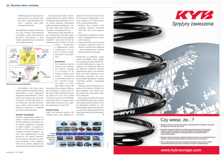 18 | Ekonomia, biznes, marketing poprzecznego czujnik ugięcia zawieszenia (4x) kątowej nadwozia Zastosowania Prace badawczo-rozwojowe związane z tym innowacyjnym systemem rozpoczęły sterownik się na początku lat 90. Pierwsze produkty seryjne lampka prawy tylny znalazły zastosowanie lewy tylny kontrolna amortyzator MR amortyzator MR w samochodach Cadilac Sekompresor układu ville i Chevrolet Corvette poziomowania (opcja) C5, modele z lat 2002Układ sterowania systemu MagneRide™ 2003. Obecnie system MR Pod względem ilości miejsca zajmo- wykorzystuje kilku wiodących producenwanego w pojeździe amortyzatory MR są tów samochodów na świecie: Audi (TT, porównywalne ze swymi tradycyjnymi R8), General Motors (Chevrolet Corvette (pasywnymi) odpowiednikami, a równo- C6, Cadillac DTS, STS i CTS-V, Holden cześnie mają mniejszą masę niż systemy HSV, Buick Lucerne), Ferrari (599GTB), z zaworami i mniej skomplikowane czę- Honda (Acura MDX). Po drogach całego ści mechanicznie. Płyn MR charaktery- świata jeździ już ponad 275 tys. pojazzuje się jednak znacznie większą masą dów wyposażonych w system MR. właściwą w porównaniu ze standardoKierunki rozwoju wym olejem amortyzatorowym. Delphi jako producent systemów MR prowadzi dalsze prace badawczo-roz Trwałość i niezawodność Charakter zastosowanego medium (zawiesina z cząstkami żelaza) sprawia, że elementy wewnętrzne amortyzatora muszą spełniać podwyższone wymagania w zakresie trwałości, a zwłaszcza od porności na ścierne zużycie. Dotyczy to szczególnie elementów ślizgowych i poModele kryć innych współpracujących ze sobą samochodów powierzchni, jak również uszczelnień. wyposażanych Pierwsze powinny odznaczać się zwiękfabrycznie szoną twardością i niskim współczyn w system nikiem tarcia, a drugie – odpornością na MagneRide™ agresywne działanie cząstek metalowych. Autonaprawa | nr 10/2009 wojowe ukierunkowane na wyeliminowanie ich obecnych niedoskonałości, a zarazem zwiększanie ich funkcjonalności. Prace te dotyczą optymalizacji: własności cieczy (trwałość, zakres temperatur roboczych, zwiększenie efektu MR, niższy koszt wytwarzania); komponentów amortyzatora (zmniejszenie niepożądanego tarcia, zwiększenie trwałości); reakcji amortyzatora na warunki pracy zawieszenia (zwiększenie zakresu sił tłumienia, skrócenie czasu reagowania – także w przypadku awarii zasilania, ewolucja algorytmu sterującego). Równocześnie, we współpracy z producentami samochodów, którzy zdecydowali się zastosować system MagneRide™ w modelach debiutujących w ciągu kilku następnych lat, trwają prace mające na celu optymalne dostrojenie elementów wykonawczych systemu, czyli amortyzatorów oraz układu sterowania, do projektowanego samochodu oraz wielostronne badania laboratoryjne i drogowe, weryfikujące trwałość i niezawodność konstrukcji. Niedługo ujrzymy innowacyjne amortyzatory MR w kolejnych markach i modelach pojazdów, w tym również w bardziej popularnych samochodach osobowych i terenowych. Od początku przyszłego roku technologia MagneRide będzie dalej rozwijana przez nowego właściciela fabryki w Krośnie (BeijingWest Industries Co., Ltd.) kontynuującego dotychczasowe kontrakty, a techniczne aspekty projektów pozostawać będą nadal pod kontrolą specjalistów Delphi. n Fot. Delphi Substancją bazową płynu magneto reologicznego jest ciecz stabilna i odporna na degradację swych właściwości w szerokim zakresie temperatur. Opatentowane dodatki polepszają funkcjonalność i trwałość płynu, gdyż mają działanie anty Kompatybilność z systemami stabilizacji utleniające i zmniejszające tarcie itp. Obecny poziom rozwoju konstrukcji i jatoru jazdy umożliwia wykorzystywanie ich sygnałów, a także udział sterowania kość zastosowanych materiałów zapewtłumieniem amortyzatorów w pracy niają skuteczne działanie amortyzatorów układów odpowiedzialnych za dynamikę MagneRide™ przez około 200 000 km przebiegu pojazdu. Zostało to zweryfiruchu całego samochodu. kowane laboratoryjnie prędkość samochodu w przyspieszonych testach część systemu lewy przedni prawy przedni trwałościowych oraz poESP amortyzator amortyzator czujnik kąta obrotu kolumnowy MR przez monitoring danych kolumnowy MR kierownicy serwisowych z sieci dealerczujnik czujnik skich. prędkości przyspieszenia dokładniejsza powtarzalność operacji wykonywanych przy produkcji seryjnej dzięki nieskomplikowanej geo metrii i niewielkiej liczbie współ pracujących elementów.