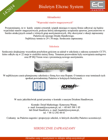 4 1 0 2 / 14 Biuletyn Eltcrac System Aktualności "Wyprzedaż stanów magazynowych" Przypominamy, że w każdy ostatni czwartek i piątek miesiąca w naszej firmie odbywać się będzie wyprzedaż stanów magazynowych, podczas której udostępnimy urządzenia sprawne, powystawowe w bardzo atrakcyjnych cenach z różnych grup asortymentowych. Aby skorzystać z okazji zapraszamy Państwa do naszego Działu Handlowego. Najbliższy termin to 29 i 30 maja. Serdecznie zapraszamy. Szkolenia Serdecznie dziękujemy wszystkim przybyłym gościom za udział w szkoleniu z zakresu systemów CCTV, które odbyło się w 22 maja w siedzibie naszej firmy. Tematem przewodnim były rozwiązania analogowe oraz IP HQ Vision wraz z prezentacją nowego asortymentu. W najbliższym czasie planujeszmy szkolenia z firmą Aco oraz Ropam. O tematyce oraz terminach tych spotkań powiadomimy Państwa w kolejnych biuletynach. W razie jakichkolwiek pytań prosimy o kontakt z naszym Działem Handlowym. Kontakt: Dział Marketingu- Katarzyna Wanat, e- mail: [email protected], tel. + 48 665 588 1 05 lub Dział Handlowy, e- mail: [email protected], tel. + 48 12 292 48 61 Czekamy na Państwa sugestie i propozycje szkoleń, w których chcieliby Państwo uczestniczyć. SERDECZNIE ZAPRASZAMY Aktualne ceny i asortyment w sklepie sklep.ecsystem.pl P Ciekawostki opularność sportowych kamer, wśród których prym wiodą produkty GoPro jest niezaprzeczalna. I to właśnie od jednego z modeli GoPro Hero zaczęła się historia kamery Centr. Stworzona przez grupę pasjonatów, którzy dołożyli swoje pięć groszy do sukcesu aparatów cyfrowych wbudowanych w produkty Apple jest jednym z ciekawszych projektów, które możemy znaleźć na Kickstarterze. Twórcy założyli sobie bardzo ambitny cel, zebranie 900 tysięcy dolarów. Jak na razie osiągnęli około 2/3 zamierzonej kwoty, ale nawet, gdy nie zbiorą pełnej, projekt powinien doczekać się finalizacji. Kamery GoPro Hero bardzo często wykorzystywane są w konfiguracji, gdzie połączone razem cztery lub więcej kamer rejestruje obraz panoramiczny pokrywający nawet 360 stopni w poziomie i 180 stopni w pionie. Celem było stworzenie pojedynczej kamery, która spełniałaby takie zadania. I tak, powoli rodziła się kamera Centr…Kamera stosuje zaawansowany algorytm, podobny do funkcji wykorzystywanych w najlepszych desktopowych aplikacjach do tworzenia panoram. Ostatecznie Centr przyjął formę niewielkiego pierścienia, który przypomina torus o ostro ściętych krawędziach. Otwór pośrodku pozwala na zamocowanie uchwytu, który zapewni kompatybilność ze statywami i uchwytami, na przykład na kask. A w ostateczności pozwala na założenie kamery na palec i filmowanie w ten sposób. Centr waży ćwierć kilograma, a wbudowane 4 kamery Omnivision o rozdzielczości 5 Mpix pozwalają rejestrować 360 stopniową panoramę wideo o rozdzielczości 6900 x 1080 pikseli (dopasowaną do wyświetlaczy Full HD). W razie potrzeby można wykonać również 20 Mpix zdjęcia panoramiczne, także w trybie poklatkowym (ich jakość nie jest zachwycająca, co jest wynikiem ograniczeń zastosowanych niewielkich sensorów jak i pojemności pamięci) lub wybrać jedną i zrobić zwykłe zdjęcie. Kamera Centr jest niewielka i spełnia zadanie, które polega na uwiecznianiu naszych przeżyć, co potwierdzają przykładowe filmy i przykładowe zdjęcia w sieci. By filmowanie było jak najbardziej komfortowe, Centr wyposażono w poziomnicę, która sygnalizuje prawidłowe wypoziomowanie za pomocą świateł LED. Obudowa jest odporna na zachlapanie, a w razie potrzeby w zestawie będzie dostępna dodatkowa obudowa wodoodporna. Zadbano również o wygodną szybką wymianę akumulatora. Technologia Bluetooth i Wi-Fi zapewni wygodne sterowanie kamerą za pomocą smartfona i podgląd obrazu na żywo. Centr ma trafić do sprzedaży w cenie 399 dolarów. Chętni do wsparcia projektu już teraz na Kickstarterze, zyskają szansę zakupienia kamery nawet za 199 dolarów. Opracowanie: Katarzyna Wanat Netografia: www.centrcam.com www.benchmark.pl www.digitaltrends.com Aktualne ceny i asortyment w sklepie sklep.ecsystem.pl Firma NSS wprowadziła nowe rejestratory do swojej oferty produktowej, wśród których wyróżnia się rejestrator 8 kanałowy BCS-DVR0804QHD. Specyfikacja techniczna: • Kompresja H.264 zapewnia maksymalną jakość nagrań przy minimalnej zajętości dysku • Podgląd na żywo w czasie rzeczywistym 8 kamer o rozdzielczości 1080p • Nagrywanie do 200 kl/s w rozdzielczości 1080P • Podwójny strumień kodowania, zapewnia elastyczną pracę przez sieć, telefon, pda, iphone, itp. • Funkcja Pentaplex: obraz na żywo, nagrywanie, odtwarzanie, archiwizacja i zdalny dostęp • Obsługa 4 dysków SATA, maksymalnie do 4 TB, 2 porty USB 2.0, port e-sata • Wyjścia video: VGA, HDMI, BNC • Jednoczesne synchroniczne odtwarzanie 8 kanałów • Możliwość sterowania za pomocą myszy komputerowej, pilota, z panelu przedniego lub klawiatury sterującej (BCS-KBDB, NKBDB) • Inteligentna detekcja ruchu: zasłonięcie kamery, zanik sygnału, wykrycie ruchu • Łatwa archiwizacja: pamięć USB, sieć • 4 wejścia/1 wyjście audio • 8 wejścia/6 wyjścia alarmowe • Obsługa pozycjonowania 3D z kamerami PTZ BCS • Wyzwalanie alarmów: komunikat na ekranie, brzęczyk, reakcja PTZ, e-mail, FTP • Pełna obsługa przez sieć: wbudowany web-server, obsługa do 10 użytkowników jednocześnie, MSS(mobilna aplikacja), CMS • wyjścia przelotowe - BRAK, Cena detaliczna netto 3585 zł Biuletyn Eltcrac wydawany jest przez: Eltcrac System sp z o.o. ul. Ruciana 3; 30- 803 Kraków tel. 1 2 292 48 61 , fax 1 2 292 48 62, mob. 506 009 11 4 adres e- mail: [email protected] www.ecsystem.pl, www.sklep.ecsystem.pl, www.nixar.pl Aktualne ceny i asortyment w sklepie sklep.ecsystem.pl Aktualne ceny i asortyment w sklepie sklep.ecsystem.pl Warto także zwrócić uwage na kamerę dualną, kompaktową, 
