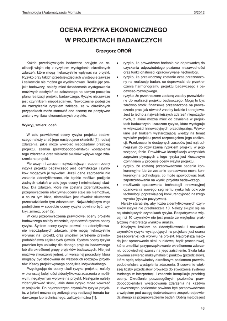 Technologia i Automatyzacja Montażu 3/2012 OCENA RYZYKA EKONOMICZNEGO W PROJEKTACH BADAWCZYCH Grzegorz OROŃ Każde przedsięwzięcie badawcze przyjęte do realizacji wiąże się z ryzykiem wystąpienia określonych zdarzeń, które mogą niekorzystnie wpływać na projekt. Ryzyko przy takich przedsięwzięciach występuje zawsze i całkowicie nie można go wyeliminować. Realizując projekt badawczy, należy mieć świadomość występowania możliwych odchyleń od założonego na samym początku planu realizacji projektu badawczego. Ryzyko nie zawsze jest czynnikiem niepożądanym. Nowoczesne podejście do zarządzania ryzykiem zakłada, że w określonych przypadkach może stanowić ono szansę na pozytywne zmiany wyników ekonomicznych projektu. Wykryj, zmierz, oceń W celu prawidłowej oceny ryzyka projektu badawczego należy znać jego następujące składniki [1]: rodzaj zdarzenia, jakie może wywołać niepożądany przebieg projektu, szansa (prawdopodobieństwo) wystąpienia tego zdarzenia oraz wielkość skutków wpływu tego zdarzenia na projekt. Pierwszym i zarazem najważniejszym etapem oceny ryzyka projektu badawczego jest identyfikacja czynników mogących je wywołać. Jeżeli dane zagrożenie nie zostanie zidentyfikowane, nie będzie możliwe podjęcie żadnych działań w celu jego oceny i minimalizacji skutków. Dla zdarzeń, które nie zostaną zidentyfikowane, przeprowadzenie efektywnej oceny staje się niemożliwe, a co za tym idzie, niemożliwe jest również skuteczne przeciwdziałanie tym zdarzeniom. Najważniejszym więc podejściem w sposobie oceny ryzyka powinno być: wykryj, zmierz, oceń [2]. W celu przeprowadzenia prawidłowej oceny projektu badawczego należy wcześniej opracować system oceny ryzyka. System oceny ryzyka pozwoli na zidentyfikowanie niepożądanych zdarzeń, jakie mogą niekorzystnie wpłynąć na projekt, oraz umożliwi określenie prawdopodobieństwa zajścia tych zjawisk. System oceny ryzyka powinien być unikalny dla danego projektu badawczego lub dla określonej grupy projektów badawczych. Nie jest możliwe stworzenie jednej, uniwersalnej procedury, która mogłaby być stosowana do wszystkich rodzajów projektów. Każdy projekt wymaga podejścia indywidualnego. Przystępując do oceny skali ryzyka projektu, należy w pierwszej kolejności zidentyfikować zdarzenia o możliwym, negatywnym wpływie na projekt. Następnie należy zidentyfikować skutki, jakie dane ryzyko może wywrzeć w projekcie. Do najczęstszych czynników ryzyka projektu, z jakimi można się zetknąć przy realizacji tematu badawczego lub technicznego, zaliczyć można [1]: •• ryzyko, że prowadzone badania nie doprowadzą do uzyskania odpowiedniego poziomu niezawodności oraz funkcjonalności opracowywanej technologii. •• ryzyko, że przekroczony zostanie czas przeznaczony na realizację badań, co doprowadzi do przekroczenia harmonogramu projektu badawczego i badawczo-rozwojowego. •• ryzyko, że przekroczone zostaną zasoby przewidziane do realizacji projektu badawczego. Mogą to być zarówno środki finansowe przeznaczone na prowadzenie prac, jak również zasoby ludzkie i sprzętowe. Jest to jedno z najważniejszych zdarzeń niepożądanych, z jakimi można mieć do czynienia w projektach badawczych i zarazem ryzyko, które występuje w większości innowacyjnych przedsięwzięć. Wywołane jest brakiem wystarczającej wiedzy na temat wyników projektu przed rozpoczęciem jego realizacji. Przekroczenie dostępnych zasobów jest najtrudniejszym do rozwiązania ryzykiem projektu w jego wstępnej fazie. Prawidłowa identyfikacja wszystkich zagrożeń płynących z tego ryzyka jest kluczowym czynnikiem w procesie oceny ryzyka projektu. •• ryzyko, że zostaną przeprowadzone badania konkurencyjne lub że zostanie opracowana nowa konkurencyjna technologia, co może spowodować brak zapotrzebowania na wyniki projektu badawczego, •• możliwość opracowania technologii innowacyjnej opanowania nowego segmentu rynku lub odkrycie technologii poprawiającej konkurencyjność naszego wyrobu (ryzyko pozytywne). Należy starać się, aby liczba zidentyfikowanych czynników ryzyka nie przekraczała 10. Należy skupić się na najistotniejszych czynnikach ryzyka. Rozpatrywanie więcej niż 10 czynników nie jest proste ze względów praktycznej interpretacji wyników analizy. Kolejnym krokiem po zidentyfikowaniu i nazwaniu czynników ryzyka występujących w projekcie jest ocena (oszacowanie) ich wpływu na projekt. Najprostszą metodą jest opracowanie skali punktowej bądź procentowej, która umożliwi przyporządkowanie określonemu zdarzeniu odpowiedniej szansy na jego zaistnienie. Skala taka powinna zawierać maksymalnie 5 punktów (przedziałów), które będą odpowiadały określonym poziomom prawdopodobieństwa wystąpienia zdarzenia. Stosowanie większej liczby przedziałów prowadzi do stworzenia systemu trudnego w interpretacji i znacznie komplikuje przebieg oceny. Określenie poszczególnych poziomów prawdopodobieństwa występowania zdarzenia na każdym z utworzonych poziomów powinno być przeprowadzone z wzięciem pod uwagę doświadczenie zespołu odpowiedzialnego za przeprowadzenie badań. Dobrą metodą jest 43 3/2012 Technologia i Automatyzacja Montażu metoda porównawcza, która polega na porównaniu projektu badawczego do innego, podobnego projektu, który został zrealizowany wcześniej. Może to być zarówno projekt realizowany w tej samej jednostce badawczej, jak również inny projekt, co do którego istnieje możliwość pozyskania odpowiednich informacji. Można również skorzystać ze specjalistycznej wiedzy zewnętrznej firm, które specjalizują się w określaniu oceny ryzyka projektów. Jest to etap, w którym tworzymy kryterium (przedziały) oceny prawdopodobieństwa występowania niepożądanego zjawiska. Jest to etap bardzo subiektywny. Często zdarza się, że tworząc poszczególne granice przedziałów, musimy