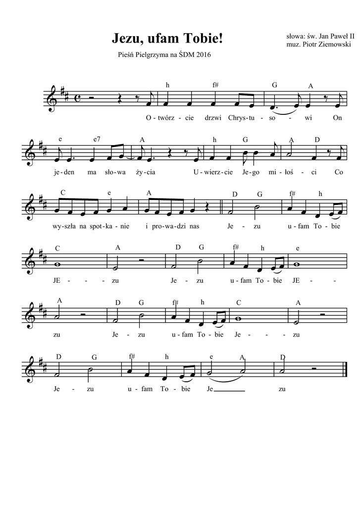 Jezu, ufam Tobie! słowa: św. Jan Paweł II muz. Piotr Ziemowski Pieśń Pielgrzyma na ŚDM 2016 ## c & # # je & j & & ## & ## & ## j e7 . A ma sło - wa C e - - - A A zu Je D Je i pro - wa - dzi nas Je G - zu - - zu h zu u - fam To - bie h To - bie - - zu e Je A - ci Co h e w JE A - j u - fam To - bie C Je On D f# h w wi mi - łoś G j A A u - fam To - bie f# u - fam Je - go f# G f# J Je G . j G D D D zu h U - wierz - cie A C JE . j G drzwi Chrys - tu - so j ży - cia wy - szła na spot - ka - nie w f# O - twórz - cie je - den ## h - D zu zu - -