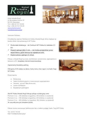 Hotel Arkadia Royal Ul. Bronisława Czecha 10 04-555 Warszawa Tel. (+48) 22/ 517-36-60 Fax: (+48) 22/ 517-36-69 www.arkadiaroyal.pl [email protected] Szanowni Państwo, Chcielibyśmy zaprosić Państwa do Hotelu Arkadia Royal, który znajduje się bardzo blisko hal wystawowych MT Polska. Doskonała lokalizacja - do Centrum MT Polska to zaledwie 2,5 km. Dojazd zajmuje tylko 5 min. – nie trzeba przejeżdżać przez węzeł Marsa, gdzie tworzą się największe korki. Dojście pieszo zajmuje 15 minut. Pokoje w Arkadii Royal są nowe, komfortowe i przestronne, wyposażone w telewizor LCD i bezpłatny internet bezprzewodowy. Zapewniamy bezpłatny parking. Oferujemy 10 % rabatu na dania z karty menu ( bez napoi ) na hasło Targi MT Polska. Dysponujemy: • Restauracją • Salami konferencyjnymi z nowoczesnym wyposażeniem • Saunami, jacuzzi i łąką słoneczną • Letnim Grill Barem • Bezpłatnym parkingiem Dla MT Polska Arkadia Royal oferuje pokoje w atrakcyjnej cenie: Premium 1-os. – 200 zł/doba( w tygodniu), 190 zł/doba ( w weekend) Premium 2-os. – 290 zł/doba( w tygodniu), 220 zł/doba ( w weekend) Premium 3-os. – 420 zł/doba ( w tygodniu), 362 zł/doba ( w weekend) W cenę wliczone jest śniadanie (bufet) . Pokoje można rezerwować telefonicznie lub e-mailem podając hasło: Targi MT Polska Tel.: 22/517-36-60 Mail: [email protected]