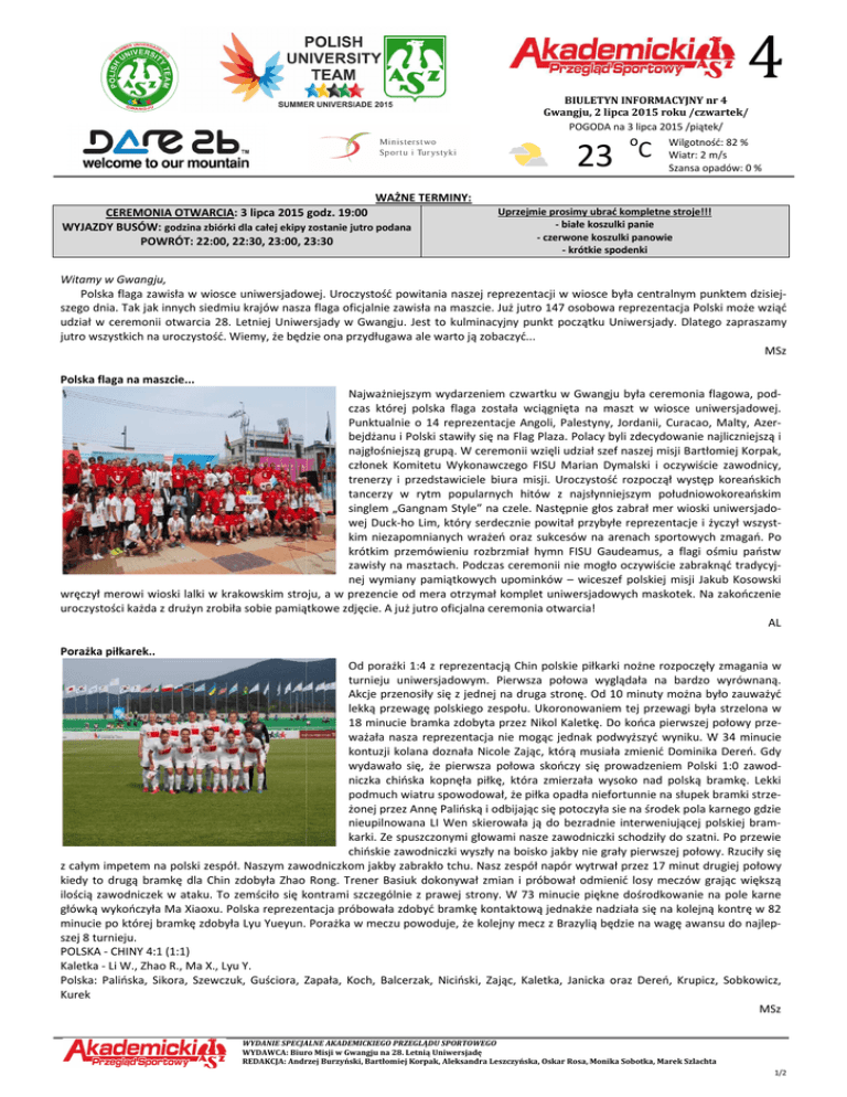 4 BIULETYN INFORMACYJNY nr 4 Gwangju, 2 lipca 2015 roku /czwartek/ POGODA na 3 lipca 2015 /piątek/ o Wilgotność: 82 % Wiatr: 2 m/s Szansa opadów: 0 % 23 3 WAŻNE TERMINY: CEREMONIA OTWARCIA:: 3 lipca 2015 godz. 19:00 WYJAZDY BUSÓW: godzina zbiórki dla całej ekipy zostanie jutro podana POWRÓT: 22:00, 22:30, 23:00, 23:30 C Uprzejmie prosimy ubrać kompletne stroje!!! - białe koszulki panie - czerwone koszulki panowie - krótkie spodenki Witamy w Gwangju, Polska flaga zawisła w wiosce uniwersjadowej. Uroczystość powitania naszej reprezentacji w wiosce była centralnym punktem dzisiejdzi szego dnia. Tak jak innych siedmiu krajów nasza flaga oficjalnie zawisła na maszcie. Już jutro 147 osobowa reprezentacja Polski może wziąć udział w ceremonii otwarcia 28. Letniej Uniwersjady w Gwangju. Jest to kulminacyjny punkt początku Uniwersjady. Dlatego zapraszamy zapra jutro tro wszystkich na uroczystość. Wiemy, że będzie ona przydługawa ale warto ją zobaczyć... zobaczyć MSz Polska flaga na maszcie... Najważniejszym wydarzeniem czwartku w Gwangju była ceremonia flagowa, podpo czas której polska flaga została wciągnięta na maszt w wiosce uniwersjadowej. Punktualnie o 14 reprezentacje Angoli, Palestyny, Jordanii, Curacao, Malty, AzerAze bejdżanu i Polski stawiły się na Flag Plaza. Polacy byli zdecydowanie najliczniejszą i najgłośniejszą grupą. W ceremonii wzięli udział szef naszej misji Bartłomiej Bartło Korpak, członek Komitetu Wykonawczego FISU Marian Dymalski i oczywiście zawodnicy, trenerzy i przedstawiciele biura misji. Uroczystość rozpoczął rozp występ koreańskich tancerzy w rytm popularnych hitów z najsłynniejszym południowokoreańskim singlem „Gangnam am Style” na czele. Następnie głos zabrał mer wioski uniwersjadouniwersjad wej Duck-ho ho Lim, który serdecznie powitał przybyłe reprezentacje i życzył wszystwszys kim niezapomnianych pomnianych wrażeń oraz sukcesów na arenach sportowych zmagań. Po krótkim przemówieniu rozbrzmiał hymn FISU ISU Gaudeamus, a flagi ośmiu państw zawisły na masztach. Podczas ceremonii nie mogło oczywiście zabraknąć tradycyjtradycy nej wymiany pamiątkowych upominków – wiceszef polskiej misji Jakub Kosowski wręczył merowi wioski lalki w krakowskim stroju, a w prezencie od mera otrzymał komplet uniwersjadowych sjadowych maskotek. Na zakończenie uroczystości każda z drużyn zrobiła sobie pamiątkowe zdjęcie. A już jutro oficjalna ceremonia otwarcia! otwa AL Porażka piłkarek.. Od porażki 1:4 z reprezentacją Chin polskie piłkarki nożne rozpoczęły zmagania w turnieju uniwersjadowym. Pierwsza połowa wyglądała na bardzo wyrównaną. Akcje przenosiły się z jednej na druga stronę. Od 10 minuty można było zauważyć lekką przewagę polskiego zespołu. łu. Ukoronowaniem tej przewagi była strzelona w 18 minucie bramka zdobyta przez Nikol Kaletkę. Do końca pierwszej połowy przeprz ważała nasza reprezentacja nie mogąc jednak podwyższyć wyniku. W 34 minucie kontuzji kolana doznała Nicole Zając, którą musiała zmienić Dominika D Dereń. Gdy wydawało się, że pierwsza połowa łowa skończy się prowadzeniem Polski 1:0 zawodzawo niczka chińska kopnęła piłkę, która zmierzała rzała wysoko nad polską bramkę. Lekki podmuch wiatru spowodował, że piłka opadła niefortunnie na słupek bramki strzestrz żonej przez Annę Palińską i odbijając się potoczyła sie si na środek pola karnego gdzie nieupilnowana LI Wen skierowała ją do bezradnie interweniującej polskiej po bramkarki. Ze spuszczonymi głowami nasze zawodniczki schodziły do szatni. Po przewie chińskie zawodniczki wyszły na boisko jakby nie grały pierwszej połowy. poł Rzuciły się z całym impetem na polski zespół. Naszym zawodniczkom jakby zabrakło tchu. Nasz zespół napór wytrwał przez 17 minut drugiej połowy kiedy to drugą bramkę dla Chin zdobyła Zhao Rong. Trener Basiuk dokonywał zmian i próbował pr bował odmienić losy meczów grając większą ilością zawodniczek w ataku. To zemściło się kontrami szczególnie z prawej strony. W 73 minucie piękne dośrodkowanie na pole karne główką wykończyła Ma Xiaoxu. Polska reprezentacja próbowała zdobyć bramkę kontaktową jednakże jedna że nadziała się na kolejną kontrę w 82 minucie po której bramkę zdobyła Lyu Yueyun. Porażka w meczu powoduje, że kolejny mecz z Brazylią Br lią będzie na wagę awansu do najlepnajle szej 8 turnieju. POLSKA - CHINY 4:1 (1:1) Kaletka - Li W., Zhao R., Ma X., Lyu Y. Polska: Palińska, Sikora, ora, Szewczuk, Guściora, Zapała, Koch, Balcerzak, Niciński, Zając, Kaletka, Janicka oraz Dereń, Krupicz, Sobkowicz, Kurek MSz WYDANIE SPECJALNE AKADEMICKIEGO PRZEGLĄDU SPORTOWEGO WYDAWCA: Biuro Misji w Gwangju na 28. Letnią Uniwersjadę REDAKCJA: Andrzej Burzyński, Bartłomiej Korpak, Aleksandra Leszczyńska, Oskar Rosa, Monika Sobotka, Marek Szlachta 1/2 INFORMACJE DLA TRENERÓW Najbliższe spotkania techniczne (General Technical Meeting): 3 LIPCA DYSCYPLINA GODZINA MIEJSCE ŁUCZNICTWO (ARCHERY) SZERMIERKA (FENCING) JUDO TENIS (TENNIS) 10:30 10:00 12:00 9:00 Gwangju International Archery Field KimDaeJoong Convention Center AV Residential Zone Jinwol International Tennis Court Kilka pytań do… Eryk Rodzik - taekwondo 2009: złoty medal Mistrzostw Polski we Wrocławiu brązowy medal Młodzieżowych Mistrzostw Europy w Vigo 2010: złoty medal Mistrzostw Polski w Luboniu Kiedy rozpocząłeś karierę sportową? 14 lat temu. Życiowe motto? Nigdy się nie poddawać... Co uważasz za swój największy sukces w dotychczasowej karierze? Wytrwałość... Nadzieje na ten sezon sportowy? Medal na Uniwersjadzie. Pierwsze wrażenie po przyjeździe do Gwangju? Jest dobrze. Jak smakuje Ci kuchnia koreańska? Zjadliwa. Jaki wynik zadowoli Cię na Uniwersjadzie? Pozycja medalowa. Dziękuje za rozmowę Dziękuje. Msza Święta w języku angielskim Sobota i Niedziela 19:30 Wtorek, Czwartek 9