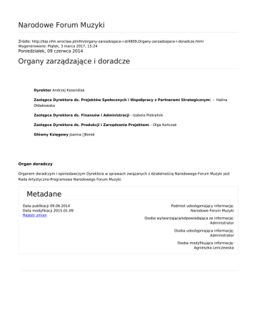 Narodowe Forum Muzyki Źródło: http://bip.nfm.wroclaw.pl/nfm/organy-zarzadzajace-i-d/4909,Organy-zarzadzajace-i-doradcze.html Wygenerowano: Piątek, 3 marca 2017, 15:24 Poniedziałek, 09 czerwca 2014 Organy zarządzające i doradcze Dyrektor Andrzej Kosendiak Zastępca Dyrektora ds. Projektów Społecznych i Współpracy z Partnerami Strategicznymi - Halina Ołdakowska Zastępca Dyrektora ds. Finansów i Administracji - Izabela Piekielnik Zastępca Dyrektora ds. Produkcji i Zarządzania Projektami - Olga Kończak Główny Księgowy Joanna Borek Organ doradczy Organem doradczym i opiniodawczym Dyrektora w sprawach związanych z działalnością Narodowego Forum Muzyki jest Rada Artystyczno-Programowa Narodowego Forum Muzyki. Metadane Data publikacji 09.06.2014 Data modyfikacji 2015.01.09 Rejestr zmian Podmiot udostępniający informację: Narodowe Forum Muzyki Osoba wytwarzająca/odpowiadająca za informację: Administrator Osoba udostępniająca informację: Administrator Osoba modyfikująca informację: Agnieszka Lenczewska
