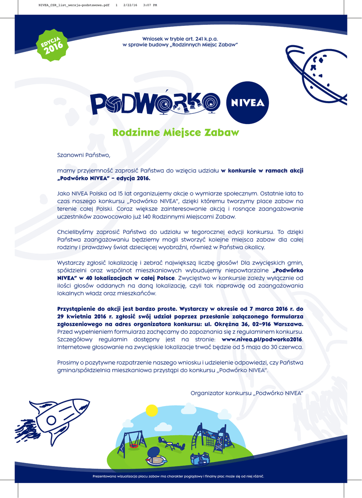 NIVEA_CSR_list_wersja-podstawowa.pdf 1 2/22/16 3:07 PM Wniosek w trybie art. 241 k.p.a. w sprawie budowy „Rodzinnych Miejsc Zabaw” Rodzinne Miejsce Zabaw Szanowni Państwo, mamy przyjemność zaprosić Państwa do wzięcia udziału w konkursie w ramach akcji „Podwórko NIVEA” – edycja 2016. Jako NIVEA Polska od 15 lat organizujemy akcje o wymiarze społecznym. Ostatnie lata to czas naszego konkursu „Podwórko NIVEA”, dzięki któremu tworzymy place zabaw na terenie całej Polski. Coraz większe zainteresowanie akcją i rosnące zaangażowanie uczestników zaowocowało już 140 Rodzinnymi Miejscami Zabaw. Chcielibyśmy zaprosić Państwa do udziału w tegorocznej edycji konkursu. To dzięki Państwa zaangażowaniu będziemy mogli stworzyć kolejne miejsca zabaw dla całej rodziny i prawdziwy świat dziecięcej wyobraźni, również w Państwa okolicy. Wystarczy zgłosić lokalizację i zebrać największą liczbę głosów! Dla zwycięskich gmin, spółdzielni oraz wspólnot mieszkaniowych wybudujemy niepowtarzalne „Podwórko NIVEA” w 40 lokalizacjach w całej Polsce. Zwycięstwo w konkursie zależy wyłącznie od ilości głosów oddanych na daną lokalizację, czyli tak naprawdę od zaangażowania lokalnych władz oraz mieszkańców. Przystąpienie do akcji jest bardzo proste. Wystarczy w okresie od 7 marca 2016 r. do 29 kwietnia 2016 r. zgłosić swój udział poprzez przesłanie załączonego formularza zgłoszeniowego na adres organizatora konkursu: ul. Okrężna 36, 02–916 Warszawa. Przed wypełnieniem formularza zachęcamy do zapoznania się z regulaminem konkursu. Szczegółowy regulamin dostępny jest na stronie: www.nivea.pl/podworko2016. Internetowe głosowanie na zwycięskie lokalizacje trwać będzie od 5 maja do 30 czerwca. Prosimy o pozytywne rozpatrzenie naszego wniosku i udzielenie odpowiedzi, czy Państwa gmina/spółdzielnia mieszkaniowa przystąpi do konkursu „Podwórko NIVEA”. Organizator konkursu „Podwórko NIVEA” Prezentowana wizualizacja placu zabaw ma charakter poglądowy i finalny plac może się od niej różnić.