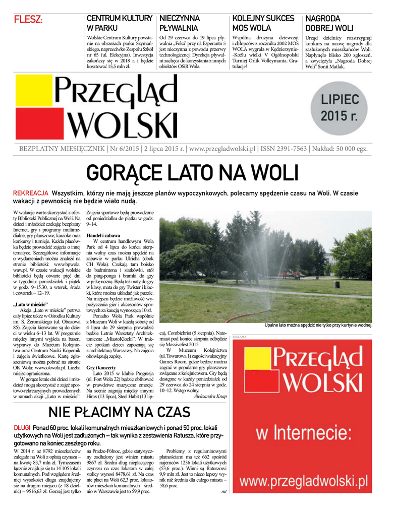FLESZ: CENTRUM KULTURY NIECZYNNA W PARKU PŁYWALNIA KOLEJNY SUKCES MOS WOLA NAGRODA DOBREJ WOLI Wolskie Centrum Kultury powstanie na obrzeżach parku Szymańskiego, naprzeciwko Zespołu Szkół nr 65 (ul. Elekcyjna). Inwestycja zakończy się w 2018 r. i będzie kosztować 15,5 mln zł. Od 29 czerwca do 19 lipca pływalnia „Foka” przy ul. Esperanto 5 jest nieczynna z powodu przerwy technologicznej. Dyrekcja pływalni zachęca do korzystania z innych obiektów OSiR Wola. Wspólna drużyna dziewcząt i chłopców z rocznika 2002 MOS WOLA wygrała w Kędzierzynie-Koźlu wielki V Ogólnopolski Turniej Orlik Volleymania. Gratulacje! Urząd dzielnicy rozstrzygnął konkurs na nazwę nagrody dla zasłużonych mieszkańców Woli. Napłynęło blisko 200 zgłoszeń, a zwyciężyła „Nagroda Dobrej Woli” Sonii Matlak. BEZPŁATNY MIESIĘCZNIK | Nr 6/2015 | 2 lipca 2015 r. | www.przegladwolski.pl | ISSN 2391-7563 | Nakład: 50 000 egz. GORĄCE LATO NA WOLI REKREACJA Wszystkim, którzy nie mają jeszcze planów wypoczynkowych, polecamy spędzenie czasu na Woli. W czasie wakacji z pewnością nie będzie wiało nudą. W wakacje warto skorzystać z oferty Biblioteki Publicznej na Woli. Na dzieci i młodzież czekają: bezpłatny Internet, gry i programy multimedialne, gry planszowe, karaoke oraz konkursy i turnieje. Każda placówka będzie prowadzić zajęcia o innej tematyce. Szczegółowe informacje o wydarzeniach można znaleźć na stronie biblioteki: www.bpwola. waw.pl. W czasie wakacji wolskie biblioteki będą otwarte pięć dni w tygodniu: poniedziałek i piątek w godz. 9‒15.30, a wtorek, środa i czwartek – 12‒19. „Lato w mieście” Akcja „Lato w mieście” potrwa cały lipiec także w Ośrodku Kultury im. S. Żeromskiego (ul. Obozowa 85). Zajęcia kierowane są do dzieci w wieku 6‒13 lat. W programie między innymi wyjścia na basen, wyprawy do Muzeum Kolejnictwa oraz Centrum Nauki Kopernik i zajęcia świetlicowe. Kartę zgłoszeniową można pobrać na stronie OK Wola: www.okwola.pl. Liczba miejsc ograniczona. W gorące letnie dni dzieci i młodzież mogą skorzystać z zajęć sportowo-rekreacyjnych prowadzonych w ramach akcji „Lato w mieście”. Zajęcia sportowe będą prowadzone od poniedziałku do piątku w godz. 9‒14. Handel i zabawa W centrum handlowym Wola Park od 4 lipca do końca sierpnia wolny czas można spędzić na zabawie w parku Ulricha (obok CH Wola). Czekają tam boisko do badmintona i siatkówki, stół do ping-ponga i bramki do gry w piłkę nożną. Będą też maty do gry w klasy, mata do gry Twister i klocki, które można układać jak puzzle. Na miejscu będzie możliwość wypożyczenia gier i akcesoriów sportowych za kaucją wynoszącą 10 zł. Ponadto Wola Park wspólnie z Muzeum Woli w każdą sobotę od 4 lipca do 29 sierpnia prowadzić będzie Letnie Warsztaty Architektoniczne „MiastoKlocki”. W trakcie spotkań dzieci zapoznają się z architekturą Warszawy. Na zajęcia obowiązują zapisy. Gry i koncerty Lato 2015 w klubie Progresja (ul. Fort Wola 22) będzie obfitować w prawdziwe muzyczne emocje. Na scenie zagrają między innymi Hirax (13 lipca), Steel Habit (13 lip- Upalne lato można spędzić nie tylko przy kurtynie wodnej. ca), Combichrist (5 sierpnia). Natomiast pod koniec sierpnia odbędzie się Massivefest 2015. W Muzeum Kolejnictwa (ul. Towarowa 1) zagości wakacyjny Games Room, gdzie będzie można zagrać w popularne gry planszowe związane z kolejnictwem. Gry będą dostępne w każdy poniedziałek od 29 czerwca do 24 sierpnia w godz. 10‒12. Wstęp wolny. Aleksandra Knap NIE PŁACIMY NA CZAS DŁUGI Ponad 60 proc. lokali komunalnych mieszkaniowych i ponad 50 proc. lokali użytkowych na Woli jest zadłużonych – tak wynika z zestawienia Ratusza, które przygotowano na koniec zeszłego roku. W 2014 r. aż 8792 mieszkańców zalegało na Woli z opłatą czynszu – na kwotę 83,7 mln zł. Tymczasem łącznie znajduje się tu 14 105 lokali komunalnych. Pod względem średniej wysokości długu znajdujemy się na drugim miejscu (z 18 dzielnic) – 9516,63 zł. Gorzej jest tylko na Pradze-Północ, gdzie statystyczny zadłużony jest winien miastu 9867 zł. Średni dług niepłacącego czynszu na czas lokatora w całej stolicy wynosi 8478,61 zł. Na czas nie płaci na Woli 62,3 proc. lokatorów mieszkań komunalnych – średnio w Warszawie jest to 59,9 proc. Problemy z regulaminowymi płatnościami ma też 662 spośród najemców 1236 lokali użytkowych (53,6 proc.). Winni są Ratuszowi 9,9 mln zł. Jest to nieco lepszy wynik niż średnia dla całego miasta – 58,6 proc. mt REKLAMA B2 Przegląd Wolski nr 6, 2 lipca 2015 r. NIE OSZCZĘDZAJCIE MNIE! FELIETON Radny jest po to, by reprezentować interesy mieszkańców Warszawy. Dlatego proszę o przesyłanie propozycji spraw, którymi powinienem się zająć. Wbrew obiegowej opinii bycie radnym nie polega na uczestnictwie w otwarciach wystaw, przecinaniu wstęg czy bywaniu na różnego rodzaju jubileuszach. To ciężka praca na rzecz mieszkańców, poszukiwanie najlepszych rozwiązań, przekonywanie urzędników, by nie szli po linii najmniejszego oporu. To godziny rozmów i negocjacji, składanie interpelacji, zapytań, interwencje w rozmaitych sprawach czy porady dla osób nie- radzących sobie z biurokratyczną machiną urzędów. Nie można być dobrym radnym, nie będąc w stałym kontakcie z mieszkańcami. To podczas licznych rozmów na wolskich ulicach rodzą się pomysły na kolejne interpelacje i działania. Wspólnie z ludźmi Muranowa chcemy poprawić bezpieczeństwo na przejściu przez ul. Smoczą, wspólnie z mieszkańcami ul. Dzielnej chcemy wyremontować podwórko, na którym ludzie łamią sobie ręce, a wspólnie z bywalcami wolskich parków chcemy poprawić monitoring terenów zielonych. Wiem, że takich potrzeb jest na Woli wiele więcej. Jako radny chcę interweniować w mniejszych i większych sprawach dotyczących naszego wspólnego życia. Dl