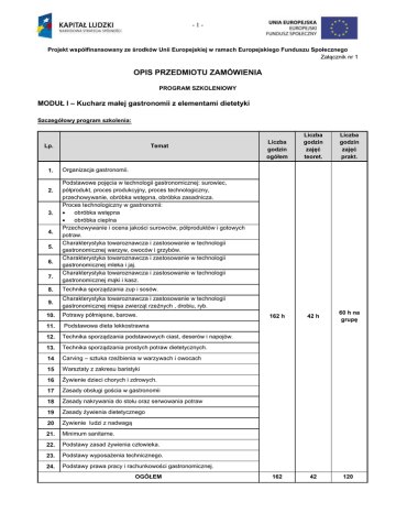 -1- Projekt współfinansowany ze środków Unii Europejskiej w ramach Europejskiego Funduszu Społecznego Załącznik nr 1 OPIS PRZEDMIOTU ZAMÓWIENIA PROGRAM SZKOLENIOWY MODUŁ I – Kucharz małej gastronomii z elementami dietetyki Szczegółowy program szkolenia: Lp. 1. 2. 3. 4. 5. 6. 7. Temat Liczba godzin ogółem Liczba godzin zajęć teoret. Liczba godzin zajęć prakt. 162 h 42 h 60 h na grupę 162 42 120 Organizacja gastronomii. Podstawowe pojęcia w technologii gastronomicznej: surowiec, półprodukt, proces produkcyjny, proces technologiczny, przechowywanie, obróbka wstępna, obróbka zasadnicza. Proces technologiczny w gastronomii: obróbka wstępna obróbka cieplna Przechowywanie i ocena jakości surowców, półproduktów i gotowych potraw. Charakterystyka towaroznawcza i zastosowanie w technologii gastronomicznej warzyw, owoców i grzybów. Charakterystyka towaroznawcza i zastosowanie w technologii gastronomicznej mleka i jaj. Charakterystyka towaroznawcza i zastosowanie w technologii gastronomicznej mąki i kasz. 8. Technika sporządzania zup i sosów. 9. Charakterystyka towaroznawcza i zastosowanie w technologii gastronomicznej mięsa zwierząt rzeźnych , drobiu, ryb. 10. Potrawy półmięsne, barowe. 11. Podstawowa dieta lekkostrawna 12. Technika sporządzania podstawowych ciast, deserów i napojów. 13. Technika sporządzania prostych potraw dietetycznych. 14 Carving – sztuka rzeźbienia w warzywach i owocach 15 Warsztaty z zakresu baristyki 16 Żywienie dzieci chorych i zdrowych. 17 Zasady obsługi gościa w gastronomii 18 Zasady nakrywania do stołu oraz serwowania potraw 19 Zasady żywienia dietetycznego 20 Zywienie ludzi z nadwagą 21. Minimum sanitarne. 22. Podstawy zasad żywienia człowieka. 23. Podstawy wyposażenia technicznego. 24. Podstawy prawa pracy i rachunkowości gastronomicznej. OGÓŁEM -2- Po ukończeniu szkolenia, Wykonawca zobowiązany będzie wydać uczestnikom zaświadczenie na druku, którego wzór określa rozporządzenie Ministra Edukacji Narodowej z dn. 11.01.2012 w sprawie kształcenia ustawicznego w formach pozaszkolnych (Dz. U. poz. 186). Moduł II – Warsztaty aktywnego poszukiwania pracy Plan nauczania określający nazwę zajęć edukacyjnych i ich wymiar: L.p. 1. 2. 3. 4. 5. 6. 7. 8. 9. 10. Temat Bilans umiejętności zawodowych: Stosunek do bezrobocia i pracy – analiza postaw. Analiza SWOT – zasady. Lokalny rynek pracy: Przegląd instytucji związanych z rynkiem pracy oraz omówienie roli, jaką mogą odegrać dla poszukujących. Roboty publiczne oraz prace interwencyjne. Podstawowe przepisy prawne: Ustawa o zatrudnieniu i bezrobociu, Kodeks pracy, Kodeks handlowy, Kodeks administracyjny. Dokumenty – życiorys, podanie: Wypełnienie kwestionariusza osobowego Podanie Życiorys Drogi do pracodawcy: Jak i od kogo można dowiedzieć się o wolnych miejscach pracy. Prasa – jak ją czytać. Budowanie sieci kontaktów. Oferty pracy: Analiza ogłoszeń o pracy. Pisanie ofert. List motywacyjny. Telefonowanie: Telefon – narzędzie komunikacji. Planowanie rozmowy telefonicznej. Symulowanie rozmów telefonicznych Rozmowy: Przygotowanie do rozmowy z pracodawcą (interview). Asertywność. Symulowanie rozmów. Autoprezentacja: Komunikacja niewerbalna (wejście do pokoju, przywitanie, uścisk ręki, postawa przy siedzeniu, wygląd, grzeczność i budzące zaufanie maniery). Komunikacja werbalna (sposób wyrażania się, właściwa odpowiedź na pytania, okazanie zainteresowania pracą). Jak utrzymać pracę: Pierwszy dzień. Zasady utrzymania pracy. Sztuka kompromisu. Liczba godzin ogółem Liczba godzin zajęć teoret. Liczba godzin zajęć prakt. 29 13 16 29 13 16 Konsultacje indywidualne z doradcą zawodowym. OGÓŁEM -3- Moduł III – Nowoczesny sprzedawca z obsługą komputera i kas fiskalnych Szczegółowy program szkolenia: L.p. Temat Liczba godzin zajęć teoret. Liczba godzin zajęć prakt. 84 36 48 84 36 48 Liczba godzin ogółem 1. Działalność handlowa 2. Przedsiębiorstwa handlowe 3. Elementy towaroznawstwa 4. Formy i organizacja sprzedaży 5. Sztuka sprzedawania 6. Ochrona konsumenta 7. Komputerowe wspomaganie pracy w handlu 8. Rachunkowość sklepowa 9. Wybrane zagadnienia z promocji 10. Obsługa kas fiskalnych. 11. Minimum sanitarne 12. Bezpieczeństwo i higiena pracy. OGÓŁEM Po ukończeniu szkolenia, Wykonawca zobowiązany będzie wydać uczestnikom zaświadczenie na druku, którego wzór określa rozporządzenie Ministra Edukacji Narodowej z dn. 11.01.2012 w sprawie kształcenia ustawicznego w formach pozaszkolnych (Dz. U. poz. 186). Moduł IV – Terapia psychologiczna Plan nauczania określający nazwę zajęć edukacyjnych i ich wymiar: Lp. 1. 2. 3. Temat Liczba godzin ogółem Liczba godzin zajęć teoret. Liczba godzin zajęć prakt. 29 14 15 Ogólne wiadomości na temat terapii psychologicznej. Podstawowe rodzaje terapii psychologicznej: - psychoterapia psychoanalityczna, - psychoterapia behawioralno – poznawcza, - psychoterapia humanistyczna, - psychoterapia systemowa. Etapy osiągania zmian w psychoterapii: - etap początkowy psychoterapii. Nawiązanie kontaktu i angażowanie się pacjenta. *(ćwiczenia związane z integracją grupową, nawiązywaniem więzi z innymi osobami) -4- 4. 5. - etap wglądu, namysłu, dążenia do zrozumienia przyczyn własnych problemów. *(ćwiczenia dostosowane do tematu: wymiana doświadczeń związanych z chorobą, problemami osobistymi, traumatycznymi wydarzeniami) - etap przygotowania do zmian zachowania i ćwiczenia nowych zachowań. *(ćwiczenia związane z tematem zajęć: wsparcie uczestników, adekwatne pełnienie ról społecznych, zawodowych) - etap utrwalania i rozszerzania zmian. *ćwiczenia związane ze wzmacnianiem dążenia do samodzielności, indywidualnej aktywności). Psychoterapia jako proces uczenia się rozwiązywania problemów. - przykładowe ćwiczenia Konsultacje indywidualne z psychologiem. OGÓŁEM 29 14 15 Liczba godzin ogółem Liczba godzin 