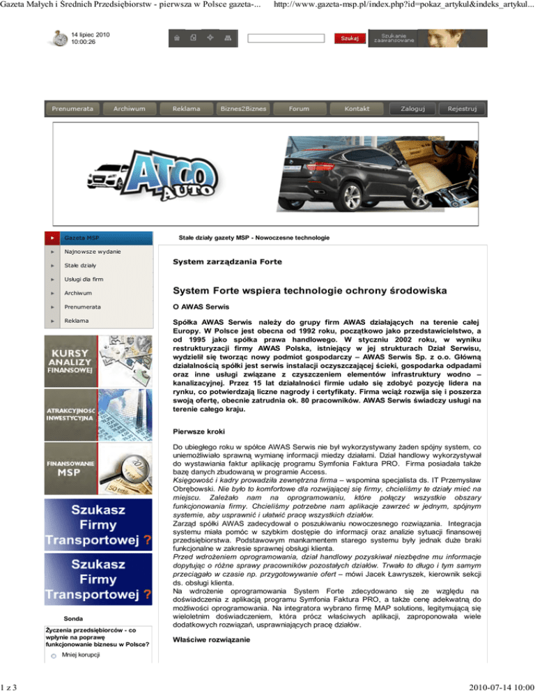 Gazeta Małych i Średnich Przedsiębiorstw - pierwsza w Polsce gazeta-... http://www.gazeta-msp.pl/index.php?id=pokaz_artykul&indeks_artykul... 14 lipiec 2010 10:00:26 Gazeta MSP Stałe działy gazety MSP - Nowoczesne technologie Najnowsze wydanie Stałe działy System zarządzania Forte Usługi dla firm Archiwum System Forte wspiera technologie ochrony środowiska Prenumerata O AWAS Serwis Reklama Spółka AWAS Serwis należy do grupy firm AWAS działających na terenie całej Europy. W Polsce jest obecna od 1992 roku, początkowo jako przedstawicielstwo, a od 1995 jako spółka prawa handlowego. W styczniu 2002 roku, w wyniku restrukturyzacji firmy AWAS Polska, istniejący w jej strukturach Dział Serwisu, wydzielił się tworząc nowy podmiot gospodarczy – AWAS Serwis Sp. z o.o. Główną działalnością spółki jest serwis instalacji oczyszczającej ścieki, gospodarka odpadami oraz inne usługi związane z czyszczeniem elementów infrastruktury wodno – kanalizacyjnej. Przez 15 lat działalności firmie udało się zdobyć pozycję lidera na rynku, co potwierdzają liczne nagrody i certyfikaty. Firma wciąż rozwija się i poszerza swoją ofertę, obecnie zatrudnia ok. 80 pracowników. AWAS Serwis świadczy usługi na terenie całego kraju. Pierwsze kroki Sonda Życzenia przedsiębiorców - co wpłynie na poprawę funkcjonowanie biznesu w Polsce? Do ubiegłego roku w spółce AWAS Serwis nie był wykorzystywany żaden spójny system, co uniemożliwiało sprawną wymianę informacji miedzy działami. Dział handlowy wykorzystywał do wystawiania faktur aplikację programu Symfonia Faktura PRO. Firma posiadała także bazę danych zbudowaną w programie Access. Księgowość i kadry prowadziła zewnętrzna firma – wspomina specjalista ds. IT Przemysław Obrębowski. Nie było to komfortowe dla rozwijającej się firmy, chcieliśmy te działy mieć na miejscu. Zależało nam na oprogramowaniu, które połączy wszystkie obszary funkcjonowania firmy. Chcieliśmy potrzebne nam aplikacje zawrzeć w jednym, spójnym systemie, aby usprawnić i ułatwić pracę wszystkich działów. Zarząd spółki AWAS zadecydował o poszukiwaniu nowoczesnego rozwiązania. Integracja systemu miała pomóc w szybkim dostępie do informacji oraz analizie sytuacji finansowej przedsiębiorstwa. Podstawowym mankamentem starego systemu były jednak duże braki funkcjonalne w zakresie sprawnej obsługi klienta. Przed wdrożeniem oprogramowania, dział handlowy pozyskiwał niezbędne mu informacje dopytując o różne sprawy pracowników pozostałych działów. Trwało to długo i tym samym przeciągało w czasie np. przygotowywanie ofert – mówi Jacek Ławryszek, kierownik sekcji ds. obsługi klienta. Na wdrożenie oprogramowania System Forte zdecydowano się ze względu na doświadczenia z aplikacją programu Symfonia Faktura PRO, a także cenę adekwatną do możliwości oprogramowania. Na integratora wybrano firmę MAP solutions, legitymującą się wieloletnim doświadczeniem, która prócz właściwych aplikacji, zaproponowała wiele dodatkowych rozwiązań, usprawniających pracę działów. Właściwe rozwiązanie Mniej korupcji 1z3 2010-07-14 10:00 Gazeta Małych i Średnich Przedsiębiorstw - pierwsza w Polsce gazeta-... Mniej polityki w biznesie Zmiana systemu podatkowego Zmniejszenie podatków Łatwiejszy dostęp do środków unijnych Łatwiejszy dostęp do kredytów Zmiana ekipy rządzącej Głosuj produkt, usługa Wybierz region http://www.gazeta-msp.pl/index.php?id=pokaz_artykul&indeks_artykul... Dobór właściwego rozwiązania poprzedziła Analiza Przedwdrożeniowa przeprowadzona przez specjalistów ds. wdrożeń i programistów MAP solutions. Podczas wielu spotkań rozpoznano potrzeby klienta oraz specyfikę funkcjonowania firmy. Firma oferująca technologie wspierające ochronę środowiska wymagała wprowadzenia niestandardowych rozwiązań oraz dopasowania systemu do indywidualnych potrzeb. Wspólnie z klientem zadecydowano o wdrożeniu aplikacji System Forte: Handel, Finanse i Księgowość, Środki Trwałe, Kadry i Płace oraz programu Nasz Bank. Dział Rozwiązań Indywidualnych, zaproponował także rozwiązania dodatkowe rozszerzające funkcjonalności programu Handel Forte. Jednym z nich był moduł „Ofertowanie”, który umożliwił rejestrowanie ofert od momentu złożenia zapytania ofertowego, aż do potwierdzenia zamówienia przez klienta. Oferty kierowane do klientów mogą być znakowane statusem: niezrealizowane, w trakcie przygotowania, nieprzyjęte przez klienta. Z modułem “Ofertowanie” powiązano moduł “Umowy”, w którym rejestrowane są wszystkie umowy zawarte z klientem. Handlowcy mają możliwość zapisywania ich w rozróżnieniu na rodzaj umowy i jej rozliczenie. System umożliwia m.in. ręczne tworzenie umów lub ich generowanie na podstawie ofert, porządkowanie i wyszukiwanie danych, wprowadzanie załączników, planowanego terminu wykonania usługi oraz rejestrację dodatkowych informacji. Taka konfiguracja obu modułów znacznie usprawniła pracę sekcji ds. obsługi klienta. Dzięki wprowadzeniu modułu „Harmonogram szczegółowy”, automatycznie generowane jest zestawienie planowanych wizyt na podstawie aktywnych umów z możliwością edycji podczas pracy. Zestawienie za dany okres prezentuje takie dane jak: rodzaj usługi, klient, planowany termin, uwagi. Wizyty są następnie wprowadzane do raportu „Rejestracja protokołów z wizyt”, co ułatwia późniejsze rozliczenie faktur w ramach konkretnej umowy. Moduł generuje faktury sprzedaży na podstawie zaewidencjonowanych protokołów z wizyt zgodnie z kwotami zawartymi w pozycjach umowy oraz materiałów wprowadzonych w protokołach naprawczych. Dokumenty sprzedaży generowane za dany okres trafiają do bufora, a po ich sprawdzeniu możliwe jest ich zbiorcze wystawianie i drukowanie. Po wdrożeniu Systemu Forte Funkcjonalności oprogramowania chwalą pracownicy zajmujący się obsług