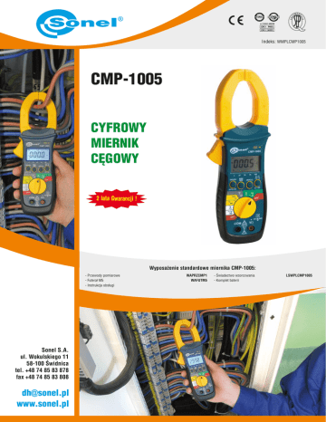 Indeks: WMPLCMP1005 CMP-1005 CYFROWY MIERNIK CĘGOWY 2 lata Gwarancji ! Wyposażenie standardowe miernika CMP-1005: - Przewody pomiarowe - Futerał M5 - Instrukcja obsługi Sonel S.A. ul. Wokulskiego 11 58-100 Świdnica tel. +48 74 85 83 878 fax +48 74 85 83 808 [email protected] www.sonel.pl WAPRZCMP1 WAFUTM5 - Świadectwo wzorcowania - Komplet baterii LSWPLCMP1005 CMP-1005 Pomiar prądu przemiennego (TRUE RMS) i stałego do 1000A. Pomiar początkowego prądu rozruchowego (b. duża częstotliwość próbkowania - funkcja INRUSH). Pomiar prądu stałego i przemiennego (TRUE RMS) Zakres Rozdz. Błąd podstawowy (DC) 0,1A ±(2% w.m. +5 cyfr) Pomiar napięcia stałego i przemiennego (TRUE RMS) do 600V. 0...999,9A Pomiar rezystancji i test ciągłości połączeń: ±(2% w.m. + 5 cyfr) dla f=20...100Hz ±(6% w.m. + 5 cyfr) dla f=100...400Hz - dźwiękowa sygnalizacja ciągłości obwodu (dla wartości mniejszej od 30Ω). Test diod. Błąd podstawowy (AC) współczynnik szczytu < 3 dla 0...500A <2.5 dla 500...600A <1.42 powyżej 600A Pomiar pojemności. Pomiar temperatury. Pomiar częstotliwości. Pomiar napięcia stałego i przemiennego (TRUE RMS) Dodatkowo: Zakres - bezpieczne, izolowane szczęki pomiarowe, - automatyczny wybór zakresów z możliwością przełączania na tryb wyboru ręcznego, - funkcja „DATA HOLD”, umożliwiająca zapamiętanie wyniku na wyświetlaczu, Błąd podstawowy (DC) Rozdz. 0...599,9V ±(1% w.m. +5 cyfr) 0,1V - pomiar wartości szczytowej - funkcja „PEAK”, ±(1% w.m. + 5 cyfr) dla f=20...100Hz ±(6% w.m. + 5 cyfr) dla f=100...400Hz - podświetlany wyświetlacz LCD z bargrafem, - tryb pomiaru względnego - możliwość zerowania przyrządu w dowolnym momencie i powrotu do pomiaru w trybie bezwględnym, Błąd podstawowy (AC) Pomiar pojemności - zapamiętywanie wartości minimalnych i maksymalnych, Zakres Rozdzielczość Dokładność (kondensator warstwowy lub lepszy) - wskazanie przekroczenia zakresu, 0...999μF 0,1μF ±(5% w.m. + 10 cyfr) - auto wyłączanie. Pomiar rezystancji (zabezpieczenie 500V DC lub AC RMS) Czy wiesz, że... Zakres Rozdzielczość Miernik CMP-1005 posiada w wyposażeniu standardowym świadectwo wzorcowania ? 0...999,9Ω 0,1Ω 1000...9999Ω 1Ω Błąd podstawowy ±(1,5% w.m. + 5 cyfr) Pomiar częstotliwości Test diod Błąd podstawowy 0,001V ±(3% w.m. + 3 cyfry) napięcie testu: < 3V prąd testu: 0,2 ± 0,1mA Bezpieczeństwo elektryczne: - kategoria pomiarowa - stopień ochrony obudowy wg PN-EN 60529 Pozostałe dane techniczne: - zasilanie miernika - autowyłączanie po czasie - wyświetlacz - wymiary - masa miernika - częstotliwość próbkowania - polaryzacja - zgodność z wymaganiami norm - standard jakości Rozdzielczość Błąd podstawowy 0,1Hz ±(5% w.m. + 5 cyfr) Zakres Rozdzielczość Błąd podstawowy Zakres Rozdzielczość 20...399,9Hz Czułość: 5V RMS (sygnał TTL) ≥5A (20...100Hz) ≥10A (100...400Hz) Pomiar temperatury III 1000V wg PN-EN 61010-1:2004 IP40 bateria 9V typ 6LR61 10 minut LCD 4 cyfry 246 x 80 x 43 mm ok. 359 g (z baterią) 2x/s oraz 20x/s dla bargrafu automatyczna, wskazanie polaryzacji ujemnej (-) PN-EN 61010-1:2002 PN-EN 61010-2-032 ISO 9001 -40...999,9°C 0,1°C 1000...1200°C 1°C -40...999,9°C 0,1°F 1000...2200°F 1°F ±(0,5% w.m. + 1°C) ±(0,5% w.m. + 2°F) Test ciągłości Zakres Rozdzielczość Błąd podstawowy 0,0...999,9Ω 0,1Ω nie specyfikowany sygnał dźwiękowy dla rezystancji mniejszych od 30Ω Nominalne warunki użytkowania: - maksymalna średnica przewodu - temperatura pracy - temperatura przechowywania - współczynnik temperaturowy Ø34mm lub szyna 60x16mm 0...+50°C, wilg. wzgl. < 70% –20..+60°C, wilg. wzgl. < 80% 10% dokładności/°C (przy temp. <18°C oraz >28°C) Skrót „w.m.” oznacza „wartość mierzoną wzorcową”. v.1