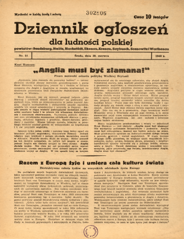 .Wychodzi w każdą Środą i sobotę 302806 Cena 10 tenlgtfw Dziennik ogłoszeń dla ludności polskiej powiatów: Bendsburg, Bielitz, Blacfastädt, Ilkenau.Krenau, Saybusch, Sosnowitz iWarthenau Nr. 51 Środa, dnia 30. czerwca 1943 r. Knut Hamsun: „Anglia Krusi być złamana!" Pisarz norweski oskarża politykę Wielkiej Brytanii „Epidemia, jaka rozeszła się pomiędzy ludźmi“ — takimi słowami określił słynny norweski powieśćioipisarz i poeta Knut Hamsun, występującą jeszcze tu i ówdzie w świecie sympatię dla Anglii i Anglików w mowie, wygłoszonej na środowym posiedzeniu Unii Związków Narodowych Dzien nikarzy w Wiedniu. Knut Hamsun, jak się wyraził, pragnął jedynie „jako Norweg i człowiek złożyć świadectwo“ na podstawie za gadnień dnia, które po zreasumowaniu w jedno nazwał An glią. Anglia zniekształciła i sfałszowała umysły narodów, osłabiła ich zmysł orientacyjny i uczyniła je ślepymi. An glia umiała w ciągu wieków podstępnymi metodami zyskać sobie zaufanie ludzi i to wbrew ich własnemu doświadcze niu i naocznym obserwacjom. Tajemnicą polityki Albion u jest owa zdradziecka mieszanina układnych obietnic i przy musu, obłudnej bigoteria i gwałtów, Secret-Service, prze mocy i mordów. Niema takiego narodu, któryby w prze biegu wieków znalazł powód do wdzięczności za współpracę i t. zw. przyjaźń angielską. Istnieje tylko jeden wielki i potężny kraj, który oparł się truciźnie polityki angielskiej, mianowicie Niemcy. Jednak właśnie jego wielkość i potęga obudziła śmiertelną zawiść w Albionie. Musiało znowu dojść do wojny. Hitler poszedł na tak dalekie ustępstwa, do jakich był wogóle w stanie, jednak Anglia nie chciała ustąpić ze swej strony. Anglia chciała wojny. Nie chce jej zaś prowadzić sama, wprost przeciwnie, swoim zwyczajem chce skłonić innych do pro wadzenia wojny za Anglię. W ten sposób kraj aa krajem wykrwawiał się do ostatniego człowieka, aby służyć Anglii. Ujrzeliśmy znowu, jaką wartość przedstawiają przyrzeczenia i gwarancje angielskie, a równocześnie ujrzeliśmy, że na rody znowu ulegały swojemu staremu nastawieniu wobec Albianu. Angielska polityka w ciągu wieków zdołała do gruntu wykoszlawić zdolność zdrowego sądu narodów. Anglia chciała wojny i Hitler dobył miecza. Hitler pragnął nowej epoki, pragnął wszystkim krajom użyczyć nowego ży cia, pragnął trwałej szczerości wśród narodów dla dobra każdego kraju. Praca jego nie była daremną. Ludy i na rody skupiły się dokoła niego i chcą z nim walczyć i zwy ciężyć. Adolf Hitler daje obecnie światu zupełnie nowy wy gląd. Uda mu się to z pewnością. Jego towarzysz walki Mussolini wraz z Włochami stoi po jego stronie, a to samo stanowisko zajął trzon europejskich mocarstw kontynental nych. Wspólnie wypełniają oni swe zadanie i wówczas wojna będzie skończona. Moim najgłębszym przekonaniem i wiarą — zakończył Knut Hamsun — jest okrzyk: „Anglia musi być ałamana! Nie wystarczy pokonanie bolszewików i jankesów. Anglia musi być zdruzgotana, inaczej nie będzie pokoju na ziemi. Moje przekonanie opieram na doświadczeniach całego świata z powodu praktyk i metod angielskich. W ciągu mojego długiego życia poznałem, że większa część wszystkich nie pokojów, nędzy, ucisku, łamania słowa, przemocy i między narodowych sporów wywodzi się z jednego źródła, miano wicie z Anglii. Nawet dzisiejszą wojnę i wszystkie nie szczęścia, jakie przyniosła ona światu, zawdzięczamy Anglii. Anglia mrusi być złamana!" Razem z Europe iyie i umiera cała kultura świata Destruktywna robota żydów na wszystkich odcinkach życia Europy Na podstawie swych bogatych doświadczeń życiowych, jakie zgromadził podczas czynności swej na różnych naczel nych miejscach europejskich życia gospodarczego, Niderlandczyk Rost van Tonningen w czasie swej mowy, wygło szonej na kongresie dziennikarzy w Wiedniu, był w stanie nakreślić wyrazisty obraz żydowskich usiłowań, zmierzają cych do ujarzmienia narodów. Bez żadnej nieufności wie rząc w szczerość udawanego w Genewie zbratania się naro dów, przyjął Rost van Tonningen w roku 1923 stanowisko komisarza genewskiej ligi z ramienia byłej Austrii. Tu poraź pierwszy poznał destruktywną robotę żydostwa i plutokracji. „Gdzie tylko było okiem spojrzeć", tak powiedział Rost van Tonningen, „wszędzie żerował żyd na ciele Europy. Ci sami żydzi, którzy spowodowali w roku 1924 załamanie się giełdy w Wiedniu, uprawiali w roku 1926 w Paryżu spe kulacje przeciwko walucie franka, a w roku 1931 przeciwko funtowi angielskiemu. W roku 1936 zniszczyli oni ostatnie waluty złote w Europie. Śledziłem w dalszym ciągu ich ślady w bankach prywatnych i emisyjnych w Paryżu, Lon dynie i Amsterdamie, do których miałem łatwy dostęp na podstawie mej działalności w Lidze Narodów. Kiedy system bankowości w Europie środkowej, ten system prowadzony w sposób żydowski uległ załamaniu, wyszła na jaw niesły chana korupcja." Następnie Rost van Tonningen opowie dział swe przeżycia w Genewie, gdzie do komitetu finanso wego Ligi wszedł bankier sowiecki obok wysokiej finansjery amerykańskiej i angielskiej. Już wówczas zauważyć było można zarysowujący się szkic dzisiejszego aliażu wojennego pomiędzy bolszewizmem a plutokracją w Anglii i Ameryce. Wstrząsające były również doświadczenia, jakie zdobył Rost van Tonningen po swym powrocie do Niderlandów. Z naszkicowanych przez siebie doświadczeń wyciągnął Rost van Tonningen następujący wniosek ostateczny: „Oby jak najrychlej znów słońce szczęścia ogrzało europejskie narody, które złączyły się do silnej wspólnoty. Jednoczrńy się, bądźmy wierni i dzielni aż do ostatecznego zwycięstwa; albowiem razem z Europą żyje i umiera cała kultura świata, umiera wszystko, co nam w tym życiu jest drogie i święte.“ 