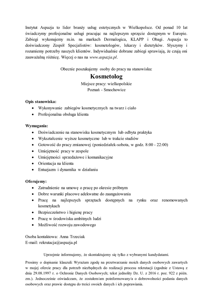 Instytut Aspazja to lider branży usług estetycznych w Wielkopolsce. Od ponad 10 lat świadczymy profesjonalne usługi pracując na najlepszym sprzęcie dostępnym w Europie. Zabiegi wykonujemy m.in. na markach Dermalogica, KLAPP i Obagi. Aspazja to doświadczony Zespół Specjalistów: kosmetologów, lekarzy i dietetyków. Słyszymy i rozumiemy potrzeby naszych klientów. Indywidualnie dobrane zabiegi sprawiają, że czują oni zauważalną różnicę. Więcej o nas na www.aspazja.pl. Obecnie poszukujemy osoby do pracy na stanowisku: Kosmetolog Miejsce pracy: wielkopolskie Poznań - Smochowice Opis stanowiska: Wykonywanie zabiegów kosmetycznych na twarz i ciało Profesjonalna obsługa klienta Wymagania: Doświadczenie na stanowisku kosmetycznym lub odbyta praktyka Wykształcenie wyższe kosmetyczne lub w trakcie studiów Gotowość do pracy zmianowej (poniedziałek-sobota, w godz. 8:00 - 22:00) Umiejętność pracy w zespole Umiejętności sprzedażowe i komunikacyjne Orientacja na klienta Entuzjazm i dynamika w działaniu Oferujemy: Zatrudnienie na umowę o pracę po okresie próbnym Dobre warunki płacowe adekwatne do zaangażowania Pracę na najlepszych sprzętach dostępnych na kosmetykach Bezpieczeństwo i higienę pracy Pracę w środowisku ambitnych ludzi Możliwość rozwoju zawodowego rynku oraz renomowanych Osoba kontaktowa: Anna Trzeciak E-mail: [email protected] Uprzejmie informujemy, że skontaktujemy się tylko z wybranymi kandydatami. Prosimy o dopisanie klauzuli: Wyrażam zgodę na przetwarzanie moich danych osobowych zawartych w mojej ofercie pracy dla potrzeb niezbędnych do realizacji procesu rekrutacji (zgodnie z Ustawą z dnia 29.08.1997 r. o Ochronie Danych Osobowych; tekst jednolity Dz. U. z 2016 r. poz. 922 z późn. zm.). Jednocześnie oświadczam, że zostałem/am poinformowany/a o dobrowolności podania danych osobowych oraz prawie dostępu do treści swoich danych i ich poprawiania.