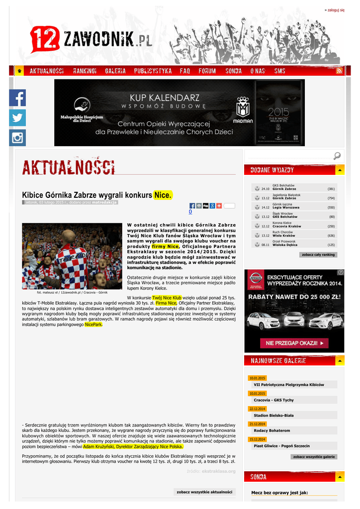 » zaloguj się Kibice Górnika Zabrze wygrali konkurs Nice. 24.10 GKS Bełchatów Górnik Zabrze (381) 13.12 Jagiellonia Białystok Górnik Zabrze (754) 14.12 Górnik Łęczna Legia Warszawa (550) 13.12 Śląsk Wrocław GKS Bełchatów 12.12 Korona Kielce Cracovia Kraków (250) 13.12 Ruch Chorzów Wisła Kraków (636) 08.11 Orzeł Przeworsk Wisłoka Dębica (125) wtorek, 03 lutego 2015 r., dodano przez matredakcja 0 W ostatniej chwili kibice Górnika Zabrze wyprzedzili w klasyfikacji generalnej konkursu Twój Nice Klub fanów Śląska Wrocław i tym samym wygrali dla swojego klubu voucher na produkty firmy Nice, Oficjalnego Partnera Ekstraklasy w sezonie 2014/2015. Dzięki nagrodzie klub będzie mógł zainwestować w infrastrukturę stadionową, a w efekcie poprawić komunikację na stadionie. (80) zobacz cały ranking Ostatecznie drugie miejsce w konkursie zajęli kibice Śląska Wrocław, a trzecie premiowane miejsce padło łupem Korony Kielce. fot. mateusz el / 12zawodnik.pl / Cracovia - Górnik W konkursie Twój Nice Klub wzięło udział ponad 25 tys. kibiców T-Mobile Ekstraklasy. Łączna pula nagród wyniosła 30 tys. zł. Firma Nice, Oficjalny Partner Ekstraklasy, to największy na polskim rynku dostawca inteligentnych zestawów automatyki dla domu i przemysłu. Dzięki wygranym nagrodom kluby będą mogły poprawić infrastrukturę stadionową poprzez inwestycję w systemy automatyki, szlabanów lub bram garażowych. W ramach nagrody pojawi się również możliwość częściowej instalacji systemu parkingowego NicePark. 10.01.2015 VII Patriotyczna Pielgrzymka Kibiców 10.01.2015 Cracovia - GKS Tychy 22.12.2014 Stadion Bielsko-Biała - Serdecznie gratuluję trzem wyróżnionym klubom tak zaangażowanych kibiców. Wierny fan to prawdziwy skarb dla każdego klubu. Jestem przekonany, że wygrane nagrody przyczynią się do poprawy funkcjonowania klubowych obiektów sportowych. W naszej ofercie znajduje się wiele zaawansowanych technologicznie urządzeń, dzięki którym nie tylko możemy poprawić komunikację na stadionie, ale także zapewnić odpowiedni poziom bezpieczeństwa – mówi Adam Krużyński, Dyrektor Zarządzający Nice Polska. Przypominamy, że od początku listopada do końca stycznia kibice klubów Ekstraklasy mogli wesprzeć je w internetowym głosowaniu. Pierwszy klub otrzyma voucher na kwotę 12 tys. zł, drugi 10 tys. zł, a trzeci 8 tys. zł. 21.12.2014 Rodacy Bohaterom 15.12.2014 Piast Gliwice - Pogoń Szczecin zobacz wszystkie galerie źródło: ekstraklasa.org zobacz wszystkie aktualności Mecz bez oprawy jest jak: