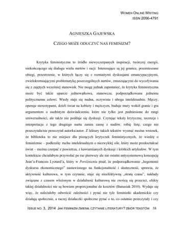 WOMEN ONLINE WRITING ISSN 2056-4791 AGNIESZKA GAJEWSKA CZEGO MOŻE ODUCZYĆ NAS FEMINIZM? Krytyka feministyczna to źródło niewyczerpanych inspiracji, twórczej energii, niekończącego się dialogu wielu nurtów i racji. Interesujące są jej granice, przemieszane obiegi, przestrzenie, w których łączy się z rozmaitymi dyskusjami emancypacyjnymi, zwielokrotniającymi problematykę poszczególnych nurtów, zmuszającymi do wycofywania się z zajętych wcześniej stanowisk. Nie mogę jednak zapomnieć, że krytyka feministyczna może być także uparcie jednowątkowa, stanowcza, podporządkowana jednemu politycznemu celowi. Wtedy staje się nudna, oczywista i uboga intelektualnie. Męczy, operuje stereotypami, dzieli świat na kobiety i mężczyzn, buduje mury wokół granic i gra argumentem o osobistym doświadczeniu, które nie tylko jest podniesione do rangi uniwersalności, ale także nie poddaje się dyskusji. Czytając teksty krytyczne, recenzje i interpretacje z tego drugiego nurtu zanim zasnę z nudów, robię listę, czego nie przeczytała/nie przeczytał autorka/autor. Z lektury takich tekstów wysnuć można wniosek, że biblioteka to nie miejsce dla piszących krytyczek feministycznych, że wiedzę o feminizmie – podkreślę: ruchu intelektualnym o niezwykłej sile, który może przekształcać świat – można czerpać z powietrza, z kawiarnianych dyskusji i krótkich artykułów. W tym kontekście chciałabym przywołać po raz pierwszy ale nie ostatni antysystemową koncepcję Jean’a-Francois Lyotard’a, który w Poróżnieniu pisał, że podporządkowanie „hegemonii dyskursu ekonomicznego” nastawionego na funkcjonalność i skuteczność, sprawia, że aktywność kulturowa, w tym czytanie, staje się nieefektywną „stratą czasu”, nakłady związane z czasem włożonym w działalność kulturową nie zwrócą się przecież, efekty takiej działalności nie są bowiem proporcjonalne do kosztów (Banasiak 2010). Wydaje się więc, że należałoby odwrócić zależności i pytać nie tyle feministki akademickie czy działają społecznie, a raczej działaczki społeczne pytać o to, co ostatnio przeczytały i czy ISSUE NO. 3, 2014 JAK FEMINIZM ZMIENIŁ CZYTANIE LITERATURY? ZBIÓR TEKSTÓW 58 WOMEN ONLINE WRITING ISSN 2056-4791 na pewno stosowane przez nas narzędzia nie wspierają imperializmu i terroru systemu globalnego. Droga do sprawiedliwości społecznej jest kręta, pełna pułapek i wymaga rzetelności oraz sumienności. Proste tezy nie służą poprawie czyjegokolwiek losu, nie zmieniają świata, szybko zostają wykorzystane, użyte przez główny nurt, który uwielbia uproszczenia. Debata o literaturze i filozofii zbudowana na takich samych zasadach, jak debata polityczna czy publicystyczna nie zmienia świata, nie zmusza badaczek i badaczy do przemyślenia własnych racji. A przecież nie chodzi nam o okopywanie własnych pozycji. Krytycznoliteracki agon, rozumiany jako dialog antagonistów, stawia piszących w opozycji do utworu literackiego, monografii, eseju. Tekst staje się przeciwnikiem, na którego porażce można zbudować swój narcystyczny wizerunek, pielęgnować go i utwierdzać się w przekonaniu o własnej wartości. Chciałabym zwrócić uwagę na ten falliczny, onanistyczny charakter wypowiedzi krytycznej i pokazać, że ten tryb lektury jest sprzeczny z dążeniami emancypacyjnymi. Julia Fiedorczuk w Białej Ofelii przedstawia wieczór autorski jednej z protagonistek – pisarki Elizy Adler, opowiedziany z perspektywy przyjaciółki z dzieciństwa, która korzysta z wizyty promującej nową książkę Elizy w Warszawie do odnowienia znajomości. Spotkanie z autorką Anna przedstawia jako pasmo udręk: „To może ja zacznę – odezwała się w końcu młoda kobieta z dredami. – Pytam, bo mnie to niepokoi z feministycznego punktu widzenia, dlaczego narratorem jest u pani mężczyzna?”. Anna sięgnęła po torebkę, wyjęła z niej szalik i owinęła go sobie wokół szyi. „Skoro już kobiety wywalczyły sobie prawo…”. Anna pomyślała: „Kobiety. Kobieta to ja”. „Jakiś krok wstecz?”. Eliza odchrząknęła, poprawiła włosy i zaczęła odpowiadać: „Nie widzę związku…”. Anna splotła palce, położyła dłonie na kolanach… „To jest opowiadanie o miłości”. „No właśnie! – przerwała Elizie dziewczyna. – Dlaczego ta miłość jest u pani taka heteronormatywna? Dlaczego przedstawia pani kobietę jako ofiarę?”. Anna rozplotła dłonie, sięgnęła po torebkę. Eliza powiedziała, bardzo spokojnie: „Nie ISSUE NO. 3, 2014 JAK FEMINIZM ZMIENIŁ CZYTANIE LITERATURY? ZBIÓR TEKSTÓW 59 WOMEN ONLINE WRITING ISSN 2056-4791 heteronormatywna, tylko heteroseksualna, co w tej sytuacji podyktowane jest płcią obydwojga kochanków… Poza tym nie można powiedzieć, że Ramona jest ofiarą…”. „Przepraszam, że się wtrącę – odezwał się facet – ale nie ma chyba obowiązku, żeby każda książka była feministyczna?”. „Niezupełnie się z panem zgadzam – podjęła wątek Eliza. – Nie można tak po prostu wyrzec się feminizmu. To jest…”. Anna zaczęła kiwać się lekko, w przód i w tył, na swoim strasznym krześle” (Fiedorczuk 2011: 115). Ten opis tortur to najprawdopodobniej ironiczny komentarz do recepcji towarzyszącej ukazaniu się wcześniejszego zbioru Fiedorczuk Poranek Marii i inne opowiadania, w którym przedstawiła przemoc seksualną wobec kobiet, nie uwzględniła w nim natomiast związków między kobietami. Przyjrzyjmy się jednak temu, o co pyta uczestniczka spotkania autorskiego, by zrozumieć na jakiego typu krytykę feministyczną jest to satyra. Kobieta jako podmiot to postulat dyskutantki „z dredami”, która domaga się uobecnienia feminizmu na poziomie fabularnym. Domaga się też, by w powieści o miłości znalazł się wątek dotyczący pożądania kobiety przez kobietę, gdyż pytająca uważa, że w ten sposób można przeciwstawić się 