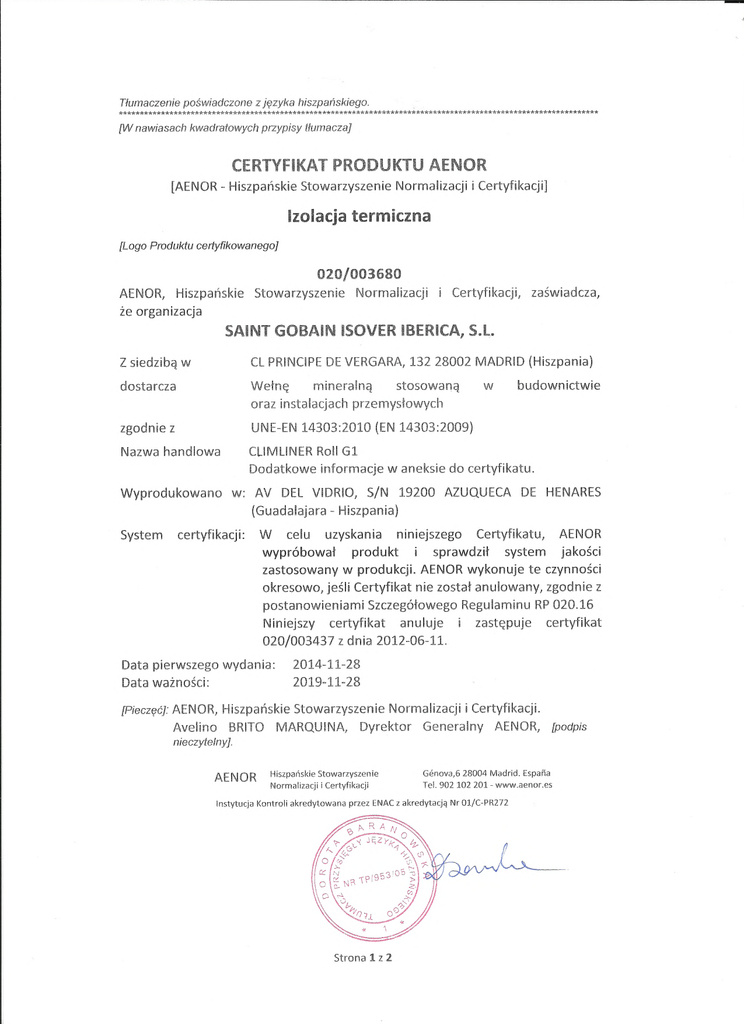 Tłumaczenie poświadczone z języka hiszpańskiego. ***************************************************************************************************************** [W nawiasach kwadratowych przypisy tłumacza] CERTYFIKAT PRODUKTU AENOR [AENOR - Hiszpańskie Stowarzyszenie Normalizacji i Certyfikacji] Izolacja termiczna [Logo Produktu certyfikowanego] 0 20 /00 36 80 AENOR, Hiszpańskie Stowarzyszenie Normalizacji i Certyfikacji, zaświadcza, że organizacja SAINT GOBAtN SSOVER IBERICA, S.L. Z siedzibą w CL PRINCIPE DE VERGARA, 132 28002 MADRID (Hiszpania) dostarcza Wełnę mineralną stosowaną oraz instalacjach przemysłowych zgodnie z UNE-EN 14303:2010 (EN 14303:2009) Nazwa handlowa CUMLINER Roli G1 Dodatkowe informacje w aneksie do certyfikatu. w budownictwie Wyprodukowano w: AV DEL VIDRIO, S/N 19200 AZUQUECA DE HENARES (Guadalajara - Hiszpania) System certyfikacji: W celu uzyskania niniejszego Certyfikatu, AENOR wypróbował produkt i sprawdził system jakości zastosowany w produkcji. AENOR wykonuje te czynności okresowo, jeśli Certyfikat nie został anulowany, zgodnie z postanowieniami Szczegółowego Regulaminu RP 020.16 Niniejszy certyfikat anuluje i zastępuje certyfikat 020/003437 z dnia 2012-06-11. Data pierwszego wydania: Data ważności; [Pieczęć]: 2014-11-28 2019-11-28 AENOR, Hiszpańskie Stowarzyszenie Normalizacji i Certyfikacji. Aveiino BRITO MARQUINA, Dyrektor Generalny AENOR, [podpis nieczytelny]. AENOR ™ ' Hiszpańskie Stowarzyszenie Normalizacji i Certyfikacji Genova,6 28004 Madrid. España Tel. 902 102 201 - www.aenor.es Instytucja Kontroli akredytowana przez ENAC z akredytacją Nr 01/C-PR272 Strona 1 z 2 CERTYFIKAT PRODUKTU AENOR [AENOR - Hiszpańskie Stowarzyszenie Normalizacji i Certyfikacji] Izolacja termiczna [Logo Produktu certyfikowanego] 020 /00 36 80 AIMEKS DO CERTYFIKATU Zakres grubości /mm/: 15-100 Powłoka Strony A [zewnętrzna]: Czarna tkanina z włókna szklanego Reakcja na ogień dla produktów wypuszczonych na rynek / strona A/: Powłoka Strona B [wewnętrzna]: Reakcja na ogień dla produktów wypuszczonych na rynek / strona B/: Kod opisujący: Średnia temperatura (°C) / Przewodność cieplna (W/mK): A 2 -sl, dO BEZ POWŁOKI A 2 -sl, dO MW-EN 14303-T2 10/0,032 20/0,034 40/0,037 60/0,040 A EN D R , Hiszpańskie Stowarzyszenie Normalizacji i Certyfikacji Data pierwszego wydania: Data ważności: AENOR 2014-11-28 2019-11-28 Hiszpańskie Stowarzyszenie Normalizacji i Certyfikacji Genova,6 28004 Madrid. España Tei. 902 102 201 - www.aenor.es Instytucja Kontroli akredytowana przez ENAC z akredytacją Nr 01/C-PR272 Ja, mgr Dorota Baranowska, Tłumacz Przysięgły języka hiszpańskiego i francuskiego, wpisana na listę Tłumaczy Pnysięgłych Ministra Sprawiedliwości Rzeczpospolitej Polskiej pod nr TP/953/05, oświadczam zgodność niniejszego tłumaczenia z przedstawionym mi oryginałem dokumentu. Rzeszów, dnia 16.11.2016 r. Nr Rep.: 16/11/119 Strona 2 z 2