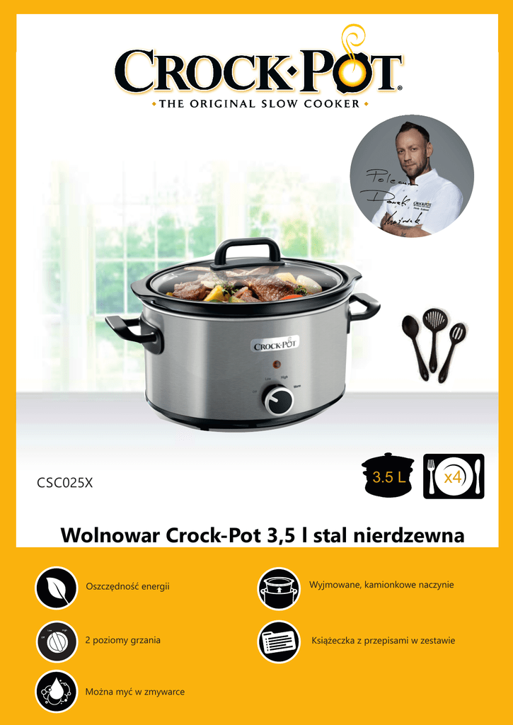 CSC025X 3.5 L x4 Wolnowar Crock-Pot 3,5 l stal nierdzewna Oszczędność energii Wyjmowane, kamionkowe naczynie 2 poziomy grzania Książeczka z przepisami w zestawie Można myć w zmywarce Wolnowar Crock-Pot 3,5 l stal nierdzewna CSC025X Odkryj smak wolnego gotowania W wolnowarze Crock-Pot® 3,5 l składniki gotowane są wolno przez kilka godzin, bez potrzeby nadzoru. Wolnowar manualny 3,5 l znajdzie zastosowanie w każdej kuchni. Doskonały do gotowania, pieczenia i duszenia. Pojemność 3,5 l jest idealna dla 4 osób. Prócz dwóch możliwości ustawienia temperatury model ten został wyposażony w manualną funkcję podtrzymywania ciepła. Dodatkowo do zestawu dodano trzy łyżki do gotowania i serwowania potraw, co ułatwi pracę z wolnowarem. Specyfikacja Pojemność 3,5 l Ilość osób/porcji 4 Poziomy temperatury 2 (LOW i HIGH) Funkcja podgrzewania Manualna Moc Jaki naprawdę jest Crock-Pot? Praktyczny Dodaj składniki, wybierz poziom temperatury (LOW lub HIGH) i stwórz wyśmienite posiłki, które smakują tak, jakbyś poświęcił na ich przygotowanie cały dzień. Zdrowy i pyszny Slow cooking jest pyszny, zdrowy i aromatyczny. Wolne gotowanie pozwala na zachowanie większej ilości substancji odżywczych znajdujących się w potrawie. Przygotowywane w wolnowarze posiłki są bardziej soczyste, pożywne i zdrowe, gdyż temperatura ich gotowania czy duszenia nie przekracza 100˚C. Mięso nie przywiera do naczynia i nie kurczy się. Oszczędny Wolonowary Crock-Pot® oszczędzają do 75% energii elektrycznej w porównaniu z tradycyjnymi kuchenkami*. Dzięki Crock-Pot® zredukujesz ilość tłuszczu w mięsie, czyniąc je smaczniejszym i doskonale przyrządzonym. Ponadto wolne gotowanie wydobywa smak z każdego rodzaju mięsa. * Porównanie wolnowaru Crock-Pot® 220W włączonego przez 8h do tradycyjnego piekarnika 2200 W - 140oC, 2h 15 min gotowania wołowiny w naczyniu żaroodpornym. poziom LOW 160 W, poziom HIGH 210 W, podgrzewanie 50 W Napięcie 220-230 V Waga urządzenia 4,2 kg Wymiary urządzenia 360 mm x 240 mm x 245 mm (dł. x gł. x wys.) Kod EAN 5011773058179 Waga opakowania 4,7 kg Wymiar opakowania 325 mm x 245 mm x 325 mm (dł. x gł. x wys.) W opakowaniu Naczynie kamionkowe przystosowane do mycia w zmywarce, możliwość używania w piekarniku Podstawa z elementem grzewczym z przewodem zasilającym Pokrywka szklana przystosowana do mycia w zmywarce Zestaw 3 łyżek: 1 uniwersalna, 2 cedzakowe Instrukcja w języku polskim Książeczka z przepisami 2 lata gwarancji /CrockPotPl