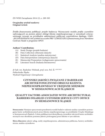ZN WSH Zarządzanie 2014 (2), s. 289-305 Oryginalny artykuł naukowy Original Article Źródła finansowania publikacji: projekt badawczy Wyznaczanie modelu profilu czynników wpływających na poziom jakości obsługi klienta niepełnosprawnego w warunkach zrównoważonego rozwoju na przykładzie administracji publicznej województwa śląskiego, UMO-2012/05/B/HS4/01144 (symbol na uczelni PBU-12/ROZ3/2013) finansowany przez Narodowe Centrum Nauki w programie OPUS Authors’ Contribution: (A) Study Design (projekt badania) (B) Data Collection (zbieranie danych) (C) Statistical Analysis (analiza statystyczna) (D) Data Interpretation (interpretacja danych) (E) Manuscript Preparation (redagowanie opracowania) (F) Literature Search (badania literaturowe) dr hab. inż. Radosław Wolniak, prof. nzw. Pol. Śl. A B C D E F Politechnika Śląska Wydział Organizacji i Zarządzania CZYNNIKI JAKOŚCI ZWIĄZANE Z BARIERAMI ARCHITEKTONICZNYMI OBSŁUGI KLIENTA NIEPEŁNOSPRAWNEGO W URZĘDZIE MIEJSKIM W SIEMIANOWICACH ŚLĄSKICH QUALITY FACTORS ASSOCIATED WITH ARCHITECTURAL BARRIERS DISABLED CUSTOMER SERVICE CITY OFFICE IN SIEMIANOWICE ŚLĄSKIE Streszczenie: Niniejsze opracowanie przedstawia wyniki badań w zakresie analizy czynników postrzegania barier architektonicznych przez klienta niepełnosprawnego na przykładzie Urzędu Miejskiego w Siemianowicach Śląskich. Celem publikacji jest identyfikacja czynników ukrytych barier architektonicznych oraz określenie poziomu jakości postrzeganej przez klienta w tym zakresie. Słowa kluczowe: jakość usług, osoby niepełnosprawne, administracja publiczna, bariery architektoniczne, analiza czynnikowa 290 Zeszyty Naukowe Wyższej Szkoły Humanitas. Zarządzanie Summary: This study presents the results of research using the factors analysis about that perception of architectural barriers for disabled client on the example of the City Council in Siemianowice. The publication aims to identify the hidden factors of architectural barriers and the level of quality perceived by the customer in this regard. Key words: quality of services, people with disabilities, public administration, architectural barriers, factor analysis Wprowadzenie Kwestie barier architektonicznych są bardzo istotne dla osób niepełnosprawnych. W wielu przypadkach istnienie takich barier utrudnia lub wręcz uniemożliwia im korzystanie z usług publicznych. W niniejszym opracowaniu dokonano analizy czynników związanych z barierami architektonicznymi i ich postrzeganiem1, stosując elementy metody Servqual2. Przy czym pamiętać należy, że usługi publiczne, a zwłaszcza te realizowane w odniesieniu do osób niepełnosprawnych3, mają swą specyfikę4 i nie zawsze można w tym przypadku zastosować wprost opisane w literaturze narzędzia. Często trzeba je zmodyfikować, aby możliwe było ich wykorzystanie do tak specyficznych problemów. Celem opracowania jest identyfikacja czynników postrzegania jakości w odniesieniu do barier architektonicznych przez klientów niepełnosprawnych na przykładzie Siemianowic Śląskich oraz pomiar poziomu jakości postrzeganej w tym zakresie. Czynniki ukryte rozumiane są w publikacji w sposób techniczny, wynikający z istoty analizy czynnikowej, to znaczy, jako zagregowane grupy zmiennych dotyczące podobnych kwestii. Termin ten należy rozumieć jako czynnik oceny występowania danej bariery architektonicznej w badanym urzędzie przez klienta niepełnosprawnego. W analizie, wychodząc z koncepcji Servqual, bada się jakość postrzeganą przez klienta. Przedstawione analizy zostały wykonane w trakcie realizacji projektu badawczego Wyznaczenie modelu profilu czynników wpływających na poziom jakości obsługi klienta niepełno R. Wolniak, B. Skotnicka-Zasadzień, Wybrane metody badania satysfakcji klienta i oceny dostawców w organizacjach, Wydawnictwo Naukowe Politechniki Śląskiej, Gliwice 2008; R. Wolniak, B. Skotnicka-Zasadzień, E-administracja – czynniki funkcjonowania dobrego e-urzedu, „Zeszyty Naukowe Politechniki Śląskiej” 2012, z. 63. 2 Omówienie metod znajduje się miedzy innymi w: E. Krzemień, R. Wolniak, Zarządzanie jakością w sektorze usług finansowych, Wyższa Szkoła Bankowości i Finansów, Bielsko-Biała 2004; A. Parasuraman, V.A. Zeithaml, L.L. Berry, SERVQUAL: A Multiple-item Scale for Measuring Consumer Perceptions of ServiceQuality, “Journal of Retailing” 1988, Vol. 64, No. 1; S. Sahney, D.K. Banwet, S. Karunes, A Servqual and QFD approach to total quality education, “International Journal of productivity and Performance Management” 2004, Vol 53, No 2; E. Babakus and G.W. Boller, An empirical assessment of the SERVQUAL scale, “Journal of Business Research” 1998, Vol. 24; R. Wolniak, B. Skotnicka-Zasadzień, The concept of study of Servqual method’s gaps, “Quality and Quantity” 2012, nr 4, vol 46, p. 1239-1247. 3 P. Śleszyński, Niepełnosprawność w Polsce w świetle wyników ostatniego spisu powszechnego, „Polityka Społeczna” 2006, nr 9, s. 23-27; K. Racoń-Leja, Bariery w kształtowaniu przestrzeni publicznej w zespołach mieszkaniowych, „Architektura” 2010, nr , s. 165-170. 4 Por. R. Wolniak, B. Skotnicka-Zasadzień, Wykorzystanie metody Servqual do badania jakości usług w administracji samorządowej, Wydawnictwo Politechniki Śląskiej, Gliwice 2009; M. Bugdol, Zarządzanie jakością w urzędach administracji publicznej – teoria i praktyka, Difin, Warszawa 2008; R. Wolniak, B. Skotnicka-Zasadzień, Ocena czynników jakości usług w administracji samorządowej, „Marketing i Rynek” 2010,nr 6, s. 32-36; J. Łuczak, R. Wolniak, Ocena skuteczności zastosowania metody CAF w procesie doskonalenia administracji samorządowej, “Zeszyty Naukowe Politechniki Śląskiej. Seria Organizacja i Zarzadzanie” 2013, z. 67, s. 7-18; A. Tomaszewicz, Poziom jakości obsługi klientów w zakresie e-administracji, „Zeszyty Naukowe Uniwersytetu Szczecińskiego. Ekonomiczne Problem