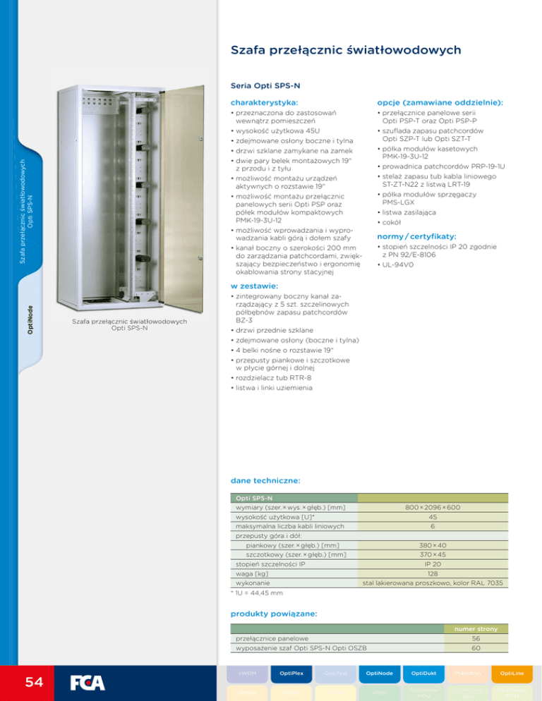 Szafa przełącznic światłowodowych OptiNode OptiNode Szafa przełącznic światłowodowych Opti SPS-N Seria Opti SPS-N charakterystyka: opcje (zamawiane oddzielnie): • przeznaczona do zastosowań wewnątrz pomieszczeń • wysokość użytkowa 45U • zdejmowane osłony boczne i tylna • drzwi szklane zamykane na zamek • dwie pary belek montażowych 19" z przodu i z tyłu • możliwość montażu urządzeń aktywnych o rozstawie 19" • możliwość montażu przełącznic panelowych serii Opti PSP oraz półek modułów kompaktowych PMK-19-3U-12 • przełącznice panelowe serii Opti PSP-T oraz Opti PSP-P • szuflada zapasu patchcordów Opti SZP-T lub Opti SZT-T • półka modułów kasetowych PMK-19-3U-12 • prowadnica patchcordów PRP-19-1U • stelaż zapasu tub kabla liniowego ST-ZT-N22 z listwą LRT-19 • półka modułów sprzęgaczy PMS-LGX • listwa zasilająca • cokół • możliwość wprowadzania i wyprowadzania kabli górą i dołem szafy • kanał boczny o szerokości 200 mm do zarządzania patchcordami, zwiększający bezpieczeństwo i ergonomię okablowania strony stacyjnej normy / certyfikaty: • stopień szczelności IP 20 zgodnie z PN 92/E-8106 • UL-94V0 w zestawie: Szafa przełącznic światłowodowych Opti SPS-N • zintegrowany boczny kanał zarządzający z 5 szt. szczelinowych półbębnów zapasu patchcordów BZ-3 • drzwi przednie szklane • zdejmowane osłony (boczne i tylna) • 4 belki nośne o rozstawie 19" • przepusty piankowe i szczotkowe w płycie górnej i dolnej • rozdzielacz tub RTR-8 • listwa i linki uziemienia dane techniczne: Opti SPS-N wymiary (szer. × wys. × głęb.) [mm] 800 × 2096 × 600 wysokość użytkowa [U]* 45 maksymalna liczba kabli liniowych 6 przepusty góra i dół: piankowy (szer. × głęb.) [mm] 380 × 40 szczotkowy (szer. × głęb.) [mm] 370 × 45 stopień szczelności IP IP 20 waga [kg] 128 wykonanie stal lakierowana proszkowo, kolor RAL 7035 * 1U = 44,45 mm produkty powiązane: numer strony 54 przełącznice panelowe 56 wyposażenie szaf Opti SPS-N Opti OSZB 60 xWDM OptiPlex OptiTest OptiNode OptiDukt MikroKan OptiLine OPGW FibAir FTTA xPON OptiHome MDU OptiHome SDU OptiHome FITH