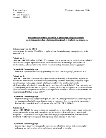 Teatr Narodowy Pl. Teatralny 3 00 – 077 Warszawa Nr sprawy: 24/2014 Warszawa, 30 czerwca 2014r. Do zainteresowanych udziałem w przetargu nieograniczonym na świadczenie usług telekomunikacyjnych w telefonii stacjonarnej. Dotyczy: zapytań do SIWZ Informujemy, że w dniu 26.06.2014 r. wpłynęły do Zamawiającego następujące pytania do treści SIWZ: Pytanie nr 1: „[pkt. 14.2 SIWZ] Zgodnie z SIWZ, Wykonawca zobowiązany jest do poniesienia wszelkich kosztów związanych z przeniesieniem numerów od dotychczasowego operatora i ich uruchomienia. Jaki operator w tej chwili świadczy usługi na rzecz Zamawiającego?” Odpowiedź Zamawiającego: Obecnym operatorem świadczącym usługi na rzecz Zamawiającego jest LoVo S.A. Pytanie nr 2: „[pkt. 14.11 SIWZ] Czy Zamawiający przez wykonanie usługi polegającej na wykonaniu przedmiotu zamówienia rozumie świadczenie usługi telefonii publicznej w sposób ciągły umożliwiający realizację połączeń lokalnych, strefowych, międzystrefowych, międzynarodowych, do sieci komórkowych i satelitarnych oraz infolinii? Czy znaczenie ma, czy usługa ta była świadczona w oparciu o łącza cyfrowe czy analogowe? Czy znaczenie ma, czy świadczenie usług telekomunikacyjnych było realizowane za pomocą dostępu ISDN PRI z sygnalizacją DSS1, z usługą DDI?” Odpowiedź Zamawiającego: Wykonawca zgodnie z zapisami w pkt. 14.11 SIWZ ma zagwarantować Zamawiającemu świadczenie usług telekomunikacyjnych na wymienionych w ww. punkcie warunkach. Zamawiający oczekuje dwóch aktywnych łączy ISDN PRA 30 B+D. Pytanie nr 3: „[pkt. 14.21 S1WZ) Co zamawiający ma na myśli „że w przypadku ustawowego obniżenia cen za połączenia, opłaty naliczane nie mogą być wyższe niż wynikające z aktualnych przepisów”? Wykonawca składając ofertę kalkuluje ją na podstawie cen jednostkowych zawartych w ofercie w związku z tym zapis nie może znaleźć w umowie.” Odpowiedź Zamawiającego: Zamawiający żąda by w przypadku ustawowego obniżenia cen za połączenia, opłaty naliczane nie były wyższe niż wynikające z aktualnych przepisów. Pytanie nr 4: „[pkt. 14.22 SIWZ] Czy Zamawiający dopuszcza możliwość liczenia terminu zapłaty od dnia wystawienia faktury?” Odpowiedź Zamawiającego: Zamawiający nie dopuszcza takiej możliwości. Pytanie nr 5: „[pkt. 14.34 SIWZ] Czy zamawiający doprecyzuje formę zapisu z uwagi na fakt że obecne brzmienie jest niejednoznaczne a skutki odstąpienia od umowy dla Wykonawcy mają duże znaczenie z uwagi na koszt jakie ponosi Wykonawca w związku z przygotowaniem usługi dla Zamawiającego?” Odpowiedź Zamawiającego: Zamawiający nie doprecyzuje formy zapisu w pkt. 14.34 SIWZ. Pytanie nr 6: „[pkt.14. Istotne Postanowienia Umowy] Czy Zamawiający dopuszcza zastrzeżenie wspomnianej kary umownej na wypadek odstąpienia od umowy przez Zamawiającego z winy Wykonawcy, a nie z przyczyn leżących po stronie Wykonawcy?” Odpowiedź Zamawiającego: Zamawiający nie akceptuje proponowanej zmiany. Pytanie nr 7: „[pkt. 14. Istotne Postanowienia Umowy] Czy Zamawiający dopuszcza ograniczenie całkowitej odpowiedzialności Wykonawcy (w tym ponad kary umowne) do wartości brutto umowy?” Odpowiedź Zamawiającego: Zamawiający nie akceptuje proponowanej zmiany. Pytanie nr 8: „[pkt.14. Istotne Postanowienia Umowy] Czy Zamawiający dopuszcza możliwość rozwiązania Umowy przez Wykonawcę w przypadku naruszenia przez Zamawiającego postanowień umowy lub przepisów prawa, w szczególności w razie nieterminowego regulowania opłat przez Zamawiającego?” Odpowiedź Zamawiającego: Zamawiający nie akceptuje proponowanej zmiany. Pytanie nr 9: „[pkt.14. Istotne Postanowienia Umowy] Czy Zamawiający dopuszcza poddanie sporów wynikających z umowy sądom właściwości ogólnej??” Odpowiedź Zamawiającego: Wszelkie spory, mogące wyniknąć przy realizacji Umowy, Strony zobowiązują się rozwiązać w drodze polubownej, a w przypadku braku porozumienia Sądem do ich rozstrzygnięcia będzie Sąd właściwy ze względu na siedzibę Teatru. Pytanie nr 10: „[pkt. 14. Istotne Postanowienia Umowy] Czy Zamawiający dopuszcza rozszerzenie postanowień Umowy o inne postanowienia wymagane na mocy art, 56 ust. 3 ustawy z dnia 16 lipca 2004 r. Prawo telekomunikacyjne (Dz.U. Nr 171, poz. 1800 ze zm.; „PT”)? Naruszenie art. 56 ust. 3 PT może skutkować wymierzeniem Wykonawcy kary pieniężnej (art. 209 ust. 1 pkt 13b) PT). Ponadto, czy Zamawiający przewiduje wprost w umowie odwołanie do właściwego regulaminu świadczenia usług telekomunikacyjnych, który miałby zastosowanie w odniesieniu do świadczonej usługi oraz cennika obejmującego plan taryfowy, według którego rozliczane będą inne usługi niż te, których ceny wskazano w ofercie?” Odpowiedź Zamawiającego: W pkt 14. SIWZ Zamawiający uwzględnił postanowienia zawarte w art, 56 ust. 3 ustawy z dnia 16 lipca 2004 r. Prawo telekomunikacyjne (Dz.U. Nr 171, poz. 1800 ze zm.; „PT”) Zamawiający w pkt 14.12. SIWZ żąda: „Usługi będą świadczone na zasadach określonych w umowie i „Regulaminie świadczenia Usług” operatora, w zakresie tych zapisów Regulaminu, które nie są sprzeczne z zapisami umowy oraz prawem telekomunikacyjnym. „Regulamin świadczenia usług” jest załącznikiem nr 2 do umowy i stanowi jej integralną część.” Zamawiający w pkt 14.20. SIWZ żąda: „Z tytułu realizacji przedmiotu Umowy, Wykonawca będzie otrzymywał wynagrodzenie za świadczenie usług telekomunikacyjnych zrealizowanych w danym okresie rozliczeniowym, obliczone na podstawie cen jednostkowych określonych w złożonej przez Wykonawcę ofercie.” Pytanie nr 11: „Jaki typ centrali telefonicznej posiada Zamawiający? Czy centrala posiada możliwość automatycznego przełączenia się z uszkodzonego łącza na pracujące?” Odpowiedź Zamawiającego: Zamawiający posiada centrale telefoniczną Alcatel OmniPCX Enterpri