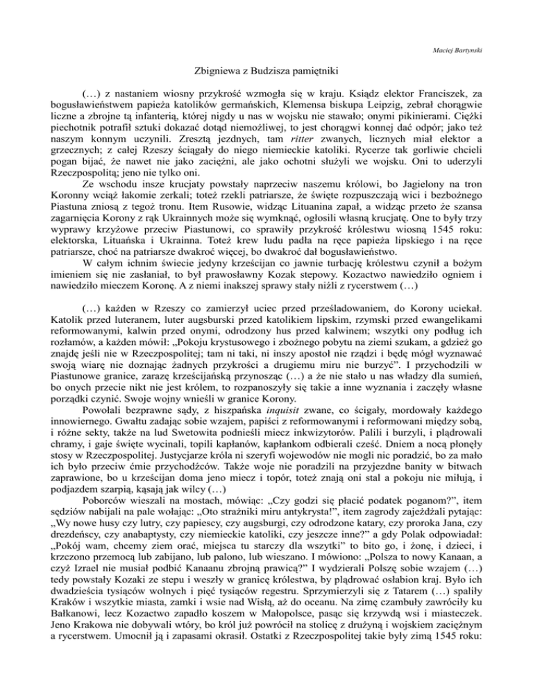 Maciej Bartynski Zbigniewa z Budzisza pamiętniki (…) z nastaniem wiosny przykrość wzmogła się w kraju. Ksiądz elektor Franciszek, za bogusławieństwem papieża katolików germańskich, Klemensa biskupa Leipzig, zebrał chorągwie liczne a zbrojne tą infanterią, której nigdy u nas w wojsku nie stawało; onymi pikinierami. Ciężki piechotnik potrafił sztuki dokazać dotąd niemożliwej, to jest chorągwi konnej dać odpór; jako też naszym konnym uczynili. Zresztą jezdnych, tam ritter zwanych, licznych miał elektor a grzecznych; z całej Rzeszy ściągały do niego niemieckie katoliki. Rycerze tak gorliwie chcieli pogan bijać, że nawet nie jako zaciężni, ale jako ochotni służyli we wojsku. Oni to uderzyli Rzeczpospolitą; jeno nie tylko oni. Ze wschodu insze krucjaty powstały naprzeciw naszemu królowi, bo Jagielony na tron Koronny wciąż łakomie zerkali; toteż rzekli patriarsze, że święte rozpuszczają wici i bezbożnego Piastuna zniosą z tegoż tronu. Item Rusowie, widząc Lituanina zapał, a widząc przeto że szansa zagarnięcia Korony z rąk Ukrainnych może się wymknąć, ogłosili własną krucjatę. One to były trzy wyprawy krzyżowe przeciw Piastunowi, co sprawiły przykrość królestwu wiosną 1545 roku: elektorska, Lituańska i Ukrainna. Toteż krew ludu padła na ręce papieża lipskiego i na ręce patriarsze, choć na patriarsze dwakroć więcej, bo dwakroć dał bogusławieństwo. W całym ichnim świecie jedyny krześcijan co jawnie turbację królestwu czynił a bożym imieniem się nie zasłaniał, to był prawosławny Kozak stepowy. Kozactwo nawiedziło ogniem i nawiedziło mieczem Koronę. A z niemi inakszej sprawy stały niźli z rycerstwem (…) (…) każden w Rzeszy co zamierzył uciec przed prześladowaniem, do Korony uciekał. Katolik przed luteranem, luter augsburski przed katolikiem lipskim, rzymski przed ewangelikami reformowanymi, kalwin przed onymi, odrodzony hus przed kalwinem; wszytki ony podług ich rozłamów, a każden mówił: „Pokoju krystusowego i zbożnego pobytu na ziemi szukam, a gdzież go znajdę jeśli nie w Rzeczpospolitej; tam ni taki, ni inszy apostoł nie rządzi i będę mógł wyznawać swoją wiarę nie doznając żadnych przykrości a drugiemu miru nie burzyć”. I przychodzili w Piastunowe granice, zarazę krześcijańską przynosząc (…) a że nie stało u nas władzy dla sumień, bo onych przecie nikt nie jest królem, to rozpanoszyły się takie a inne wyznania i zaczęły własne porządki czynić. Swoje wojny wnieśli w granice Korony. Powołali bezprawne sądy, z hiszpańska inquisit zwane, co ścigały, mordowały każdego innowiernego. Gwałtu zadając sobie wzajem, papiści z reformowanymi i reformowani między sobą, i różne sekty, także na lud Swetowita podnieśli miecz inkwizytorów. Palili i burzyli, i plądrowali chramy, i gaje święte wycinali, topili kapłanów, kapłankom odbierali cześć. Dniem a nocą płonęły stosy w Rzeczpospolitej. Justycjarze króla ni szeryfi wojewodów nie mogli nic poradzić, bo za mało ich było przeciw ćmie przychodźców. Także woje nie poradzili na przyjezdne banity w bitwach zaprawione, bo u krześcijan doma jeno miecz i topór, toteż znają oni stal a pokoju nie miłują, i podjazdem szarpią, kąsają jak wilcy (…) Poborców wieszali na mostach, mówiąc: „Czy godzi się płacić podatek poganom?”, item sędziów nabijali na pale wołając: „Oto strażniki miru antykrysta!”, item zagrody zajeżdżali pytając: „Wy nowe husy czy lutry, czy papiescy, czy augsburgi, czy odrodzone katary, czy proroka Jana, czy drezdeńscy, czy anabaptysty, czy niemieckie katoliki, czy jeszcze inne?” a gdy Polak odpowiadał: „Pokój wam, chcemy ziem orać, miejsca tu starczy dla wszytki” to bito go, i żonę, i dzieci, i krzczono przemocą lub zabijano, lub palono, lub wieszano. I mówiono: „Polsza to nowy Kanaan, a czyż Izrael nie musiał podbić Kanaanu zbrojną prawicą?” I wydzierali Polszę sobie wzajem (…) tedy powstały Kozaki ze stepu i weszły w granicę królestwa, by plądrować osłabion kraj. Było ich dwadzieścia tysiąców wolnych i pięć tysiąców regestru. Sprzymierzyli się z Tatarem (…) spaliły Kraków i wszytkie miasta, zamki i wsie nad Wisłą, aż do oceanu. Na zimę czambuły zawróciły ku Bałkanowi, lecz Kozactwo zapadło koszem w Małopolsce, pasąc się krzywdą wsi i miasteczek. Jeno Krakowa nie dobywali wtóry, bo król już powrócił na stolicę z drużyną i wojskiem zaciężnym a rycerstwem. Umocnił ją i zapasami okrasił. Ostatki z Rzeczpospolitej takie były zimą 1545 roku: miasto Kraka na południu i miasto Warsa ku północy, i Dancyg portowy wydarty krzyżackiej potędze. A po inszej ziemi jeno śmierć hulała, niesiona przez proroków Jezukrysta, których raczej jezdnymi apokalipsy wypadałoby nazwać (…) (…) radzili co czynić, aż orzekł Sambor z Wrocimia, chorąży królewski: „Był czas krzest przyjąć za Mieszka, był czas i za Bolesława. Może był przez pięć razy po sto lat, ale teraz już nie czas; teraz już pokoju to nie wróci, bo we granicach za wiele ichnich kościołów. Jeśli Jezukrysta przyjmiem z Rzeszy, przyjdą tu elektory mir zaprowadzać, jeśli z Lituy – przyjdą Jagielony, a jeśli Ukrainny, to trzeba nam będzie całować but cara. Jeśli nie przyjmiem żadnego, rozniosą nas przychodźce albo Czechowie, albo krucjaty. Kozaka nie przepędzim w żadnym z onych wypadków, Normana także. Za późno nam krzcić lud, kiedy ludu już nie ma. Teraz jeno ordy piekielne u nas hulają, a z Polszy zostały tylko wierne drużyny po grodach, ze sztandarem Swetowita i imieniem Piastuna na wargach”. Rację miał (…) ale w jednym się senatory omyliły, bo lud siedział we lasach i krzywd nie przepomniał. A wiosny nie czekał, jeno ruchawki jął czynić w ichnie święto powicia Krysta. Powstały chłopy i ruszyły rabować świątynie papistów, a że nie od