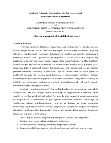 Akademia Pedagogiki Specjalnej im. Marii Grzegorzewskiej Uniwersytet Mikołaja Kopernika IX Interdyscyplinarna Konferencja Naukowa z cyklu CZŁOWIEK I ŚWIAT – WYMIARY ODPOWIEDZIALNOŚCI poświęcona tematowi: Etyczne wyzwania idei wielokulturowości Szanowni Państwo, Kwestie kulturowej tożsamości odgrywają coraz większą rolę w kształtowaniu się współczesnego świata. Proces określania etycznych podstaw owej tożsamości zdaje się jednym z najsilniejszych czynników kształtujących współczesną politykę europejską i stawiających wielki znak zapytania nad jej przyszłością. Na naszych oczach rozgrywa się najgłębszy w dziejach powojennej Europy kryzys relacji międzykulturowych. Idea wspólnoty ludzi różniących się kulturową tożsamością a zjednoczonych wspólną wizją godnego życia, stanowiąca jeden z etycznych filarów funkcjonowania Unii Europejskiej, zostaje obecnie poddana radykalnej kontestacji. Koniecznym staje się zadanie sobie na nowo pytania o możliwość istnienia tak zróżnicowanej kulturowo i aksjologicznie wspólnoty. Reakcje Europejczyków towarzyszące napływowi do Europy uchodźców i imigrantów skłaniają do refleksji nad podstawami myślenia o relacjach międzykulturowych, tolerancji, statusie wartości etycznych i europejskim etosie. Co dalej z multikulturalizmem? Czy multikulturalizm to przeszłość czy przyszłość Europy? Jaka jest rola dialogu międzykulturowego w negocjowaniu i ustalaniu zasad współżycia przedstawicieli różnych kultur? Czy wszelka silna tożsamość kulturowa prowadzi do nacjonalizmu i ksenofobii? W jaki sposób kolonialna przeszłość oddziałuje na współczesną sytuację międzynarodową i wpływa na dyskusje na temat tożsamości kulturowej? Czy Europa Środkowa ma do zaproponowania pozytywny program rozwiązania aktualnych problemów Unii Europejskiej? Czy wybór wartości kulturowych to fundament tożsamości ludzkości w XXI wieku? Zapraszamy do dyskusji. Proponujemy następującą (otwartą listę) zagadnień: 1. Podstawy teoretyczne debaty o tożsamości kulturowej. 2. Wielokulturowość - definicja, charakter, perspektywy zjawiska. 3. Znaczenie, rola i konsekwencje relatywizmu kulturowego dla obecnego kryzysu. 4. Kontrowersje wokół Islamu we współczesnej kulturze, mediach, życiu społecznym i politycznym. 5. Rola kolonializmu i dekolonializacji w kształtowaniu formuł tożsamości kulturowej oraz w formułowaniu teoretycznych i etycznych podstaw zrównoważonego rozwoju. 6. Różnice kulturowe a standardy moralne: w poszukiwaniu powszechnika etycznego. Zapraszamy Państwa do udziału w kolejnej IX Interdyscyplinarnej Konferencji „Człowiek i świat – wymiary odpowiedzialności” organizowanej przez Zakład Filozofii Moralności i Etyki Globalnej Akademii Pedagogiki Specjalnej im. Marii Grzegorzewskiej w Warszawie oraz Zakład Etyki Uniwersytetu Mikołaja Kopernika w Toruniu. Miejsce konferencji: Akademia Pedagogiki Specjalnej w Warszawie, ul. Szczęśliwicka 40. Termin konferencji: 20 maja 2016 r. Formularz zgłoszeniowy wraz z abstraktem należy przesłać do 20.03.2016 r. na adres [email protected]. Informację o zakwalifikowaniu Państwa wystąpienia do wygłoszenia na konferencji przekażemy Państwu do dnia 30.03.2016 r. Opłatę w wysokości 200 zł należy przesłać na konto nr 03 1060 0076 0000 3210 0017 5993 z dopiskiem: Konferencja: Człowiek i świat, imię i nazwisko uczestnika do dnia 30.04.2016 r. Nadawcą przelewu powinna być instytucja lub osoba, na którą należy wystawić fakturę. Pozytywnie zrecenzowane artykuły związane z tematyką wygłoszonych referatów mogą zostać opublikowane w czasopiśmie „Studies in Global Ethics and Global Education”, http://sgege.aps.edu.pl/. Tekst przygotowany do publikacji, w rozmiarze od 20 000 do 40 000 znaków typograficznych (ze spacjami), można przesłać: w I terminie - do 30 kwietnia lub w II terminie do 30 czerwca na adres: [email protected]. Preferujemy teksty w języku angielskim. Zapraszamy do udziału. Sekretarz konferencji Komitet Programowo-Organizacyjny: dr Piotr Rosół Dr hab., prof. APS Helena Ciążela Prof. dr hab. Zbigniew Hull Dr hab. Marcin Jaranowski Prof. dr hab. Andrzej Kiepas Prof. dr hab. Andrzej Papuziński Prof. dr hab. Włodzimierz Tyburski Dr Piotr Domeracki Dr hab., prof. UMK Ryszard Wiśniewski Dr Marcin Leźnicki Dr hab. Marcin Zdrenka Dr Iwona Stachowska Dr Paweł Bernat Mgr Mateusz Kucz