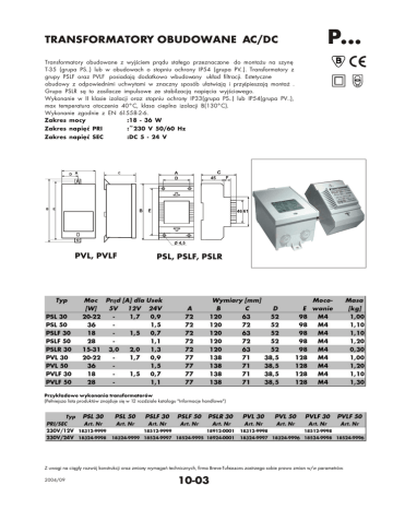TRANSFORMATORY OBUDOWANE AC/DC P... Transformatory obudowane z wyjœciem pr¹du sta³ego przeznaczone do monta¿u na szynê T-35 (grupa PS..) lub w obudowach o stopniu ochrony IP54 (grupa PV..). Transformatory z grupy PSLF oraz PVLF posiadaj¹ dodatkowo wbudowany uk³ad filtracji. Estetyczne obudowy z odpowiednimi uchwytami w znaczny sposób u³atwiaj¹ i przyœpieszaj¹ monta¿ . Grupa PSLR s¹ to zasilacze impulsowe ze stabilzacj¹ napiêcia wyjœciowego. Wykonanie w II klasie izolacji oraz stopniu ochrony IP33(grupa PS..) lub IP54(grupa PV..), max temperatura otoczenia 40°C, klasa cieplna izolacji B(130°C). Wykonanie zgodnie z EN 61558-2-6. :18 - 36 W Zakres mocy :~230 V 50/60 Hz Zakres napiêæ PRI :DC 5 - 24 V Zakres napiêæ SEC PVL, PVLF PSL, PSLF, PSLR Przyk³adowe wykonania transformatorów (Pe³niejsza lista produktów znajduje siê w 12 rozdziale katalogu "Informacje handlowe") Z uwagi na ci¹g³y rozwój konstrukcji oraz zmiany wymagañ technicznych, firma Breve-Tufvassons zastrzega sobie prawo zmian w/w parametrów. 2004/09 10-03