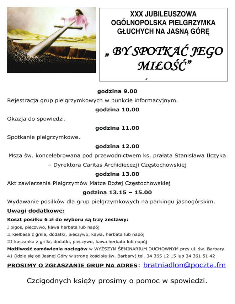 XXX JUBILEUSZOWA OGÓLNOPOLSKA PIELGRZYMKA GŁUCHYCH NA JASNĄ GÓRĘ „ BY SPOTKAĆ JEGO MIŁOŚĆ” 01 WRZEŚNIA 2012 - sobota godzina 9.00 Rejestracja grup pielgrzymkowych w punkcie informacyjnym. godzina 10.00 Okazja do spowiedzi. godzina 11.00 Spotkanie pielgrzymkowe. godzina 12.00 Msza św. koncelebrowana pod przewodnictwem ks. prałata Stanisława Iłczyka – Dyrektora Caritas Archidiecezji Częstochowskiej godzina 13.00 Akt zawierzenia Pielgrzymów Matce Bożej Częstochowskiej godzina 13.15 – 15.00 Wydawanie posiłków dla grup pielgrzymkowych na parkingu jasnogórskim. Uwagi dodatkowe: Koszt posiłku 6 zł do wyboru są trzy zestawy: I bigos, pieczywo, kawa herbata lub napój II kiełbasa z grilla, dodatki, pieczywo, kawa, herbata lub napój III kaszanka z grilla, dodatki, pieczywo, kawa herbata lub napój Możliwość zamówienia noclegów w WYŻSZYM ŚEMINARIUM DUCHOWNYM przy ul. św. Barbary 41 (idzie się od Jasnej Góry w stronę kościoła św. Barbary) tel. 34 365 12 15 lub 34 361 51 42 PROSIMY O ZGŁASZANIE GRUP NA ADRES: [email protected] Czcigodnych księży prosimy o pomoc w spowiedzi.