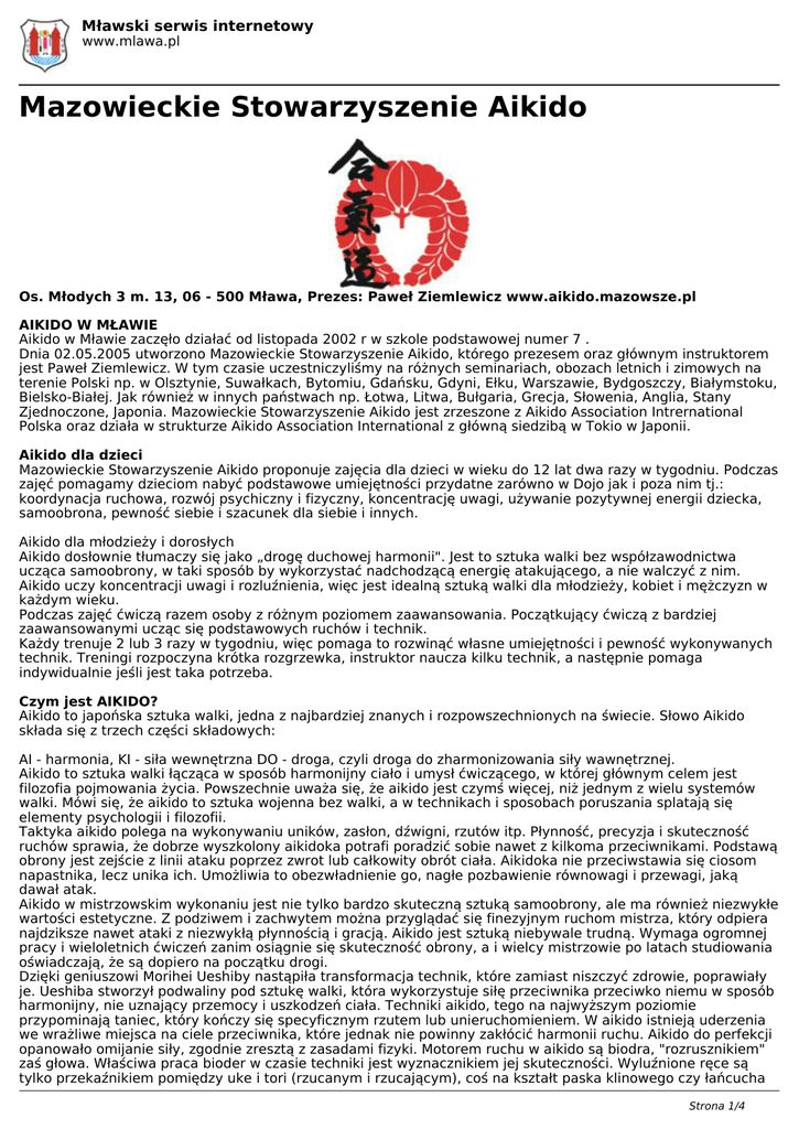 Mławski serwis internetowy www.mlawa.pl Mazowieckie Stowarzyszenie Aikido Os. Młodych 3 m. 13, 06 - 500 Mława, Prezes: Paweł Ziemlewicz www.aikido.mazowsze.pl AIKIDO W MŁAWIE Aikido w Mławie zaczęło działać od listopada 2002 r w szkole podstawowej numer 7 . Dnia 02.05.2005 utworzono Mazowieckie Stowarzyszenie Aikido, którego prezesem oraz głównym instruktorem jest Paweł Ziemlewicz. W tym czasie uczestniczyliśmy na różnych seminariach, obozach letnich i zimowych na terenie Polski np. w Olsztynie, Suwałkach, Bytomiu, Gdańsku, Gdyni, Ełku, Warszawie, Bydgoszczy, Białymstoku, Bielsko-Białej. Jak również w innych państwach np. Łotwa, Litwa, Bułgaria, Grecja, Słowenia, Anglia, Stany Zjednoczone, Japonia. Mazowieckie Stowarzyszenie Aikido jest zrzeszone z Aikido Association Intrernational Polska oraz działa w strukturze Aikido Association International z główną siedzibą w Tokio w Japonii. Aikido dla dzieci Mazowieckie Stowarzyszenie Aikido proponuje zajęcia dla dzieci w wieku do 12 lat dwa razy w tygodniu. Podczas zajęć pomagamy dzieciom nabyć podstawowe umiejętności przydatne zarówno w Dojo jak i poza nim tj.: koordynacja ruchowa, rozwój psychiczny i fizyczny, koncentrację uwagi, używanie pozytywnej energii dziecka, samoobrona, pewność siebie i szacunek dla siebie i innych. Aikido dla młodzieży i dorosłych Aikido dosłownie tłumaczy się jako „drogę duchowej harmonii". Jest to sztuka walki bez współzawodnictwa ucząca samoobrony, w taki sposób by wykorzystać nadchodzącą energię atakującego, a nie walczyć z nim. Aikido uczy koncentracji uwagi i rozluźnienia, więc jest idealną sztuką walki dla młodzieży, kobiet i mężczyzn w każdym wieku. Podczas zajęć ćwiczą razem osoby z różnym poziomem zaawansowania. Początkujący ćwiczą z bardziej zaawansowanymi ucząc się podstawowych ruchów i technik. Każdy trenuje 2 lub 3 razy w tygodniu, więc pomaga to rozwinąć własne umiejętności i pewność wykonywanych technik. Treningi rozpoczyna krótka rozgrzewka, instruktor naucza kilku technik, a następnie pomaga indywidualnie jeśli jest taka potrzeba. Czym jest AIKIDO? Aikido to japońska sztuka walki, jedna z najbardziej znanych i rozpowszechnionych na świecie. Słowo Aikido składa się z trzech części składowych: AI - harmonia, KI - siła wewnętrzna DO - droga, czyli droga do zharmonizowania siły wawnętrznej. Aikido to sztuka walki łącząca w sposób harmonijny ciało i umysł ćwiczącego, w której głównym celem jest filozofia pojmowania życia. Powszechnie uważa się, że aikido jest czymś więcej, niż jednym z wielu systemów walki. Mówi się, że aikido to sztuka wojenna bez walki, a w technikach i sposobach poruszania splatają się elementy psychologii i filozofii. Taktyka aikido polega na wykonywaniu uników, zasłon, dźwigni, rzutów itp. Płynność, precyzja i skuteczność ruchów sprawia, że dobrze wyszkolony aikidoka potrafi poradzić sobie nawet z kilkoma przeciwnikami. Podstawą obrony jest zejście z linii ataku poprzez zwrot lub całkowity obrót ciała. Aikidoka nie przeciwstawia się ciosom napastnika, lecz unika ich. Umożliwia to obezwładnienie go, nagłe pozbawienie równowagi i przewagi, jaką dawał atak. Aikido w mistrzowskim wykonaniu jest nie tylko bardzo skuteczną sztuką samoobrony, ale ma również niezwykłe wartości estetyczne. Z podziwem i zachwytem można przyglądać się finezyjnym ruchom mistrza, który odpiera najdziksze nawet ataki z niezwykłą płynnością i gracją. Aikido jest sztuką niebywale trudną. Wymaga ogromnej pracy i wieloletnich ćwiczeń zanim osiągnie się skuteczność obrony, a i wielcy mistrzowie po latach studiowania oświadczają, że są dopiero na początku drogi. Dzięki geniuszowi Morihei Ueshiby nastąpiła transformacja technik, które zamiast niszczyć zdrowie, poprawiały je. Ueshiba stworzył podwaliny pod sztukę walki, która wykorzystuje siłę przeciwnika przeciwko niemu w sposób harmonijny, nie uznający przemocy i uszkodzeń ciała. Techniki aikido, tego na najwyższym poziomie przypominają taniec, który kończy się specyficznym rzutem lub unieruchomieniem. W aikido istnieją uderzenia we wrażliwe miejsca na ciele przeciwnika, które jednak nie powinny zakłócić harmonii ruchu. Aikido do perfekcji opanowało omijanie siły, zgodnie zresztą z zasadami fizyki. Motorem ruchu w aikido są biodra, "rozrusznikiem" zaś głowa. Właściwa praca bioder w czasie techniki jest wyznacznikiem jej skuteczności. Wyluźnione ręce są tylko przekaźnikiem pomiędzy uke i tori (rzucanym i rzucającym), coś na kształt paska klinowego czy łańcucha Strona 1/4 Mławski serwis internetowy www.mlawa.pl rowerowego. Dłonie i przedramiona wykonują ruchy meguri (okrężne), które znacznie uefektywniają aikido. Aikidoka z reguły porusza się w krótkiej pozycji tzw. kamae wykonując ruchy tai sabaki, czyli zwroty i obroty ciała. Techniki aikido można podzielić na rzuty (nage waza), unieruchomienia (dźwignie - osae). Rzuty w aikido są efektem umiejętnego zmieniania dystansu (techniki rzutów irimi) oraz wykorzystania siły odśrodkowej (ura). Efekt technik aikido jest wprost "piorunujący" przy założeniu realnego, dynamicznego ataku. Ponieważ wykorzystujemy siłę ataku, trudno jest wykonać rzut przy nieudolnym, nierealnym, słabym ataku. Brak umiejętności atakowania jest głównym grzechem większości aikidoków, stąd też aikido postrzegane jest jako wyjątkowo trudna sztuka walki. Uprawiając aikido należy pamiętać o nauczeniu się właściwych ataków. Tylko one, pozwolą odczuć tori smak właściwie wykonywanej techniki. Pamiętajmy, że w aikido, sztuce defensywnej, reakcja jest wynikiem akcji. Dźwignie (osae) to bolesne skręcenia nadgarstków, uciskanie splotów nerwowych, bądź dźwignie zakładane na barki i łokcie. Aikido słynie z dźwigni nadgarstkowych, które doprowadzone do perfekcji są bardzo sku