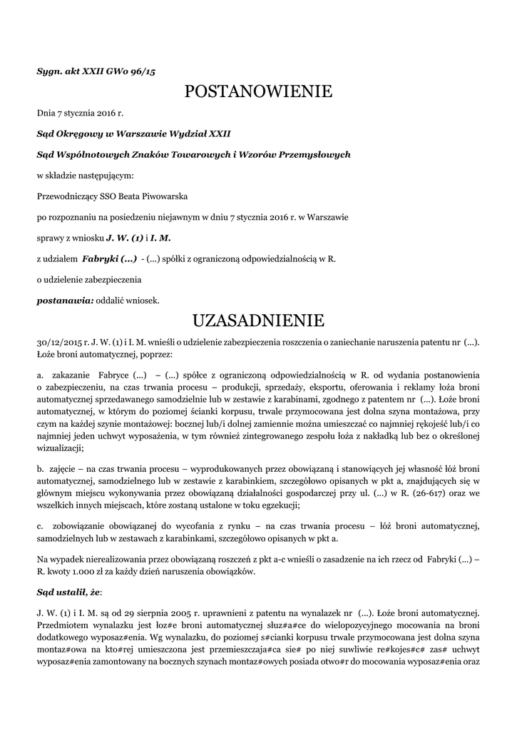 Sygn. akt XXII GWo 96/15 POSTANOWIENIE Dnia 7 stycznia 2016 r. Sąd Okręgowy w Warszawie Wydział XXII Sąd Wspólnotowych Znaków Towarowych i Wzorów Przemysłowych w składzie następującym: Przewodniczący SSO Beata Piwowarska po rozpoznaniu na posiedzeniu niejawnym w dniu 7 stycznia 2016 r. w Warszawie sprawy z wniosku J. W. (1) i I. M. z udziałem Fabryki (...) - (...) spółki z ograniczoną odpowiedzialnością w R. o udzielenie zabezpieczenia postanawia: oddalić wniosek. UZASADNIENIE 30/12/2015 r. J. W. (1) i I. M. wnieśli o udzielenie zabezpieczenia roszczenia o zaniechanie naruszenia patentu nr (...). Łoże broni automatycznej, poprzez: a. zakazanie Fabryce (...) – (...) spółce z ograniczoną odpowiedzialnością w R. od wydania postanowienia o zabezpieczeniu, na czas trwania procesu – produkcji, sprzedaży, eksportu, oferowania i reklamy łoża broni automatycznej sprzedawanego samodzielnie lub w zestawie z karabinami, zgodnego z patentem nr (...). Łoże broni automatycznej, w którym do poziomej ścianki korpusu, trwale przymocowana jest dolna szyna montażowa, przy czym na każdej szynie montażowej: bocznej lub/i dolnej zamiennie można umieszczać co najmniej rękojeść lub/i co najmniej jeden uchwyt wyposażenia, w tym również zintegrowanego zespołu łoża z nakładką lub bez o określonej wizualizacji; b. zajęcie – na czas trwania procesu – wyprodukowanych przez obowiązaną i stanowiących jej własność łóż broni automatycznej, samodzielnego lub w zestawie z karabinkiem, szczegółowo opisanych w pkt a, znajdujących się w głównym miejscu wykonywania przez obowiązaną działalności gospodarczej przy ul. (...) w R. (26-617) oraz we wszelkich innych miejscach, które zostaną ustalone w toku egzekucji; c. zobowiązanie obowiązanej do wycofania z rynku – na czas trwania procesu – łóż broni automatycznej, samodzielnych lub w zestawach z karabinkami, szczegółowo opisanych w pkt a. Na wypadek nierealizowania przez obowiązaną roszczeń z pkt a-c wnieśli o zasadzenie na ich rzecz od Fabryki (...) – R. kwoty 1.000 zł za każdy dzień naruszenia obowiązków. Sąd ustalił, że: J. W. (1) i I. M. są od 29 sierpnia 2005 r. uprawnieni z patentu na wynalazek nr (...). Łoże broni automatycznej. Przedmiotem wynalazku jest łoże broni automatycznej służȧce do wielopozycyjnego mocowania na broni dodatkowego wyposażenia. Wg wynalazku, do poziomej ṡcianki korpusu trwale przymocowana jest dolna szyna montażowa na ktȯrej umieszczona jest przemieszczajȧca siė po niej suwliwie rėkojeṡċ zaṡ uchwyt wyposażenia zamontowany na bocznych szynach montażowych posiada otwȯr do mocowania wyposażenia oraz ṡrubė wkrėcanȧ w dolnȧ nagwintowanȧ czėṡċ uchwytu wyposażenia. Na każdej szynie montażowej: bocznej lub/i dolnej zamiennie jest umieszczona co najmniej rėkojeṡċ lub/i co najmniej jeden uchwyt wyposażenia. P.̇enie uchwytȯw wyposażenia jak rȯwnież rėkojeṡci jest wzajemnie zamienne. Nadto, w przypadku zajṡcia takiej potrzeby, na każdej dowolnie wybranej lub kilku jednoczeṡnie szynach montażowych, sȧ montowane w dowolnych zestawieniach niezbėdne elementy wyposażenia jak np.: latarka, celownik laserowy, wskażnik laserowy, podṡwietlacz celȯw podczerwieni łȧcznie z rėkojeṡciȧ. S. mocowanie oraz blokada położenia, pozwala na umieszczenie rėkojeṡci na dowolnie wybranej szynie montażowej, rȯwnież bocznej, jak rȯwnież dokładne dopasowanie jej położenia do budowy fizycznej osoby trzymajȧcej broṅ. fig. 1 fig. 2 Przedmiot wynalazku jest uwidoczniony w przykładzie wykonania na rysunku na ktȯrym fig. 1 przedstawia łoże z zamontowanȧ rėkojeṡciȧ i jednym uchwytem wyposażenia w widoku z boku a fig. 2 łoże w przekroju osiowym A-A. Do poziomej ṡcianki korpusu 1 łoża, trwale przymocowana jest dolna szyna montażowa 2 na ktȯrej umieszczona jest przemieszczajȧca siė po niej suwliwie rėkojeṡċ 3. Rėkojeṡċ 3 blokowana jest przy pomocy wkrėcanego do obudowy 4 rėkojeṡci 3 trzpienia 5 z gwintem 6 i uszczelkȧ 7, zakoṅczonego w gȯrnej czėṡci bolcem 8, ktȯry przy blokowaniu wsuwa siė w wybrania 14 szyn montażowych 2 i 11, umieszczonego wspȯłosiowo wewnȧtrz rėkojeṡci 3. W przypadku zgubienia trzpienia 5, rėkojeṡċ 3 blokowana jest rȯwnież przy pomocy przelotowego otworu 9 wykonanego w gȯrnej czėṡci obudowy 4 rėkojeṡci 3, przez umieszczenie w otworze 9 dowolnego elementu blokujȧcego jak: drut, prėt itp. Uszczelka 7 zabezpiecza od dołu rėkojeṡċ 3 zapobiegajȧc przedostawa-niu siė do jej ṡrodka zanieczyszczeṅ, wody itp. co w przypadku opadȯw, warunkȯw polowych ma istotne znaczenie. Uchwyt wyposażenia 10 zamontowany na szynach montażowych 11 posiada otwȯr 12 do mocowania wyposażenia. Wkrėcenie moletowanej ṡruby 11 w dolnȧ nagwintowanȧ czėṡċ uchwytu wyposażenia 10 powoduje zamocowanie elementu wyposażenia umieszczonego w otworze 12 oraz analogicznie odwrotnie. Suwliwe mocowanie rėkojeṡci 3 oraz uchwytȯw wyposażenia 10 pozwala na precyzyjne ustawienie każdego z tych elementȯw. Łoże broni automatycznej składajȧce siė z korpusu o kształcie litery U do bocznych ṡcianek ktȯrego, trwale przymocowane sȧ boczne szyny montażowe na ktȯrych suwliwie mocowane sȧ uchwyty wyposażenia oraz rėkojeṡci blokowanej przy pomocy wkrėcanego do jej obudowy trzpienia z gwintem i uszczelkȧ zakoṅczonego w gȯrnej czėṡci bolcem lub blokowanej przy pomocy przelotowego otworu wykonanego w gȯrnej czėṡci rėkojeṡci, znamienne jest tym, że do poziomej ṡcianki korpusu /1/ trwale przymocowana jest dolna szyna montażowa /2/ na ktȯrej umieszczona jest przemieszczajȧca siė po niej suwliwie rėkojeṡċ /3/ zaṡ uchwyt wyposażenia /10/ zamontowany na bocznych szynach montażowych /11/ posiada otwȯr /12/ do mocowania wyposażenia oraz ṡrubė /13/ wkrėcanȧ w dolnȧ nagwintowanȧ czėṡċ uchwytu wyposażenia /1