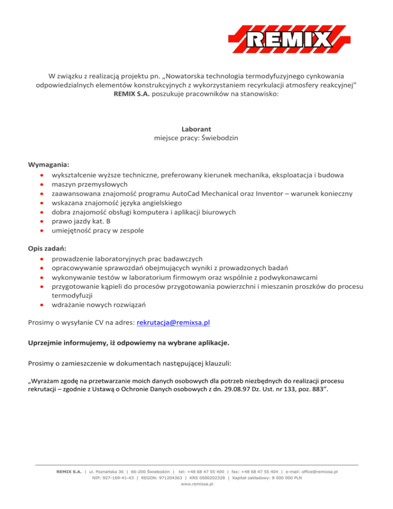 W związku z realizacją projektu pn. „Nowatorska technologia termodyfuzyjnego cynkowania odpowiedzialnych elementów konstrukcyjnych z wykorzystaniem recyrkulacji atmosfery reakcyjnej” REMIX S.A. poszukuje pracowników na stanowisko: Laborant miejsce pracy: Świebodzin Wymagania: · wykształcenie wyższe techniczne, preferowany kierunek mechanika, eksploatacja i budowa · maszyn przemysłowych · zaawansowana znajomość programu AutoCad Mechanical oraz Inventor – warunek konieczny · wskazana znajomość języka angielskiego · dobra znajomość obsługi komputera i aplikacji biurowych · prawo jazdy kat. B · umiejętność pracy w zespole Opis zadań: · prowadzenie laboratoryjnych prac badawczych · opracowywanie sprawozdań obejmujących wyniki z prowadzonych badań · wykonywanie testów w laboratorium firmowym oraz wspólnie z podwykonawcami · przygotowanie kąpieli do procesów przygotowania powierzchni i mieszanin proszków do procesu termodyfuzji · wdrażanie nowych rozwiązań Prosimy o wysyłanie CV na adres: [email protected] Uprzejmie informujemy, iż odpowiemy na wybrane aplikacje. Prosimy o zamieszczenie w dokumentach następującej klauzuli: „Wyrażam zgodę na przetwarzanie moich danych osobowych dla potrzeb niezbędnych do realizacji procesu rekrutacji – zgodnie z Ustawą o Ochronie Danych osobowych z dn. 29.08.97 Dz. Ust. nr 133, poz. 883”.