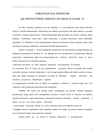 Szkoła Podstawowa im. Władysława Broniewskiego we Władysławowie PUBLIKACJA DLA RODZICÓW JAK PRZYGOTOWAĆ DZIECKO DO NAUKI W KLASIE IV Za kilka miesięcy zakończy się rok szkolny, a z nim pierwszy etap nauki Państwa dzieci w szkole podstawowej. Pamiętamy jak wielkim przeżyciem dla całej rodziny, a przede wszystkim „świeżo upieczonych” pierwszoklasistów były początki ich kariery szkolnej. Nowi koledzy i koleżanki, nowa pani, nowe otoczenie, a przede wszystkim nowe obowiązki sprawiały, że niektórzy w tym początkowym okresie przeżywali pewne kłopoty, które przy życzliwym wsparciu rodziców i nauczycieli minęły bezpowrotnie. Nauka w klasach I – III jest łagodnym przejściem od wychowania przedszkolnego do edukacji prowadzonej w klasach IV – VI, dlatego też nie ma podziału na przedmioty. Metody nauczania i organizacja zajęć też przypominają ten radosny, beztroski okres w życiu dzieci. Ocenianie ma charakter opisowy i właściwie nie niesie ze sobą żadnych przykrych konsekwencji. To sprawia, że uczniowie klas III czują się już prawdziwymi uczniami, którzy wszystko lub prawie wszystko wiedzą o szkole. Większość z nich osiąga bardzo dobre lub dobre wyniki w nauce, więc bez obaw oczekuje na przejście do klasy IV. Niekiedy jednak pierwsze dni września przynoszą niepokojące sygnały w osiągnięciach uczniów klas IV. Budzi to niepokój w zarówno u samych dzieci jak i ich rodziców. Jakie mogą być przyczyny tych kłopotów? Problem ten warto już dzisiaj sobie uświadomić, by pomóc dziecku łagodnie przekroczyć próg, jakim jest niewątpliwie przejście z klasy III do IV. Zmienia się bowiem sposób nauczania i jego organizacja, wymagania stawiane uczniom, zasady oceniania, a także co jest nie mniej ważne – otoczenie i nauczyciele. Pozostaje jednak to samo dziecko, które tak chętnie uczyło się i osiągało sukcesy. Spróbujmy więc wspólnie ustalić ich źródło, by pomoc dziecku odnaleźć się w nowej dla niego rzeczywistości szkolnej. Często bywa tak, że dzieci w klasach młodszych , a przynajmniej Opracowała: mgr Sławomira Urzędowska 1 Szkoła Podstawowa im. Władysława Broniewskiego we Władysławowie w początkowym okresie uczą się, bo interesuje je wszystko co wiąże się ze szkołą, a także dlatego, że chcą przypodobać się swojej pani, która jest dla nich niekwestionowanym autorytetem. Wynika to z tego, że większość zajęć dydaktycznych dzieci maja z jedną nauczycielką, która bardzo dobrze zna swoich uczniów i stara się dostosowywać wymagania do ich możliwości, tak by każdy z nich mógł osiągnąć sukces., a w przypadku trudności pomaga na bieżąco w ich pokonywaniu. W klasie IV każdego przedmiotu uczą inni nauczyciele, którzy różnią się między sobą sposobem bycia, wymaganiami. Może to wpłynąć na osiągnięcia niektórych dzieci, szczególnie tych mniej odpornych na stres. Musi więc upłynąć trochę czasu zanim nauczyciele i uczniowie poznają się wzajemnie i nabiorą do siebie zaufania. Ważne są więc w tym okresie częste rozmowy rodziców z dziećmi nie tylko na temat osiągnięć czy stopni, jakie otrzymały, ale tez tego co było na lekcjach, jak radziły sobie w różnych sytuacjach, jakie przynosi codzienny pobyt w szkole. Mądre rozmowy wspierające dziecko, z pewnością pomogą mu w nabraniu pewności siebie i szybkim zaaklimatyzowaniu się w nowym dla niego środowisku. Dziecko znów poczuje się ważne wraz ze swoimi problemami, tak jak to było w pierwszych dniach nauki w szkole. Rodzice powinni pamiętać o tym, by w czasie tych rozmów unikać krytykowania nauczycieli, gdyż często bywa tak, że dziecko przestraszone nową dla siebie sytuacją, z którą nie zawsze może sobie od razu poradzić, pewne zdarzenia wyolbrzymia. Trudno jest więc obiektywnie w domu ustalić przebieg wydarzeń, a negatywny obraz nauczyciela, jaki może wtedy powstać, poparty autorytetem rodziców, może utrudniać dziecku normalne funkcjonowanie w szkole. Aby złagodzić problemy, jakie mogą przynieść pierwsze miesiące nauki klasie IV, rodzice powinni już w klasie III na dobre opanowanie przez ich dzieci wiadomości i umiejętności określonych w programie nauczania, jako konieczne dla ucznia kończącego naukę w klasach młodszych. Wszelkie luki w wiedzy i umiejętnościach będą powodowały trudności w przyswojeniu nowego materiału. Na uzupełnienie braków nie będzie już czasu. Już teraz można wspólnie z dzieckiem organizować szereg zabaw, które dadzą szansę powtórzenia całego materiału. Można tez zachęcać do poszukiwania informacji poszerzających wiedzę na określony temat. Pomocne Opracowała: mgr Sławomira Urzędowska 2 Szkoła Podstawowa im. Władysława Broniewskiego we Władysławowie tu będą zarówno zgromadzone w domu książki, jak i umiejętne korzystanie z komputera. Zdobyte w ten sposób wiadomości, jak również umiejętność ich pozyskiwania, z pewnością przydadzą się w klasach starszych. Zachęcajmy też dziecko do czytania dłuższych tekstów, a następnie do wskazywania w nich najistotniejszych informacji czy pisemnego formułowania odpowiedzi na postawione przez nas pytania. Jest to bardzo ważne i przydatne, gdy trzeba z lekcji na lekcję przygotować się z historii, przyrody, czy języka polskiego. Początek klasy IV to również trudny dla dzieci czas ze względu na zmiany zachodzące w ich rozwoju. Wchodzą one bowiem w okres dojrzewania, stają się podatne na gwałtowne zmiany nastroju i przykre doznania emocjonalne. Rodzice powinni uważnie obserwować tez grono kolegów koleżanek swoich dzieci. Mogą dyskretnie, bez narzucania, zainteresować ich tymi rówieśnikami, których wpływ byłby szczególnie korzystny. Dotyczy to zwłaszcza rówieśników przejawiających zainteresowania, które mogą być przez nich naśladowane. Ważne jest tez, by umiały nawiązać i podtrzymywać pozytywne stosunki z o